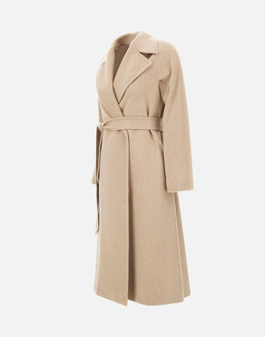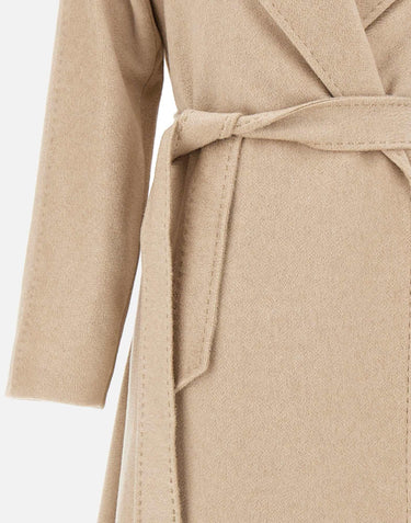 Max Mara Studio "Umido" cashmere coat, ecru colour, wide collar with lapel, robe model with self-tie belt, visible stitching, side welt pockets, regular fit. Made in Italy.