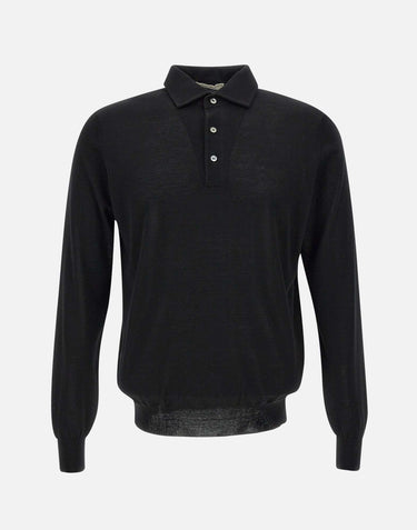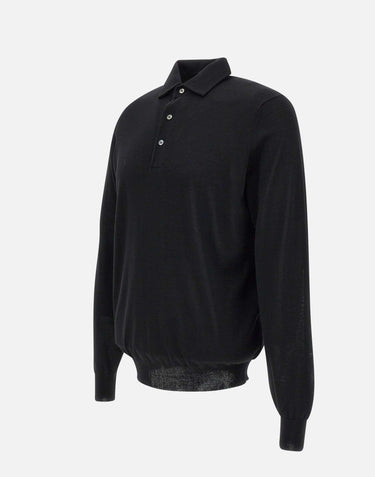 Filippo De Laurentiis men's 120's superfine royal merino beaten wool polo shirt, black colour, ultra-comfortable fabric to touch and to wear, long sleeves, classic collar, tone-on-tone button closure, ribbed hems, regular fit. Made in Italy.