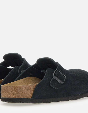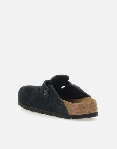 Birkenstock Boston BS sandals, color black, suede upper, suede insole, anatomical cork and latex footbed, strap with tone-on-tone logoed and adjustable buckle, Eva sole. Narrow fit as company website indication.