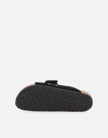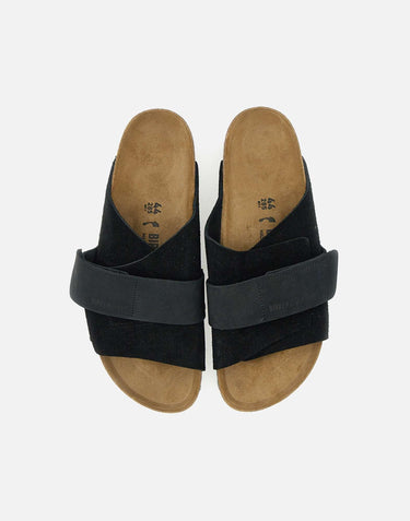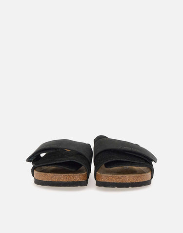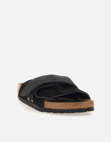 Birkenstock "Kyoto" black colour model inspired by classic Zürich compact design suede leather combined with nubuck leather sandals, adjustable velcro closure, decorative rivets, anatomical cork and latex footbed, suede footbed, rubber sole EVA, narrow fit, we recommend one size larger than usual.