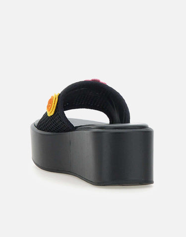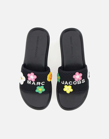"The Daisy Crochet Platform Sandal" Marc Jacobs, black, mesh upper with multicolor three-dimensional crochet flower application, 6 cm high rubber platform sole, leather insole, slip on model, wide fit, we recommend choosing a smaller size.