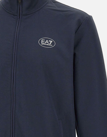 EA7 "Core Identity" sweatshirt in blue technical fabric with a jacket-like effect. Featuring a hood, Ventus7 Collection, zip fastening, and side welt pockets. Ribbed collar and elastic cuffs for added comfort. EA7 logo on chest. Regular fit, ideal for sporty and casual looks.