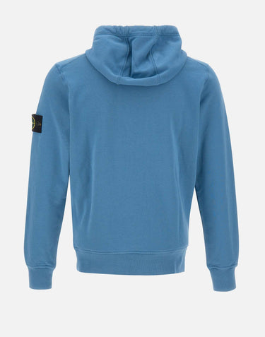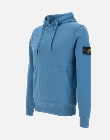 Stone Island men's "Organic Cotton Fleece" sweatshirt, light blue, made from organic cotton with a brushed interior and garment-dyed finish. It features an adjustable drawstring hood, visible overlock stitching, a kangaroo pocket with slanted openings, and the iconic logo badge on the left sleeve. A lined panel under the back neckline, and elasticated ribbed cuffs and hem are featured. Regular fit, ideal for a casual, contemporary look.