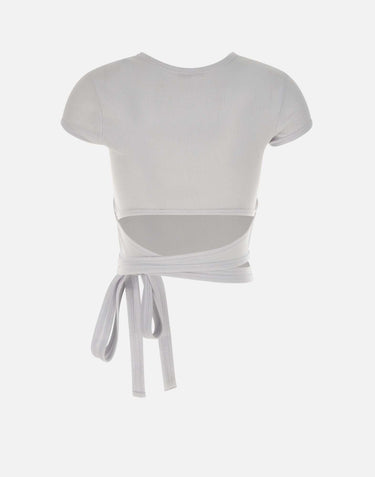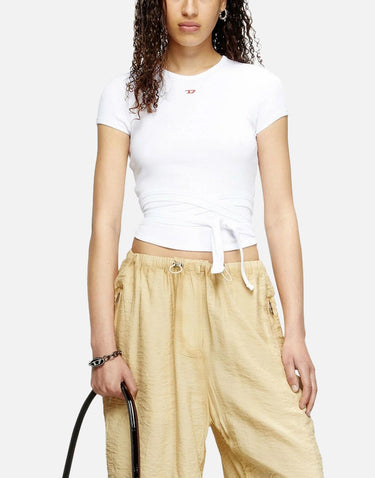 Diesel stretch cotton "T-bunny-tail", white, stretch cotton, short sleeves, crew neck, embroidered oval D logo on front, ribbed texture, bands that tie around body, slim fit
