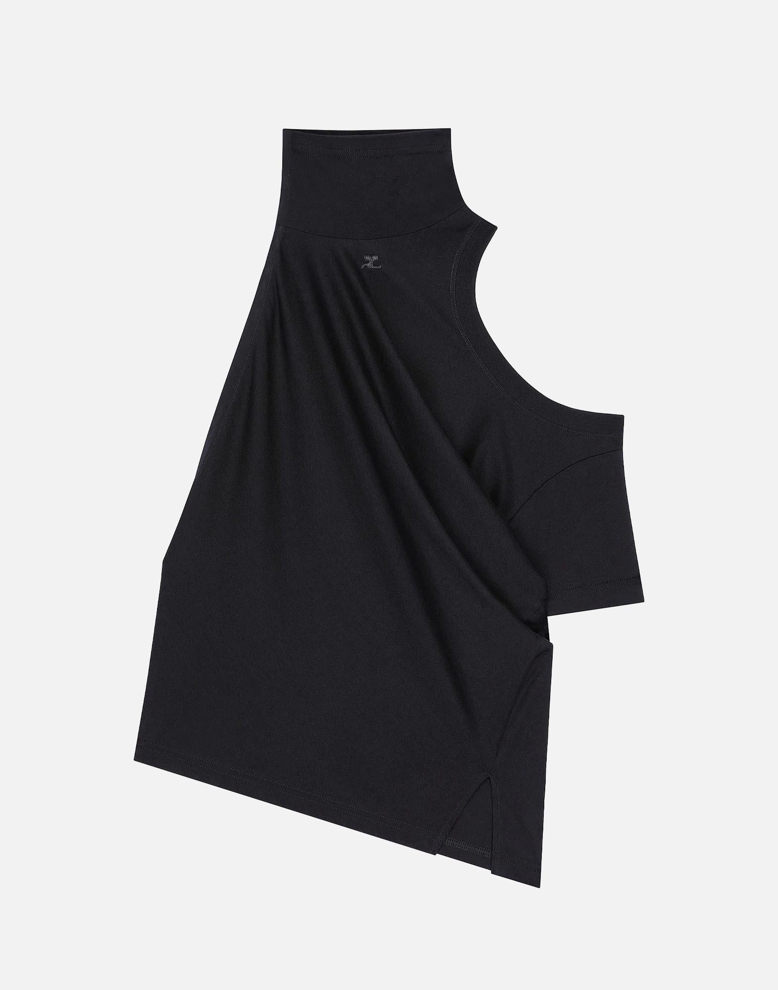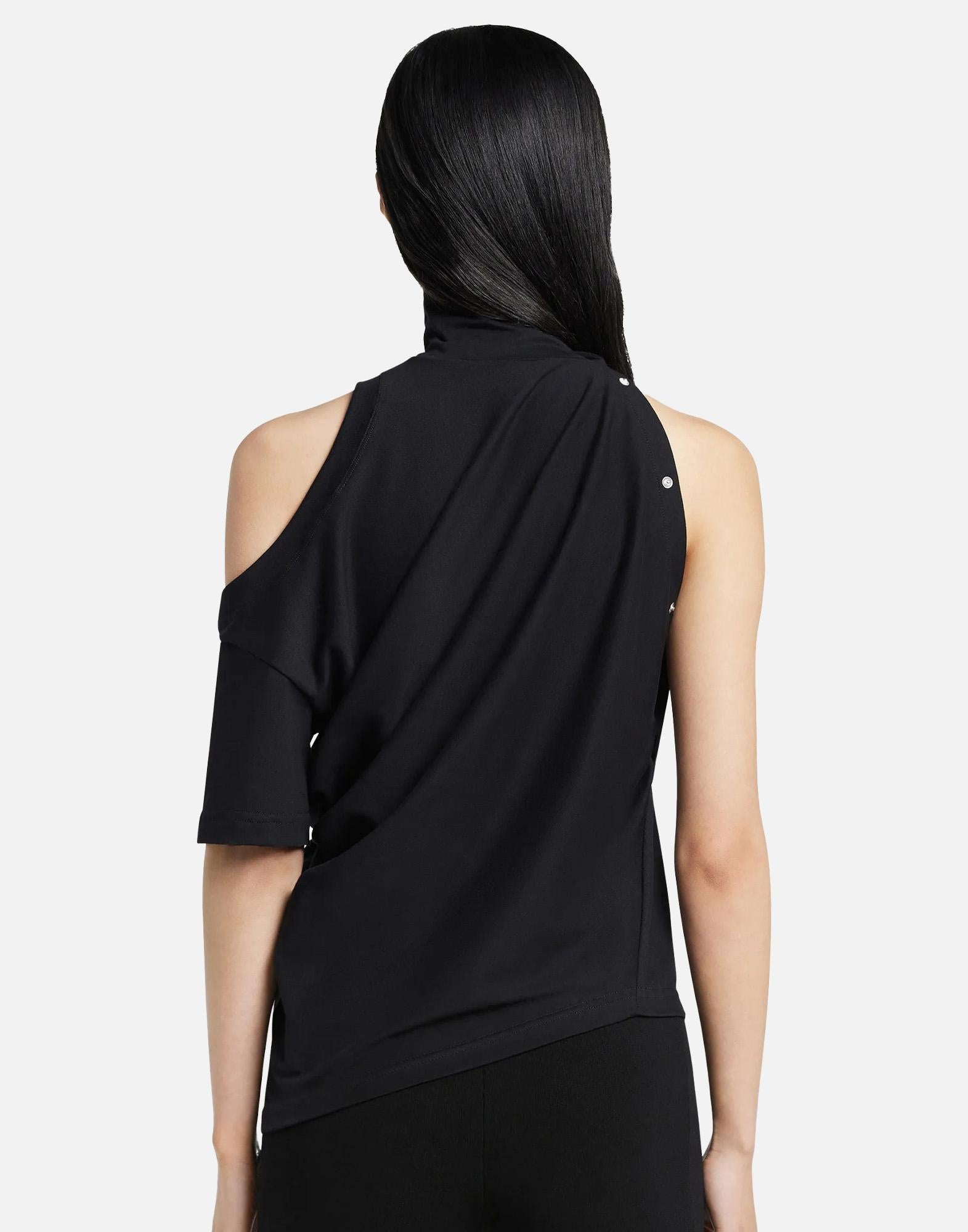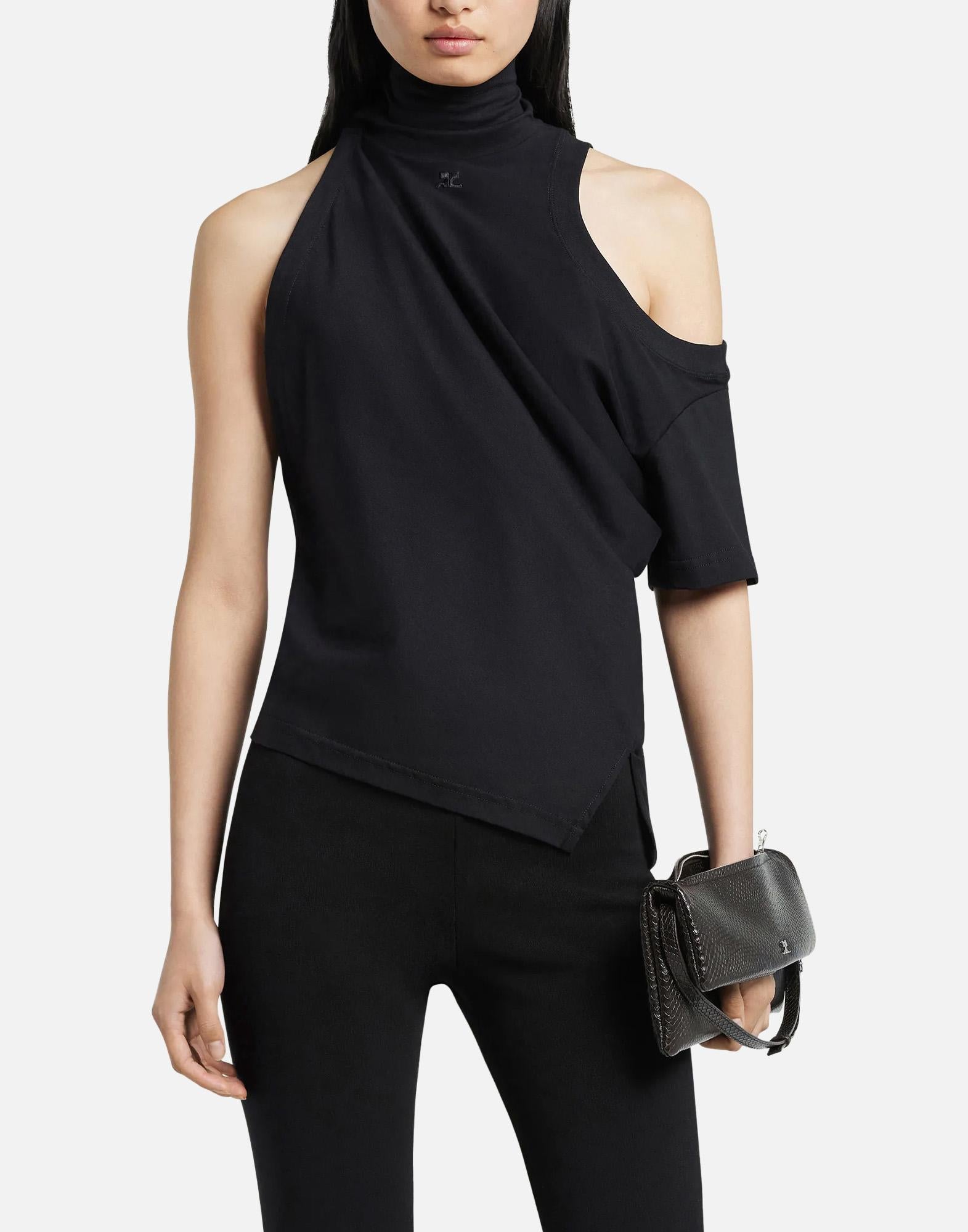 Courrèges "Twisted Jersey" T-shirt in black cotton jersey. Asymmetrical design, short sleeves, and a side insert with snap buttons. Finished with a slit at the bottom and a mini embroidered logo on the chest. Regular fit.