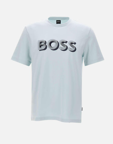 Men’s Boss "H-Thompson" t-shirt from Boss Black line, crafted soft cotton and presented in a refined pastel light blue shade. The design features short sleeves, a crew neckline, and a bold front logo print, finished with a side logo label at hem. Regular fit for a casual yet sophisticated look.