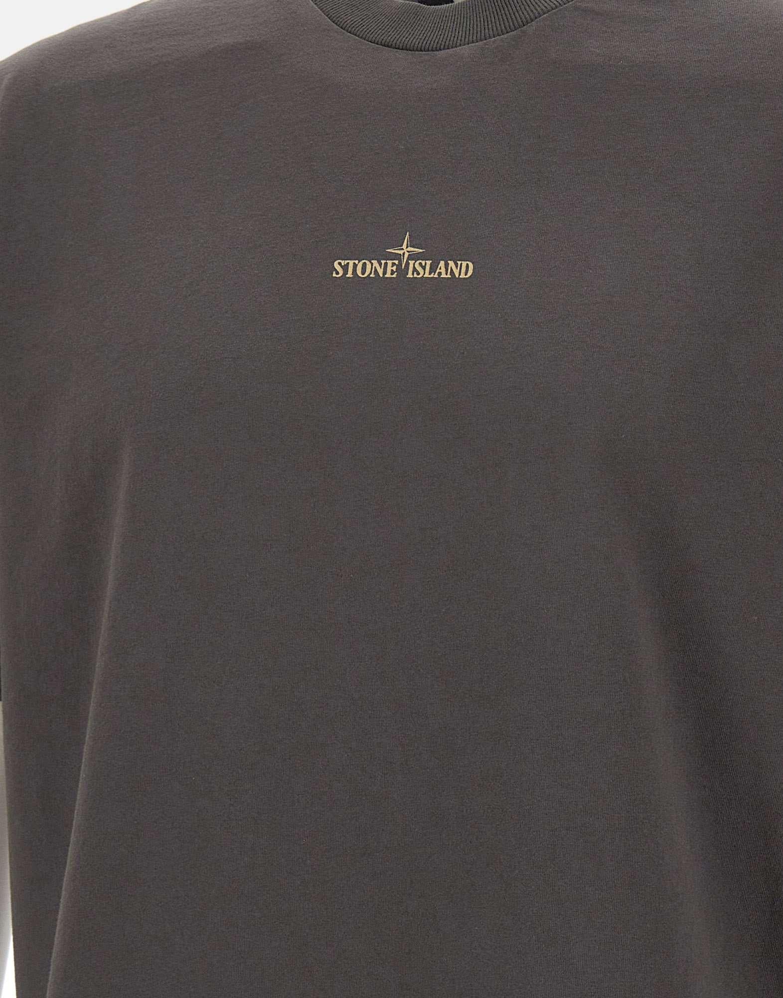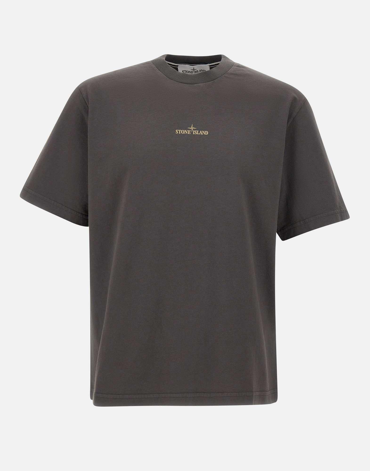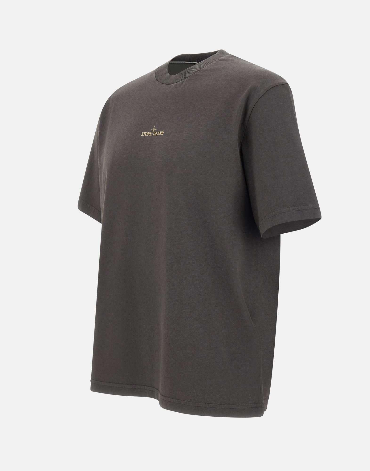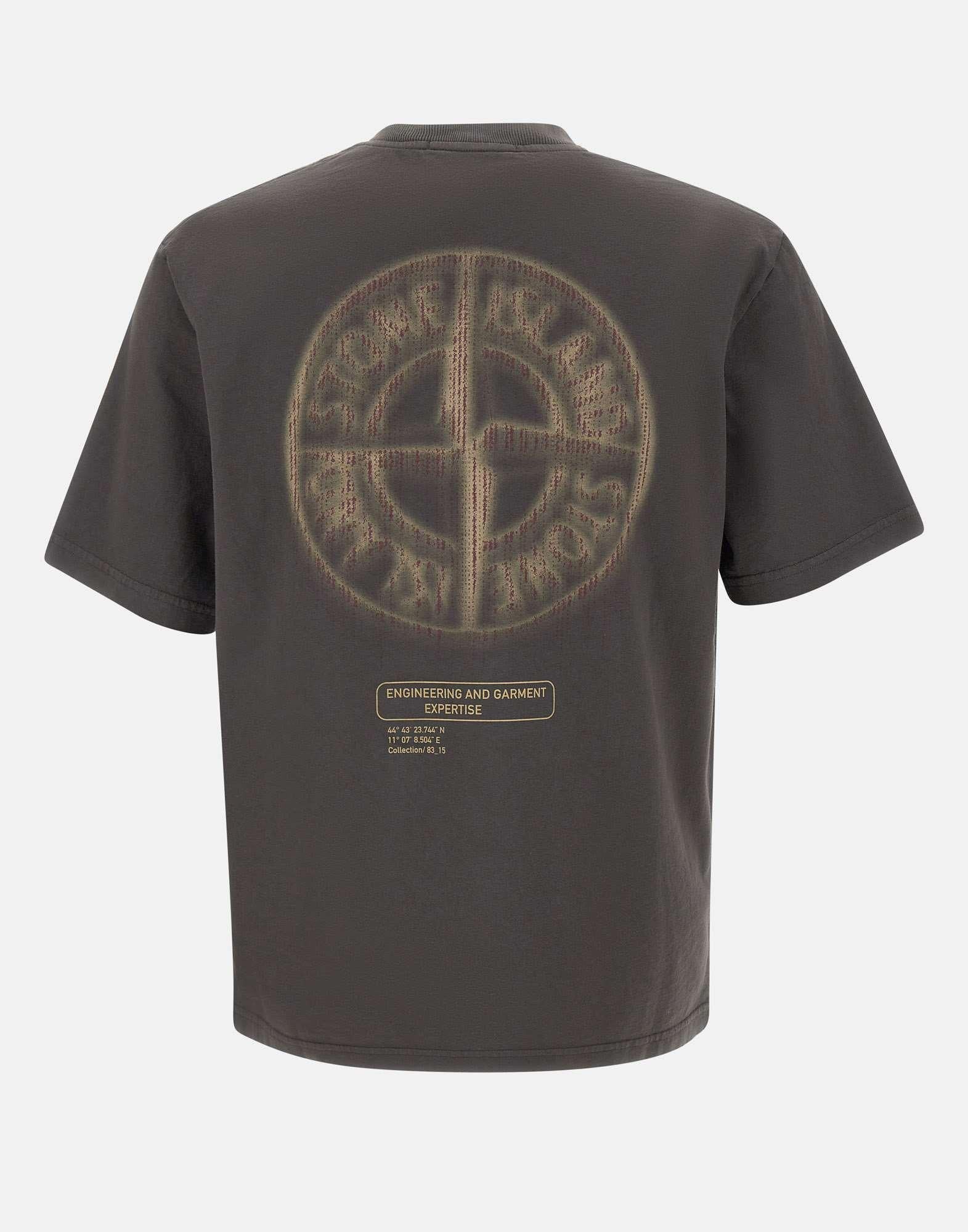 Stone Island mens T-shirt in combed organic cotton jersey, lead grey color, finished with the brands signature garment-dyeing technique. Features short sleeves, crew neck, logo print on the chest, and Bleeding Numbers Compass graphic on the back. Regular fit. Machine wash at max 30°C.