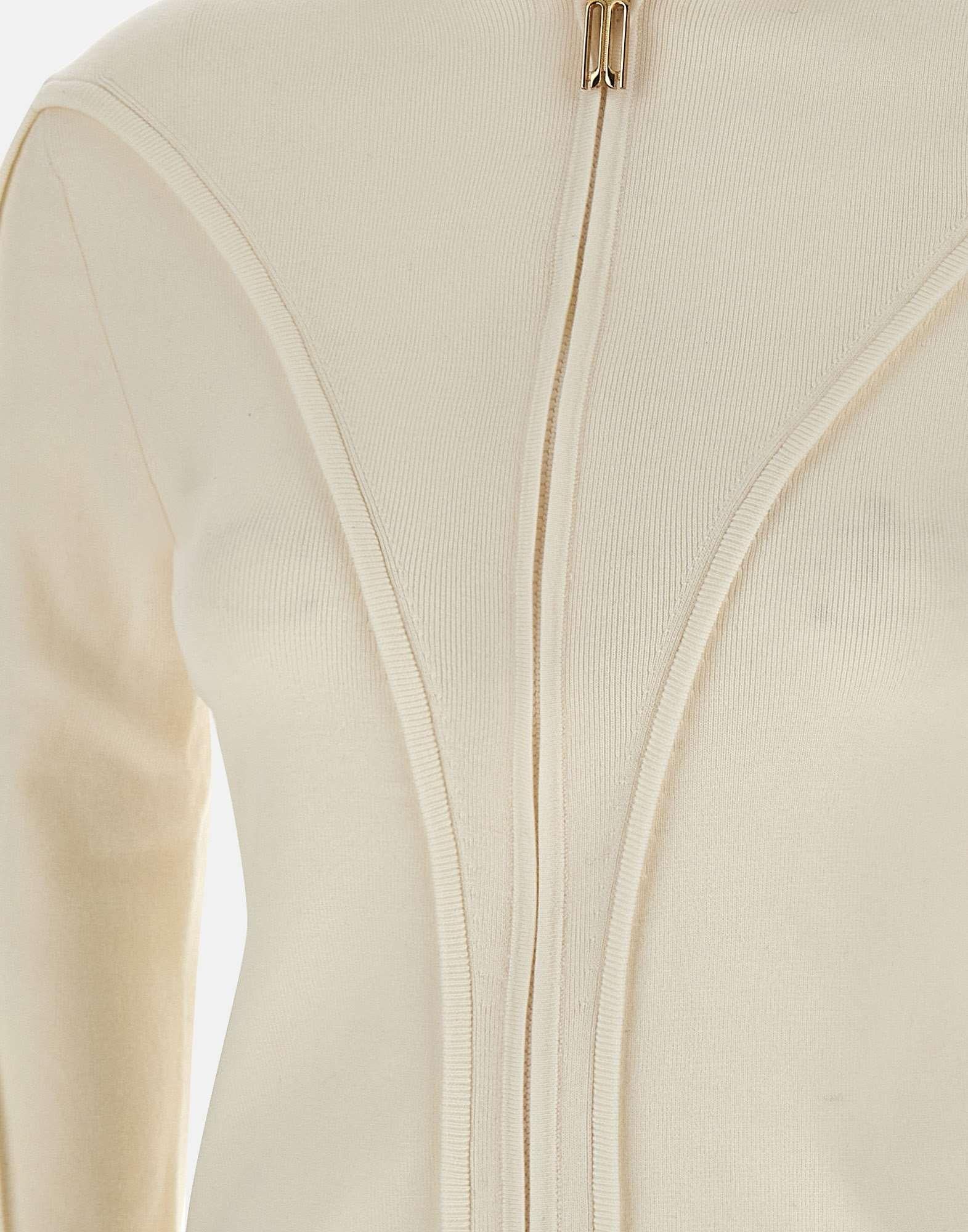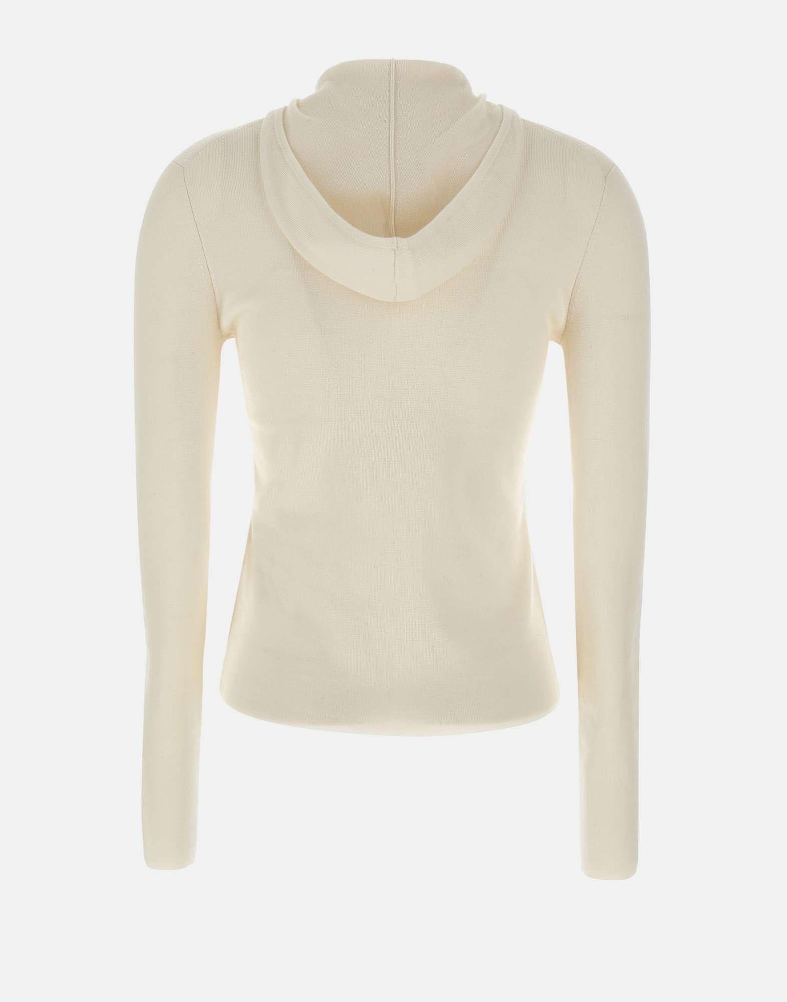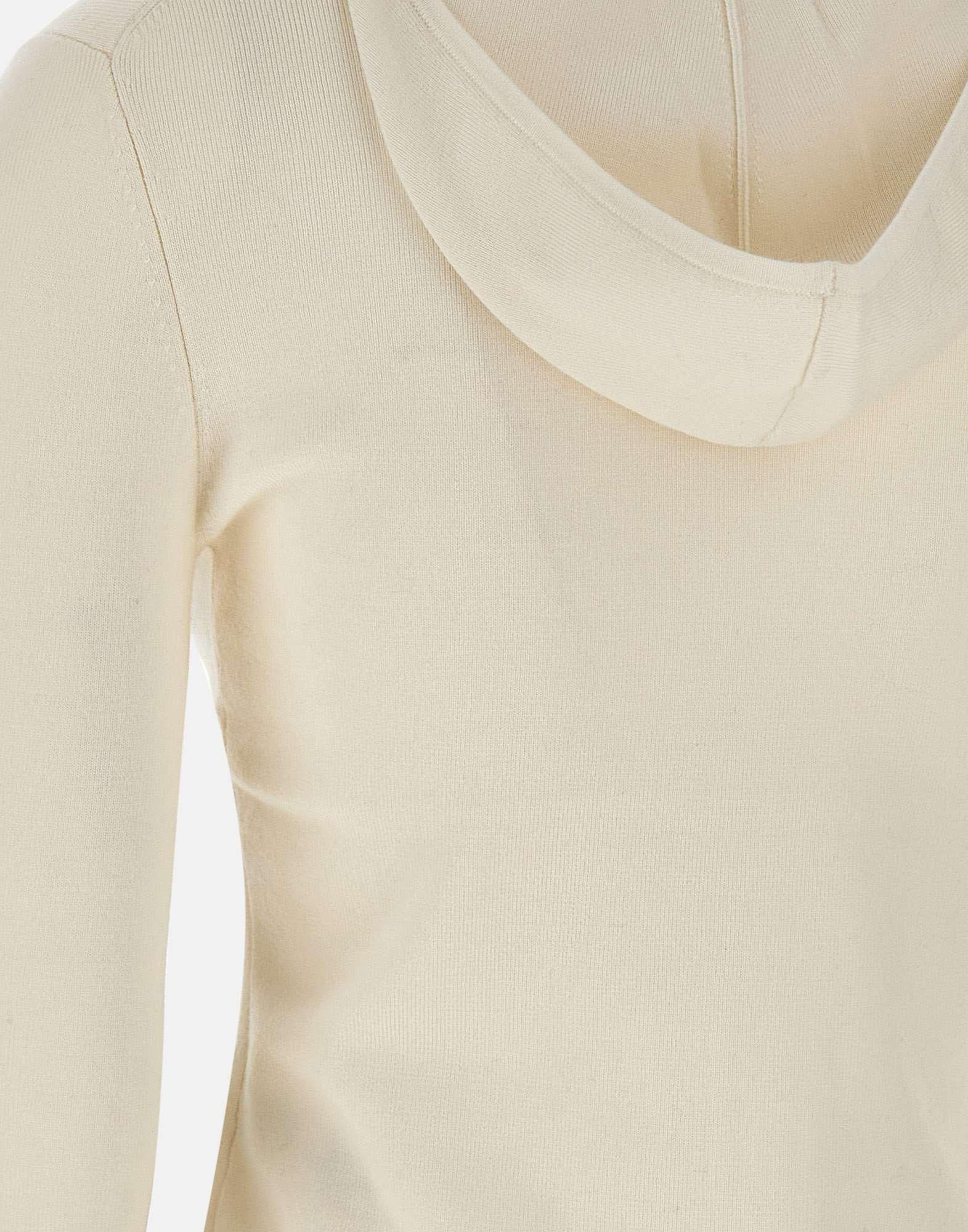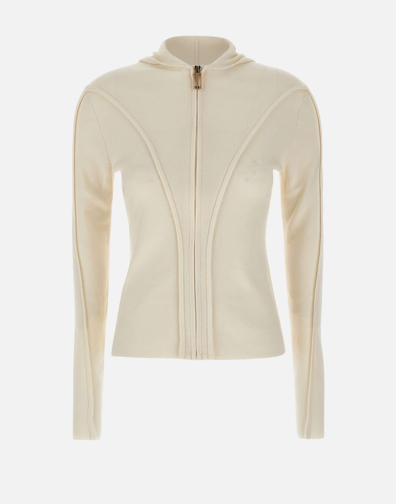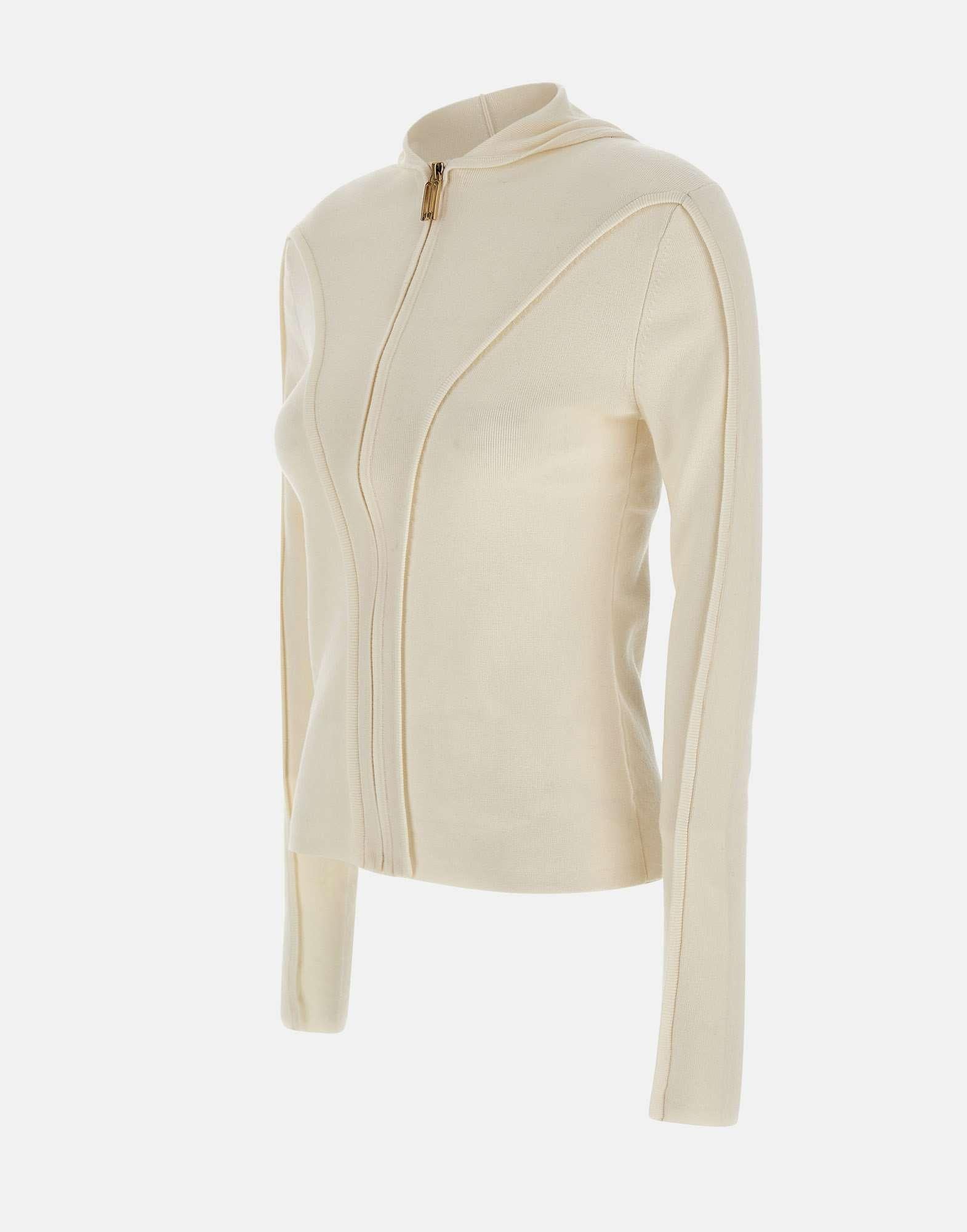 Cardigan Victoria Beckham "Fine Merino cardigan" in maglia fine di lana elasticizzata color panna. Caratterizzato da taglio dritto, cappuccio e chiusura frontale con zip impreziosita da metalleria dorata con logo. Maniche lunghe. Vestibilità slim che segue la silhouette. Lunghezza 56 cm e maniche da 63 cm (taglia S).