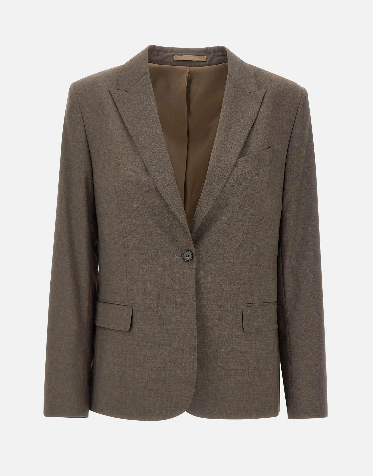 "Sasha cool wool blazer" Filippa K donna, in tessuto di lana merino di medio peso, colore tortora intenso, dal taglio regular fit. Design aderente con collo rever a lancia, chiusura con bottone singolo, tasche anteriori con pattina e taschino portapochette. Dettagli sartoriali come polsini con bottoni, spalline imbottite e spacco centrale sul retro. Completamente foderato per una vestibilità confortevole e strutturata.