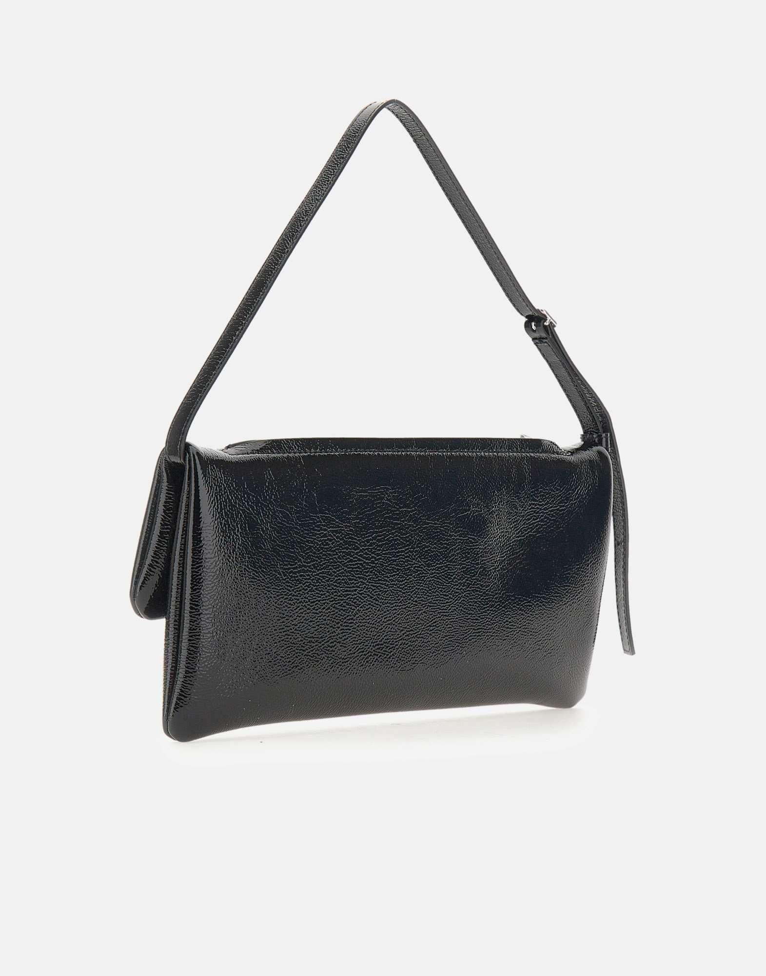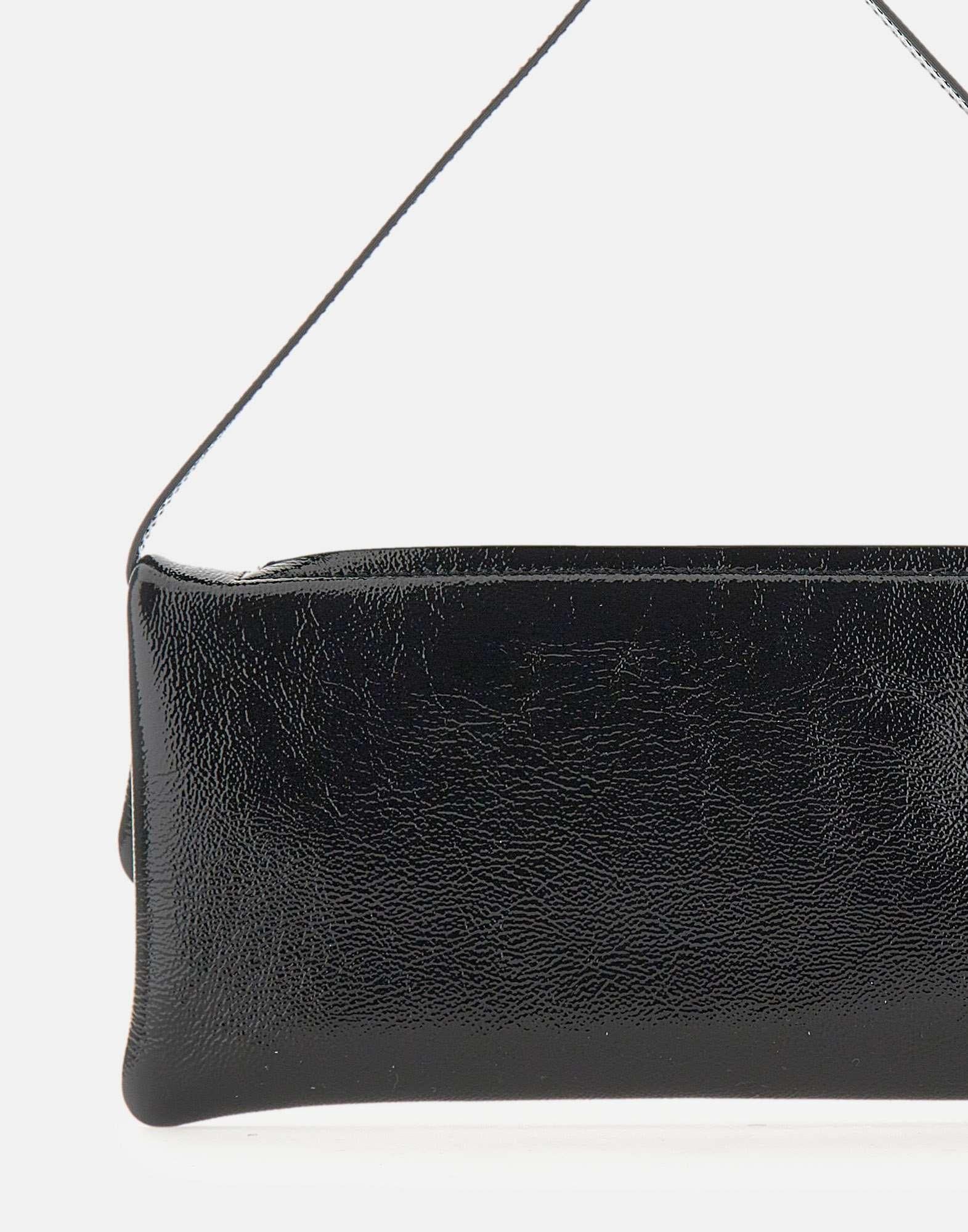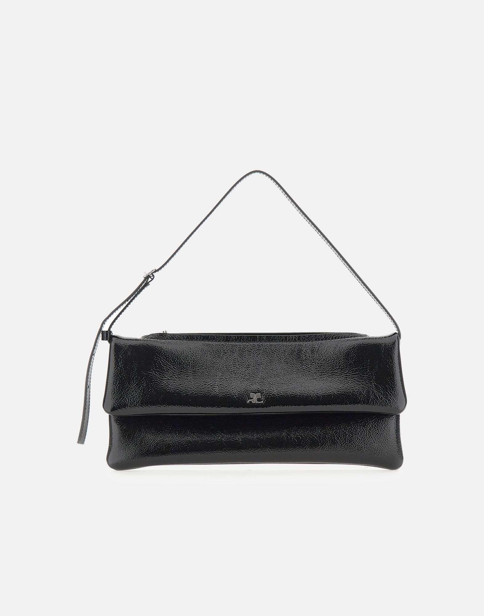 Clutch Courrèges modello "Cuff Leather", realizzata in pregiata pelle di vitello lucida Naplack colore nero. Il design presenta manico superiore regolabile, chiusura magnetica e doppio logo in metallo come dettaglio distintivo. L’interno è organizzato con scomparto unico e tasche, tra cui una con zip, mentre all’esterno è presente una tasca superiore aggiuntiva. Realizzata in Italia e proposta con custodia inclusa.
