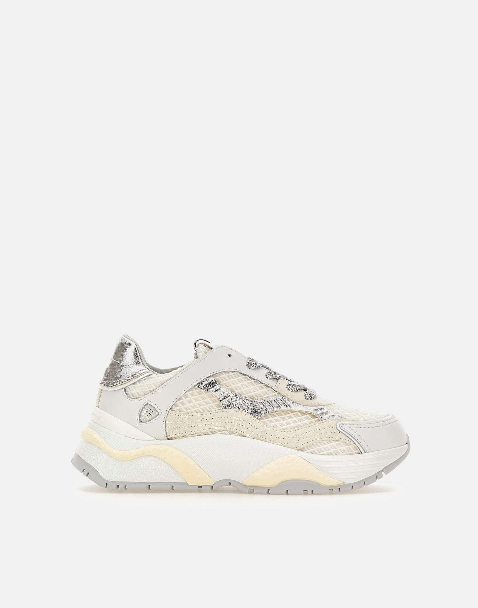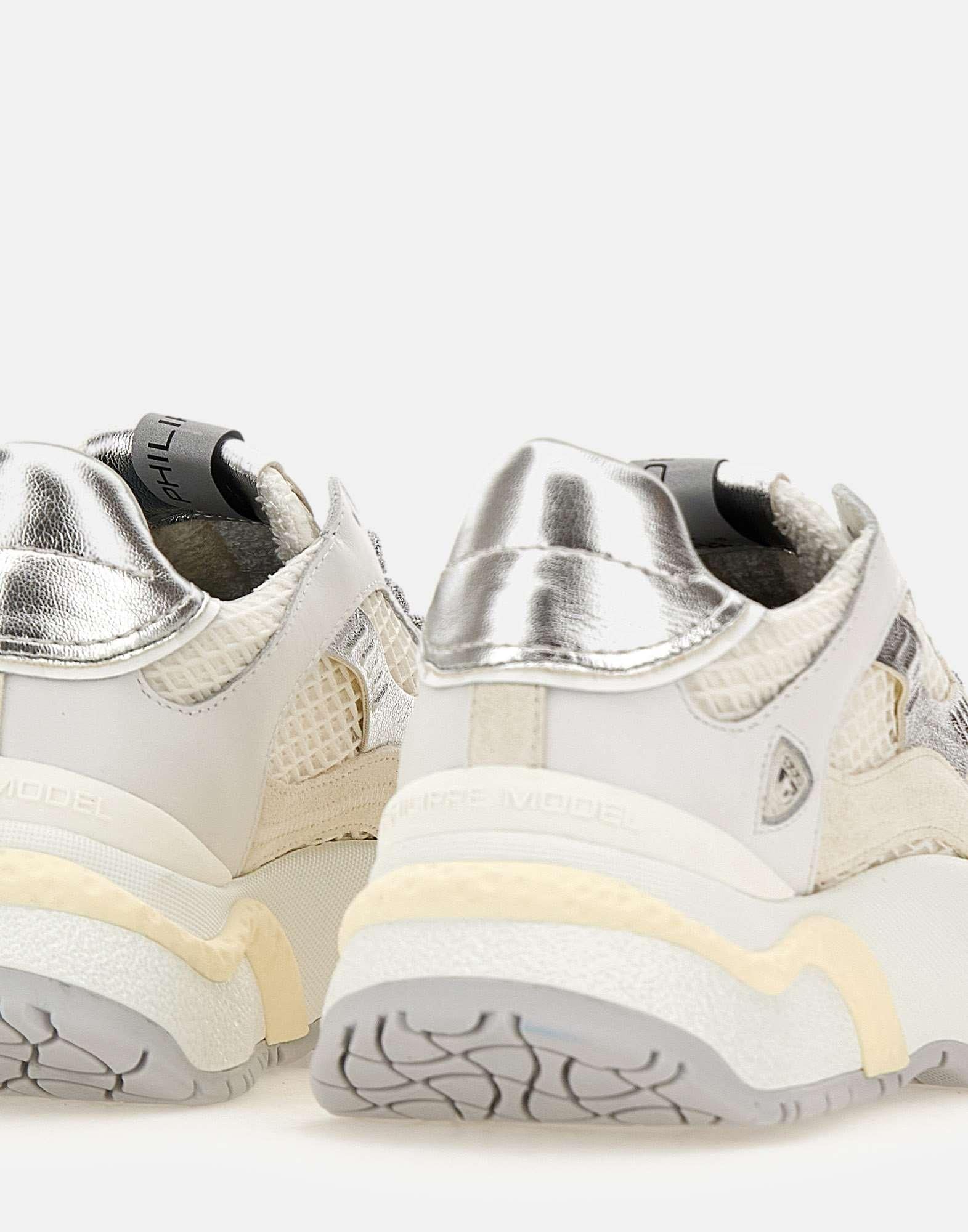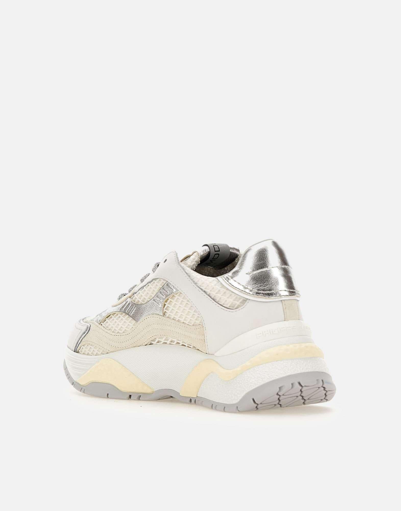 Sneakers donna Philippe Model Paris "Odeon", colore bianco, panna e argento, design contemporaneo e stile bold, ispirata al mondo urbano. La tomaia è realizzata in pelle con ricamo a zig zag in mesh metallizzato, inserti silver e iconico scudo lavorato ad alta frequenza su tallone e spoiler. Suola platform dinamica in bianco latte, altezza 6 cm al tallone. Soletta interna imbottita ed estraibile, fodera traspirante in spugna di cotone e pelle di vitello traforata per maggiore comfort. Custodia protettiva inclusa. Realizzate artigianalmente in Italia. Calzata regolare.