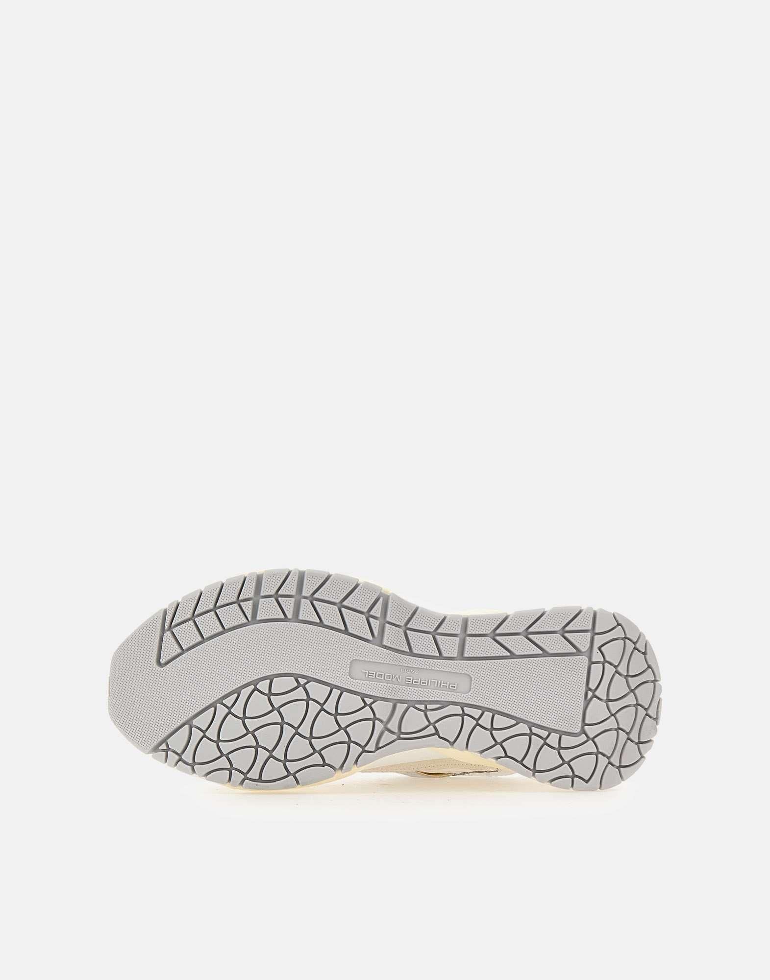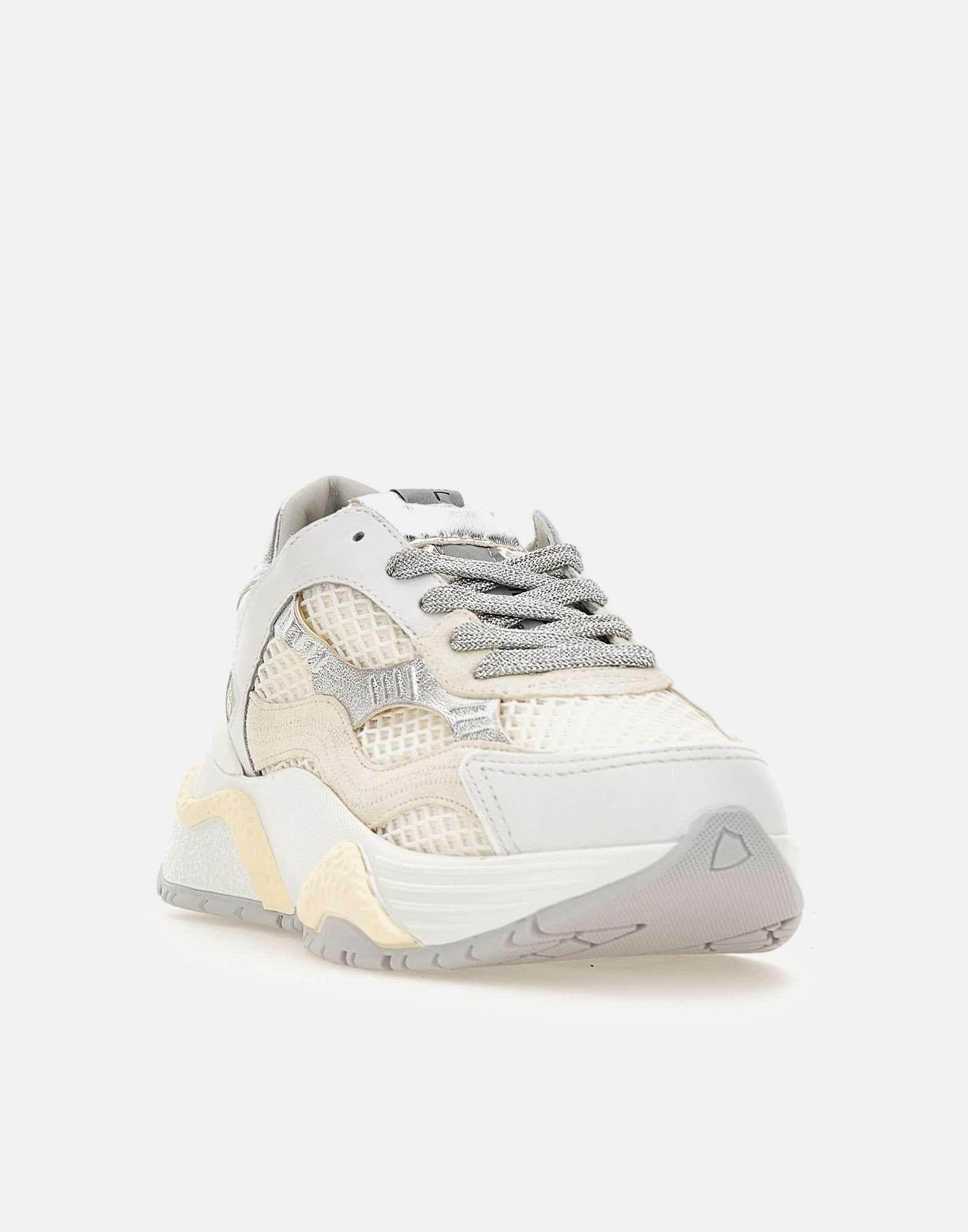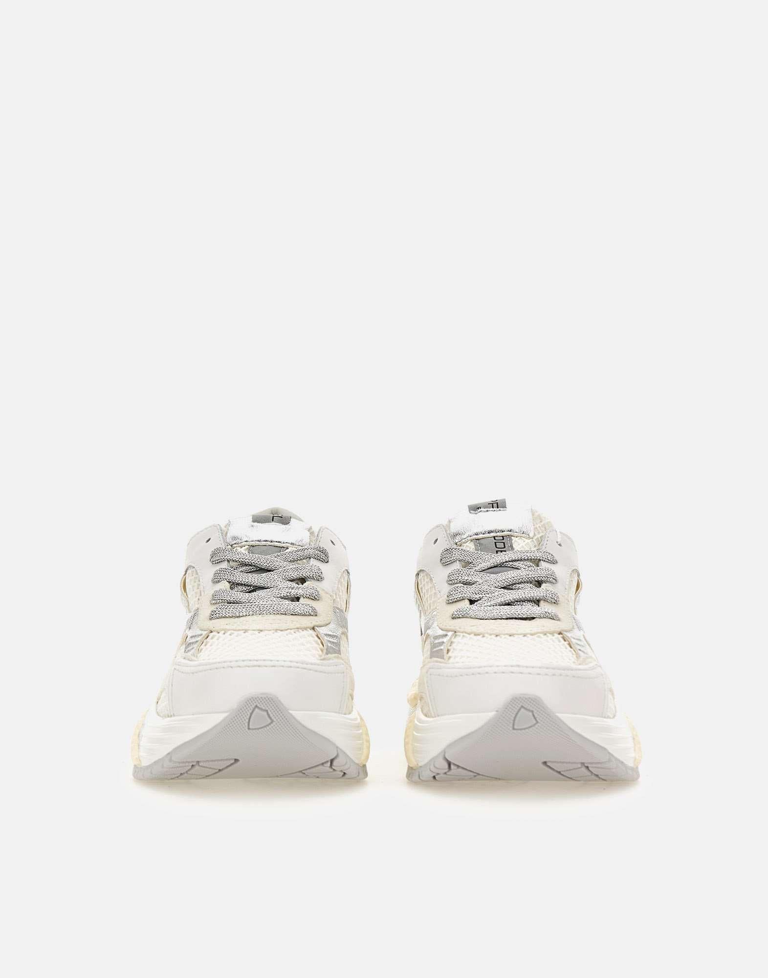 Sneakers donna Philippe Model Paris "Odeon", colore bianco, panna e argento, design contemporaneo e stile bold, ispirata al mondo urbano. La tomaia è realizzata in pelle con ricamo a zig zag in mesh metallizzato, inserti silver e iconico scudo lavorato ad alta frequenza su tallone e spoiler. Suola platform dinamica in bianco latte, altezza 6 cm al tallone. Soletta interna imbottita ed estraibile, fodera traspirante in spugna di cotone e pelle di vitello traforata per maggiore comfort. Custodia protettiva inclusa. Realizzate artigianalmente in Italia. Calzata regolare.