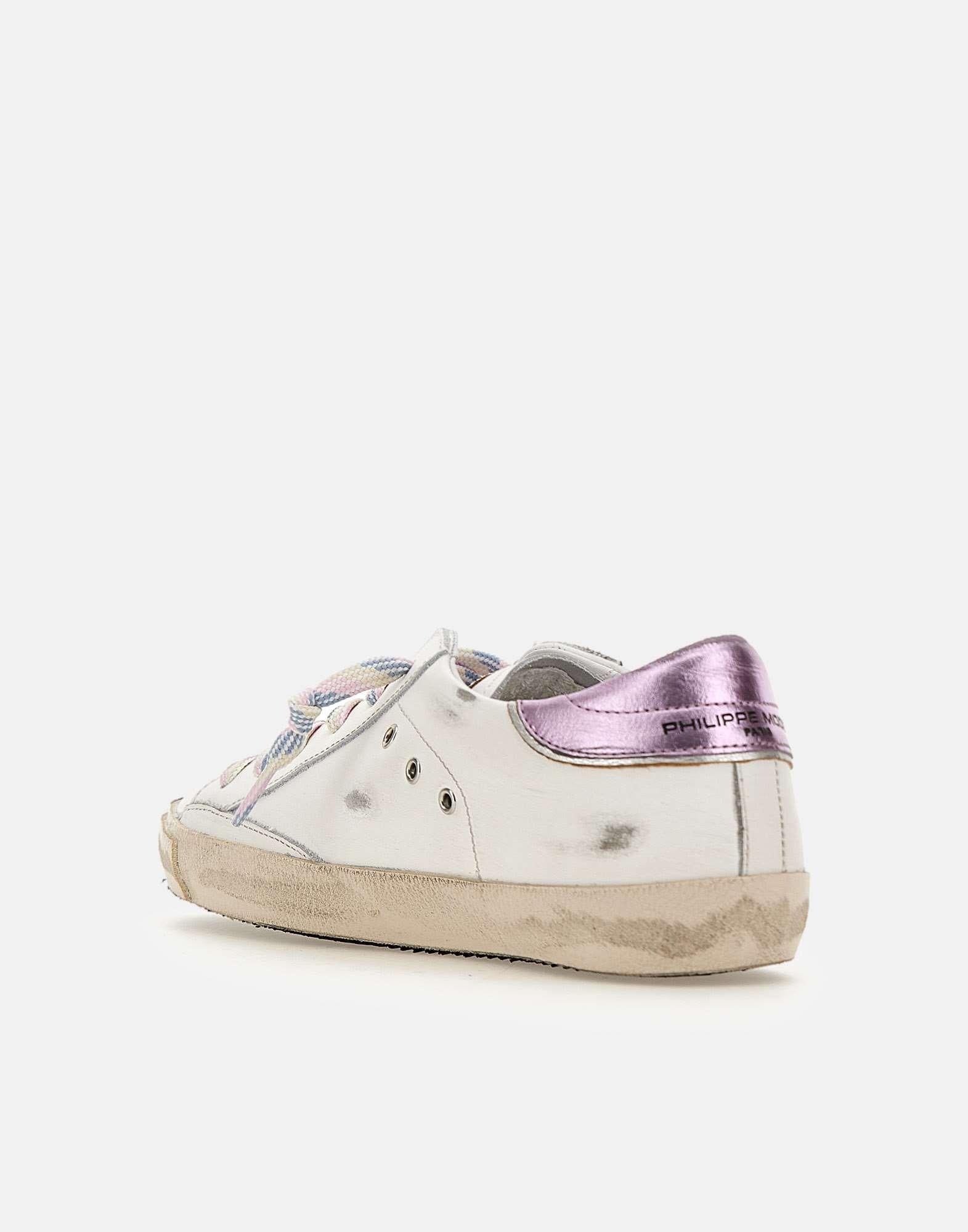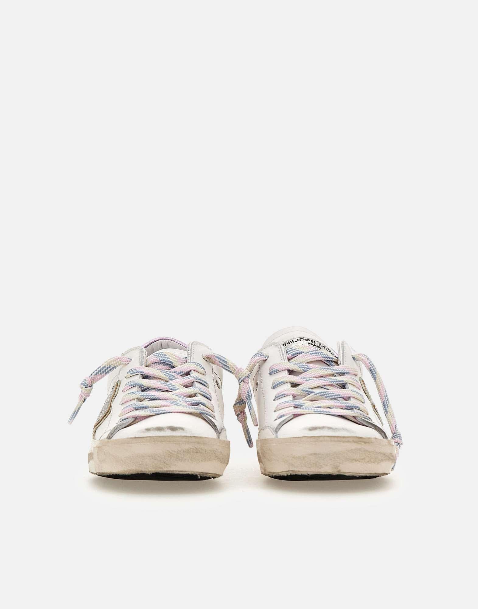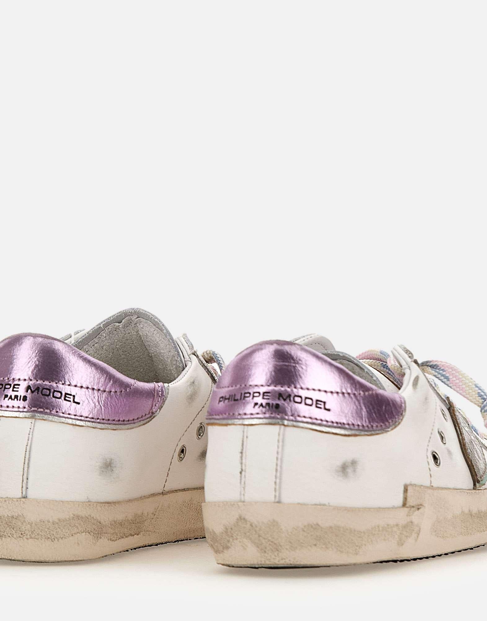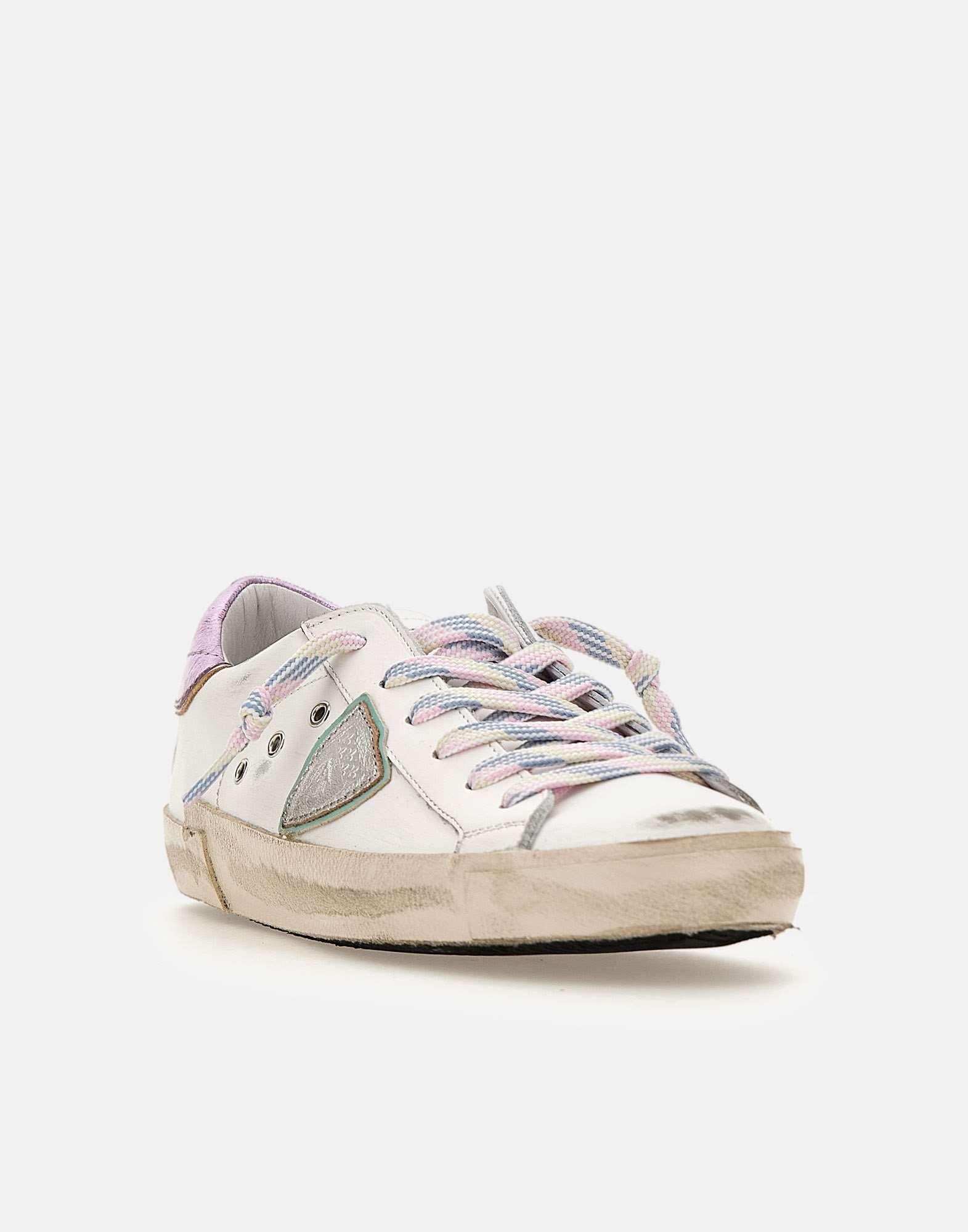 Sneakers donna Philippe Model Paris "Prsx" in pelle di vitello, trattamento used, impreziosite da dettagli con finish metallizzato lilla e finiture argento. Presentano punta tonda con fori laterali per traspirazione, lacci multicolor in tinta e fasciatura rifinita artigianalmente con fresature. Scudo iconico laterale silver. Soletta interna imbottita ed estraibile per un comfort personalizzato, fodera in spugna di cotone traspirante e suola in gomma alta 2,5 cm. Custodia protettiva inclusa. Realizzate artigianalmente in Italia. Calzata regolare.