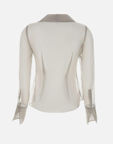 Camicia Remain Birger Christensen in organza di seta, colore grigio perla, maniche lunghe, colletto classico, chiusura con bottoni in tinta, polsini alti con bottoni, spacchetti laterali al fondo, relaxed fit