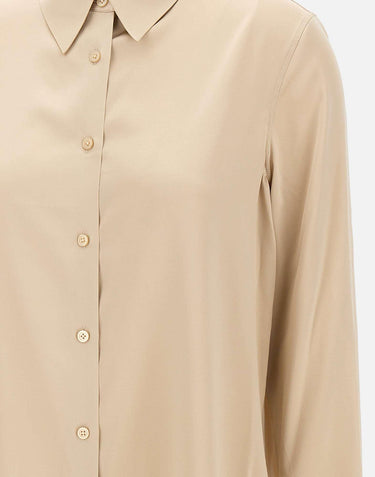 Camicia "Silk Shirt" Filippa K in pura seta color oro, dal design raffinato e minimalista. Presenta colletto classico, maniche lunghe con polsini abbottonati e chiusura frontale con bottoni in madreperla tono su tono. La linea regular fit offre una vestibilità elegante e confortevole, perfetta per look sofisticati da giorno o da sera.