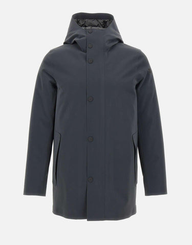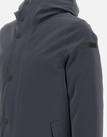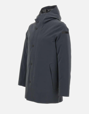 Parka uomo RRD modello "Double Silicon Floating", proposto in grigio fumo con sfumatura blu. Realizzato in tessuto a membrana Stratofabric con speciale spalmatura al silicone che crea un raffinato effetto cangiante, presenta costruzione a taglio laser e incollaggio a caldo per un design pulito e minimalista. Chiusura frontale con zip e bottoni, cappuccio avvolgente imbottito e morbida imbottitura in piuma danatra 90/10 contenuta da canali tubici privi di impunture, grazie allinnovativo sistema Floating Shield, che assicura una vestibilità diritta e impeccabile. Tasche laterali con zip. Completano il capo un taschino interno con zip invisibile e doppio filetto arancione fluo accanto alla tag a cuore "Made with love, designed in Tuscany". Logo a microiniezione nero sulla manica sinistra. Vestibilità regular.