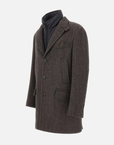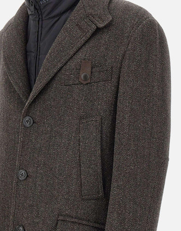 Cappotto uomo Fay "Driving Coat" in lana double marrone scuro, caratterizzato da revers classici e doppi spacchi posteriori per una vestibilità confortevole. Dotato di gilet interno removibile con imbottitura sintetica per garantire calore e versatilità d’uso. Presenta tasche a doppio filetto con pattina, tasche scaldamani e taschino pochette con alamaro in crosta e automatico. Chiusura con zip nascosta e bottoni. Completa di pratica tasca interna. Made in Italy. Vestibilità regolare.
