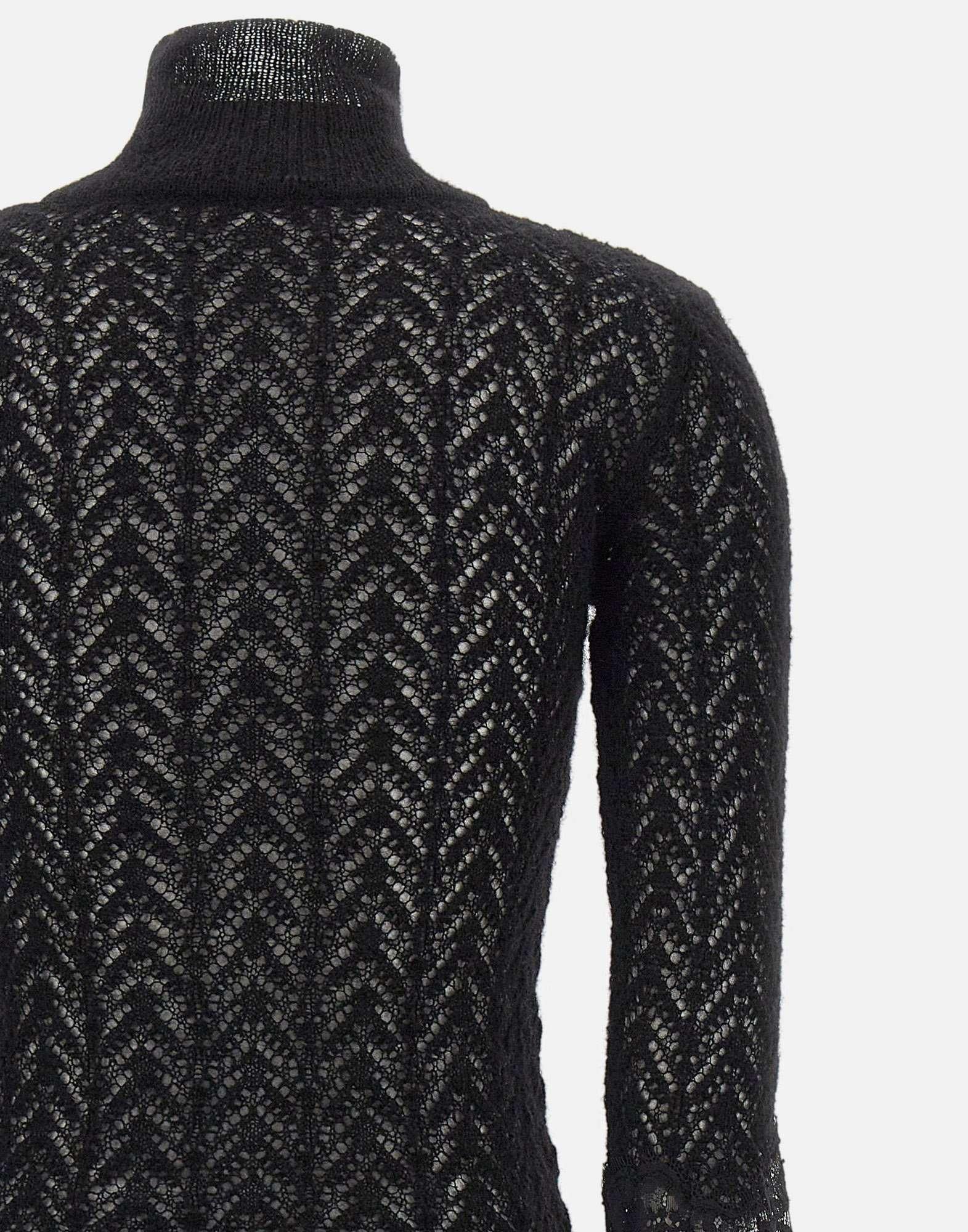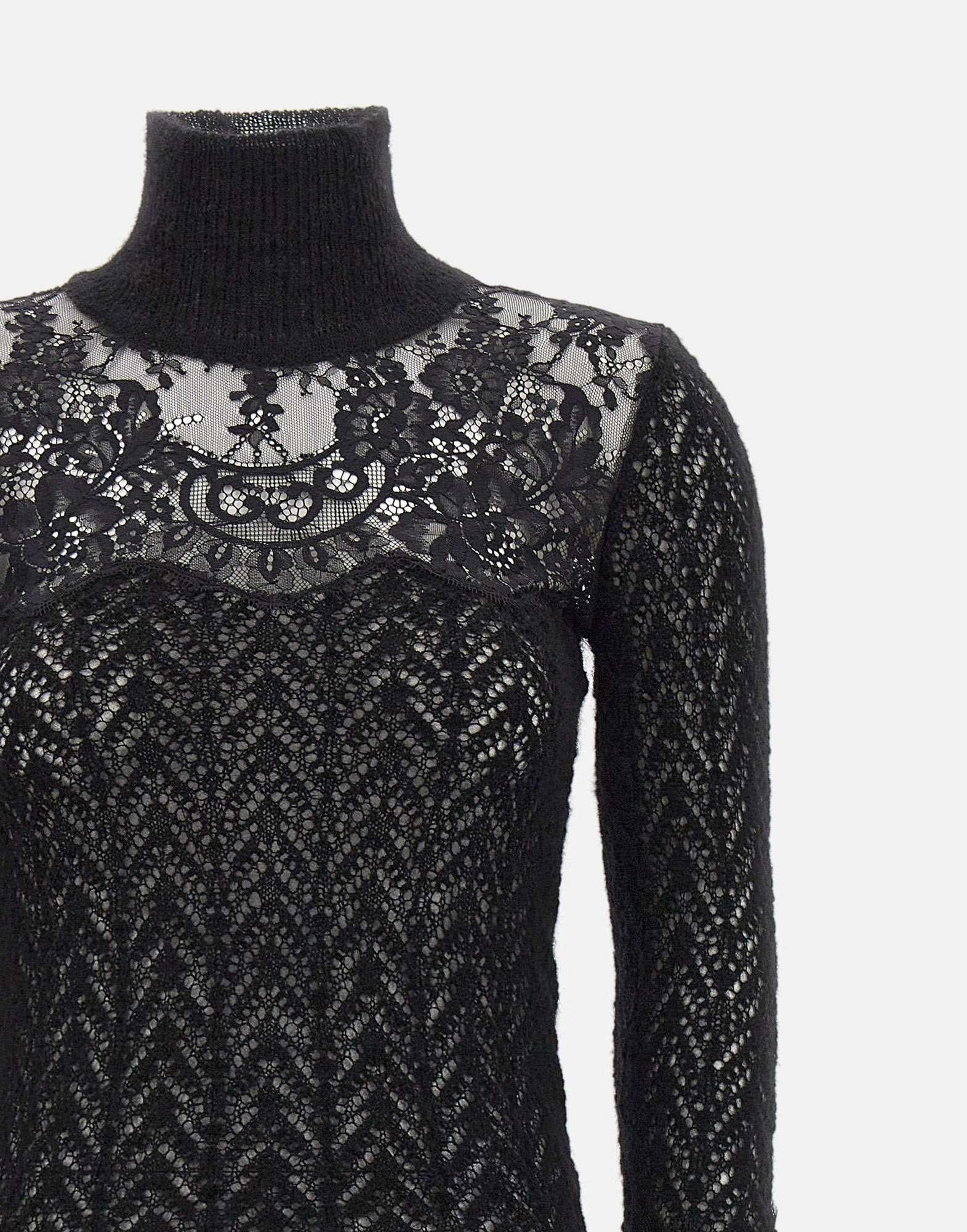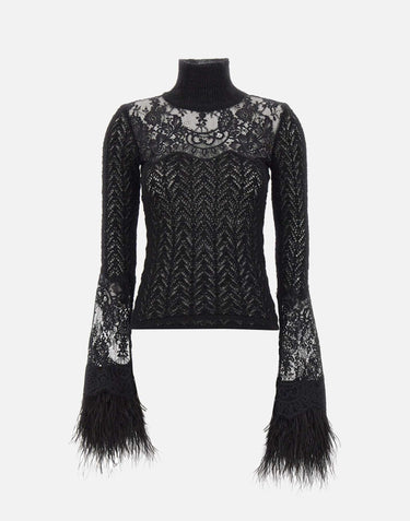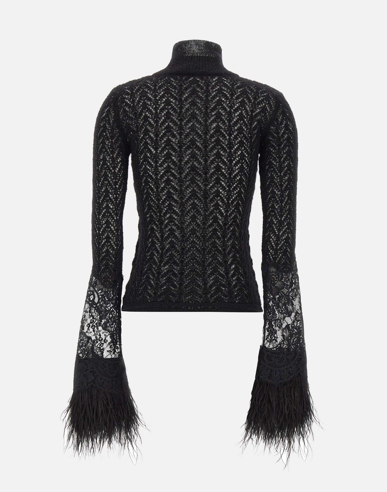 Maglia Blumarine in lana e mohair, colore nero, maniche extra lunghe, collo alto, inserti in pizzo, polsini con piume di struzzo tono su tono, regular fit, made in Italy