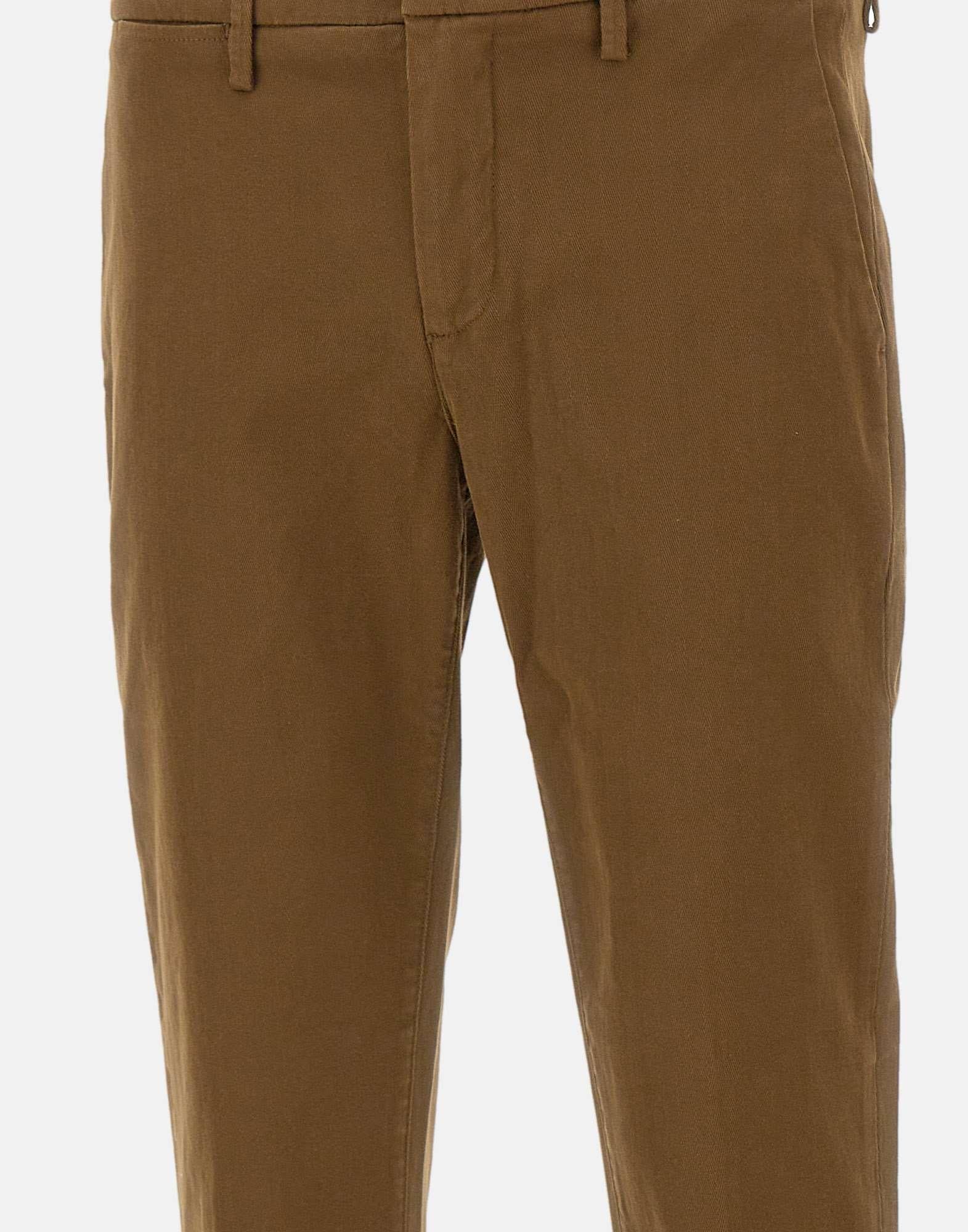 Pantaloni uomo Re-Hash "New Mucha", color cannella, in cotone stretch su trama operata, extra confortevole al tatto e all'indosso, passanti per cintura, chiusura con zip, bottone e gancetto, mini taschino frontale, tasche laterali a filo, tasche con bottone sul retro, fondo 17cm con risvolto 2,5cm, slim fit. Made in Italy