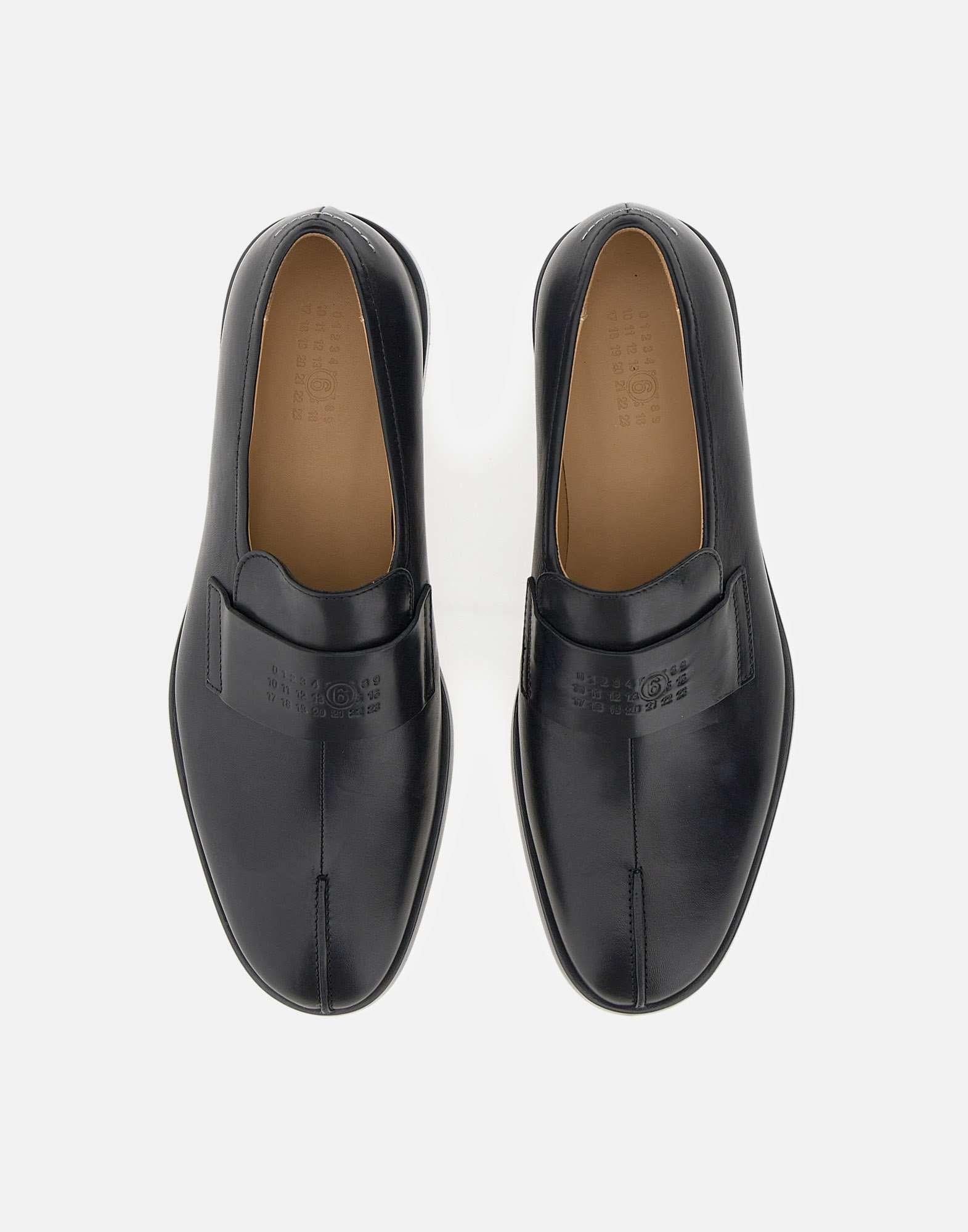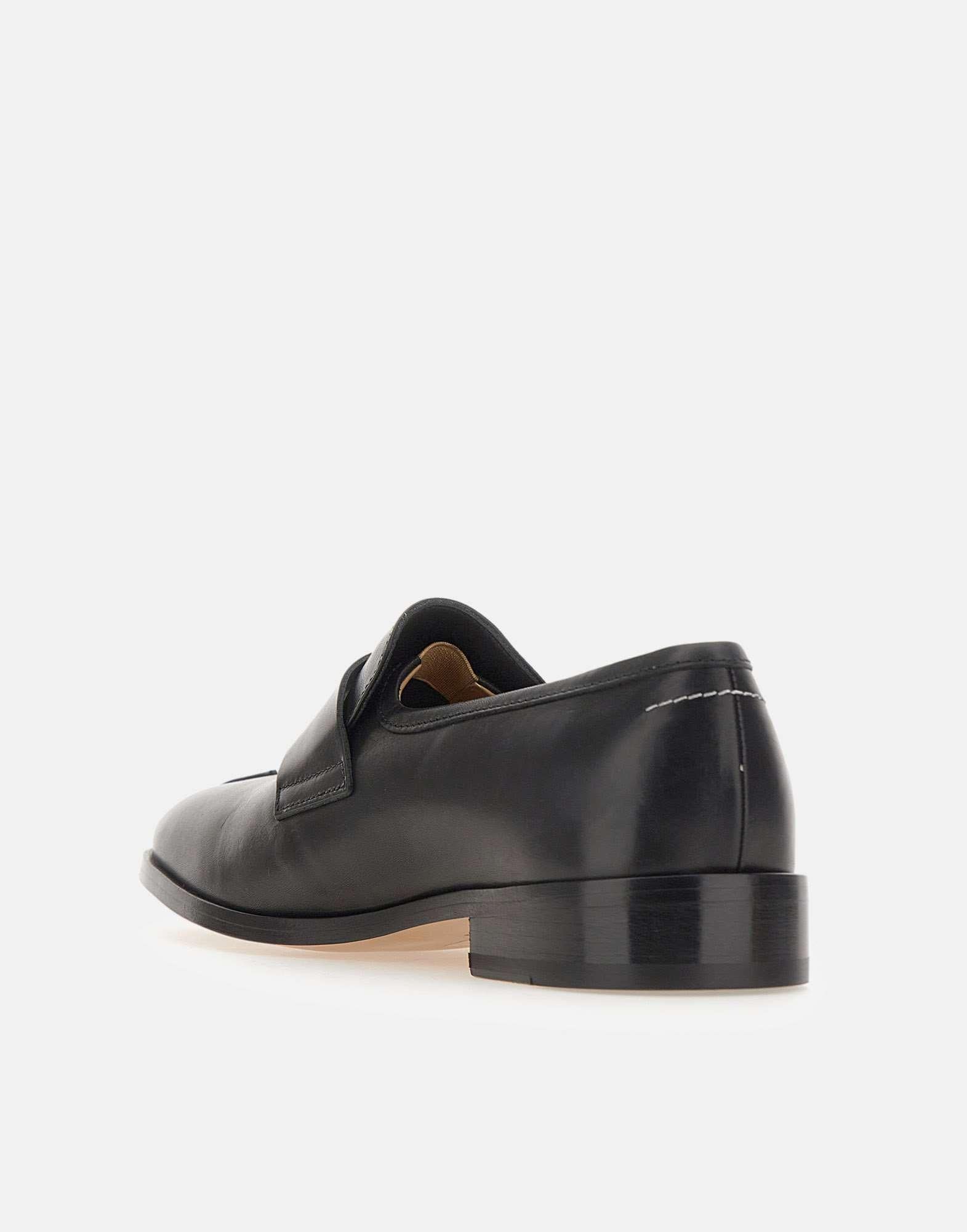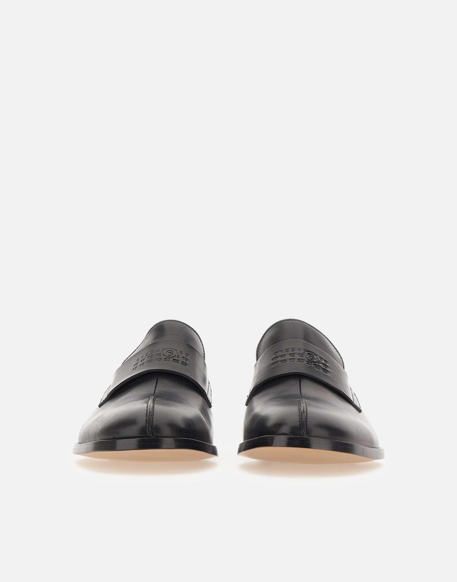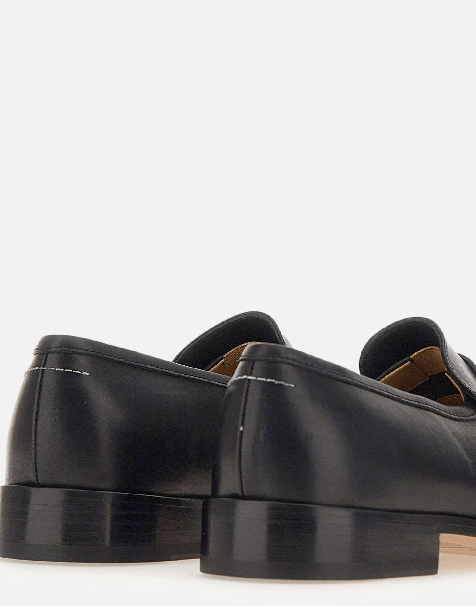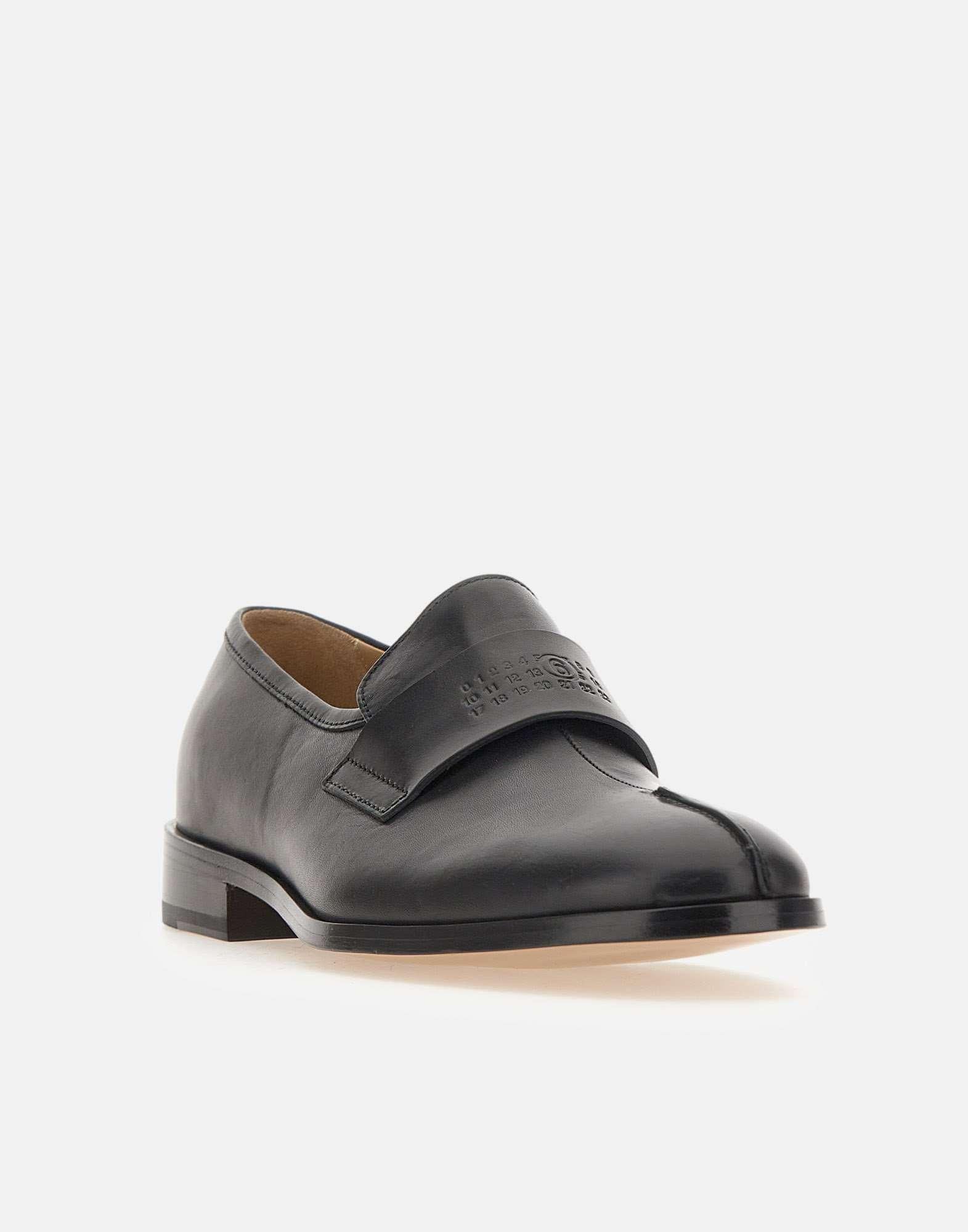 Mocassini MM6 Maison Margiela, realizzati in pelle a concia vegetale di colore nero. Il design è caratterizzato da mascherina frontale con logo Signature Numeric impresso, impunture a vista e suola in cuoio con tacco alto. Dettaglio iconico la riga bianca ricamata sul retro, segno distintivo della Maison. Calzata regolare. Made in Italy.
