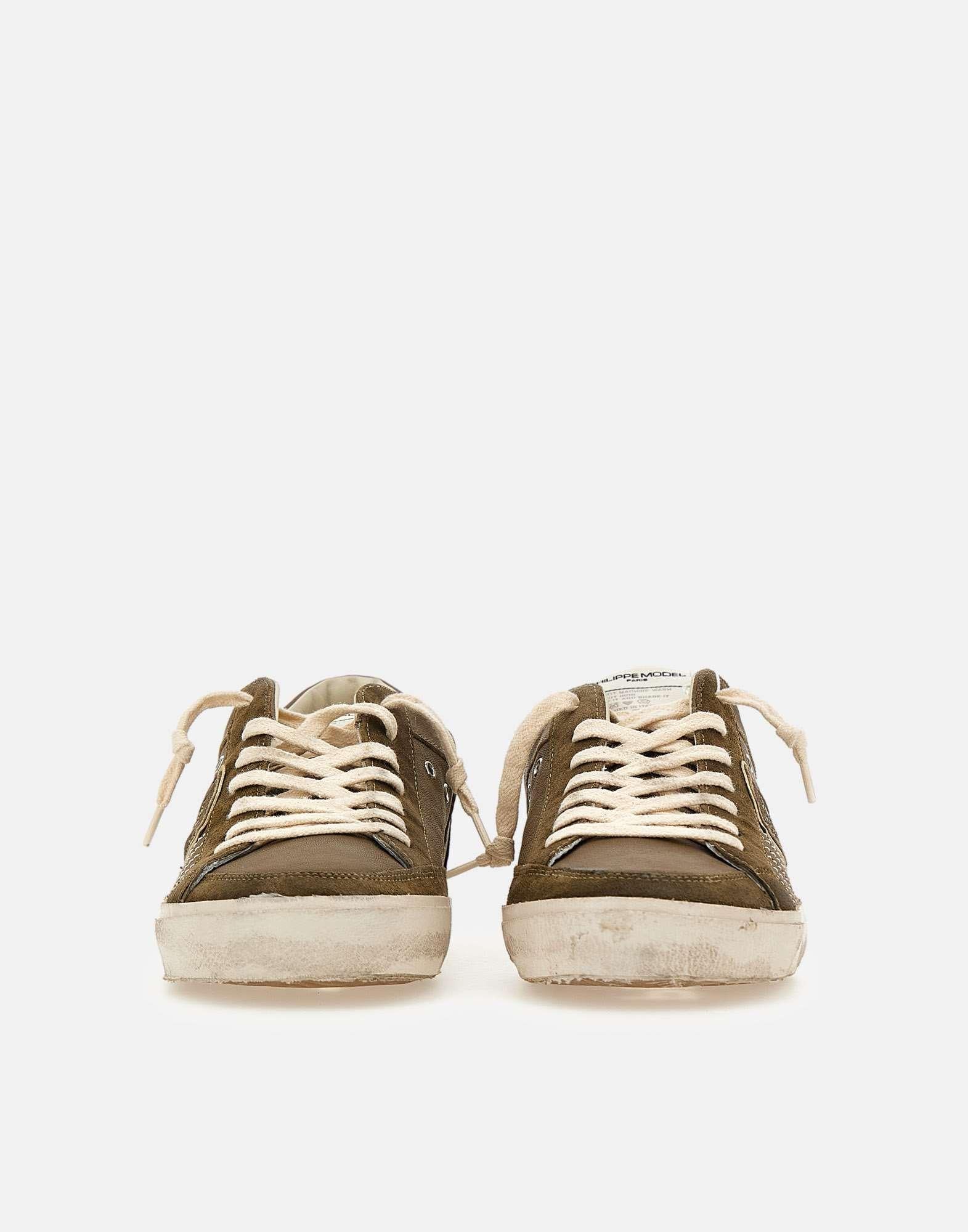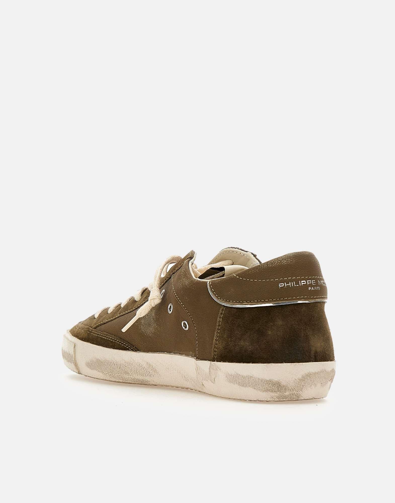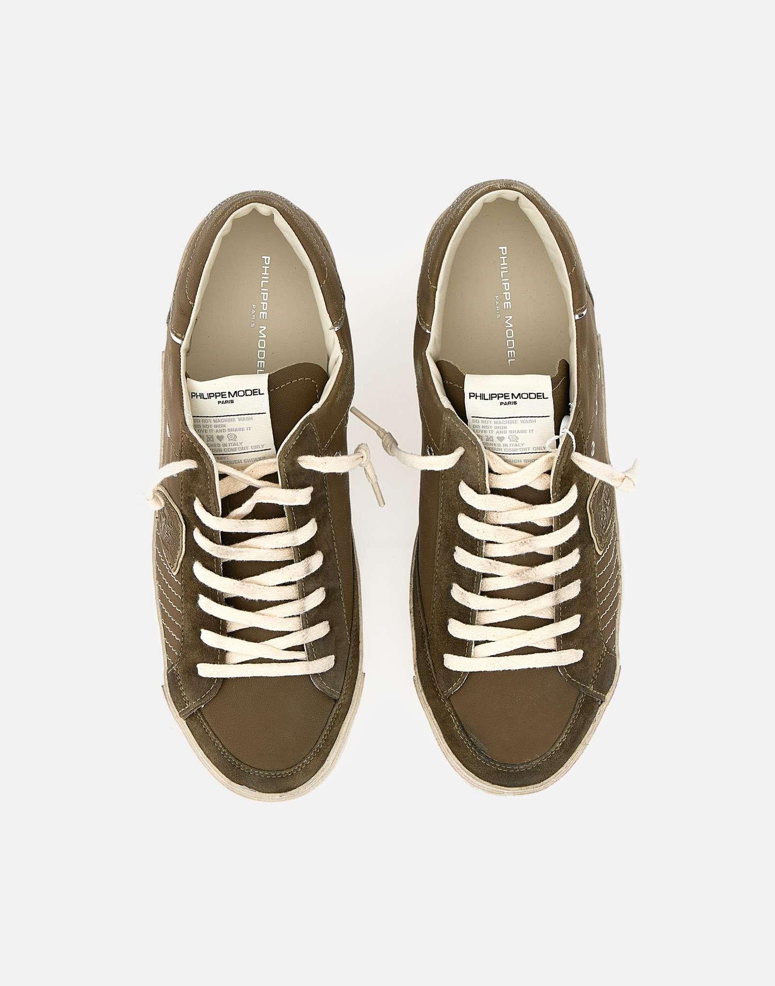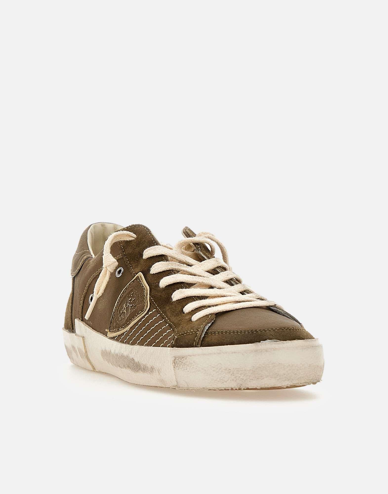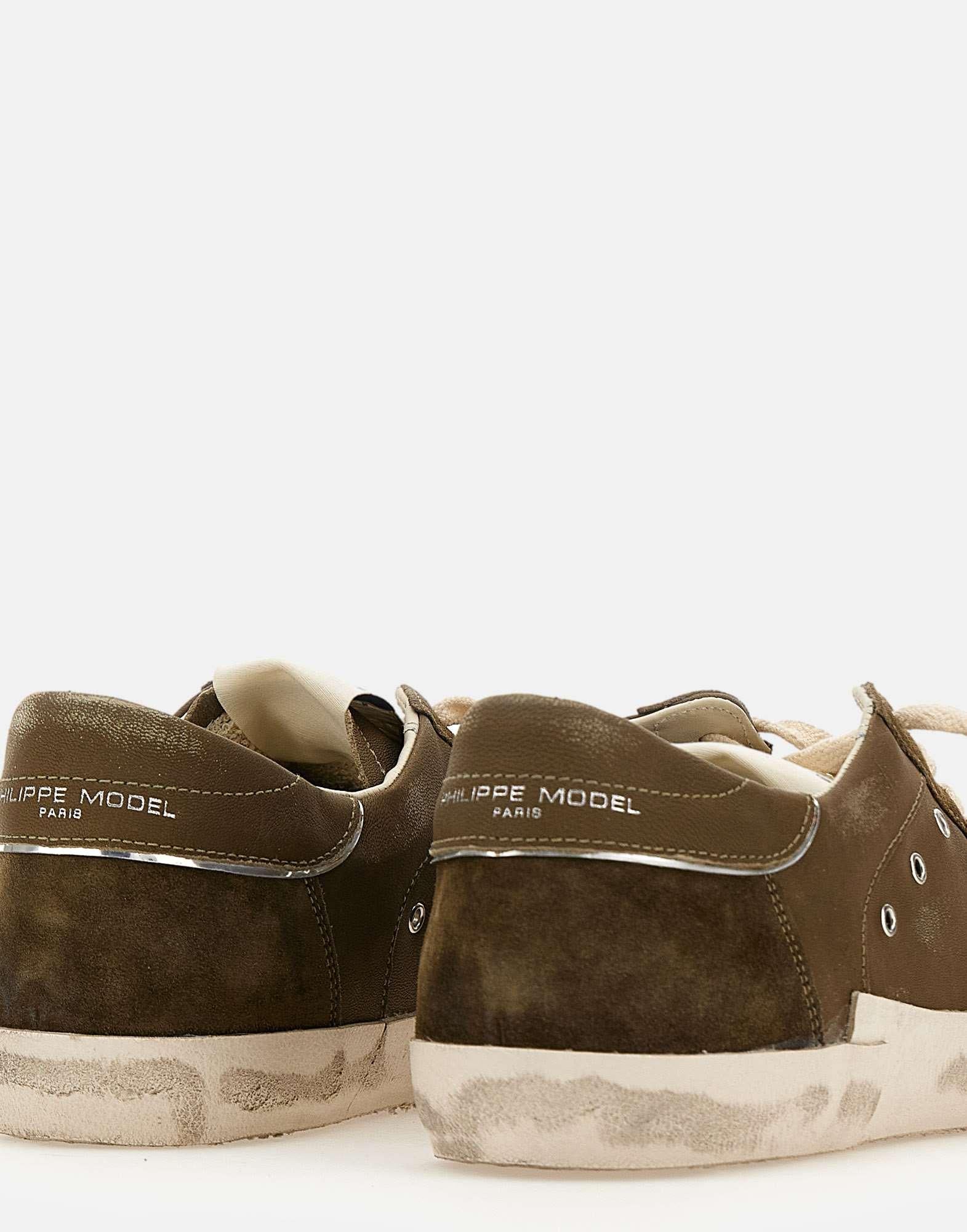 Sneakers uomo Philippe Model Paris "Prsx low", verde oliva, tomaia in pelle scamosciata super morbida con trattamento used, talloncino con profilo argento metallizzato, iconico scudo laterale, fori laterali per la traspirazione, logo sulla linguetta, lacci piatti in cotone, soletta logata estraibile, fodera interna in pelle e spugna di cotone, suola used altezza 2,5 cm, calzata regolare, made in Italy.