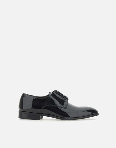 Stringate cerimonia Carlo Pignatelli "Rugan" in vernice, colore nero, impunture a vista, chiusura con lacci, calzata comoda e regolare, tacco 2,5cm, suola in gomma, made in Italy