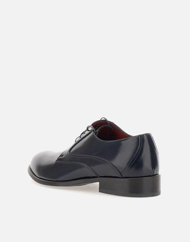 Stringate uomo Duca Degli Abruzzi "CL21" in pelle spazzolata, colore blu, impunture artigianali a vista, chiusura con lacci in tinta, interno in morbida pelle, soletta logata, suola in cuoio, tacco 2cm. Made in Italy.