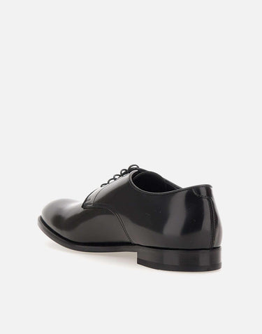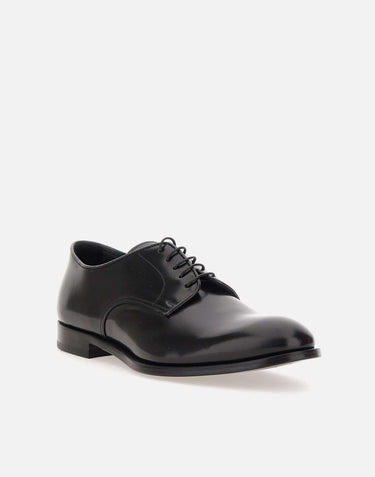 Stringate "Horse" uomo Doucal's in pelle, colore nero, chiusura con lacci, interno in pelle, soletta logata, impunture artigianali a vista, suola in cuoio, tacco 2cm.Made in Italy. Custodia in tessuto inclusa. Calzata regolare