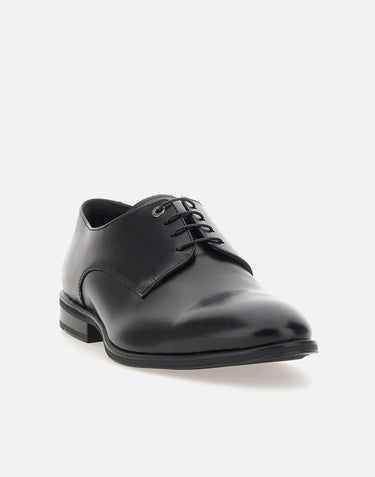 Stringate uomo Carlo Pignatelli in pelle spazzolata, finitura opaca, colore nero, impunture a vista, design elegante ed essenziale, chiusura con lacci in tinta e occhiello unico silver logato, suola in gomma, altezza tacco 2cm. Made in Italy.