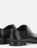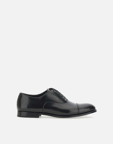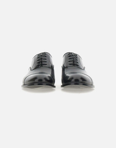 Stringate Doucal's in pelle spazzolata, colore nero, impunture artigianali a vista, punta arrotondata, chiusura con lacci, soletta in pelle logata, suola in cuoio, tacco 2cm. Made in Italy. Calzata regolare, custodia in tessuto inclusa.