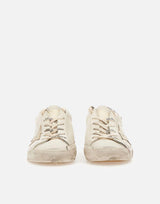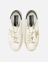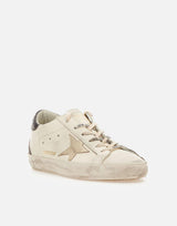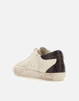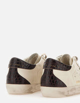 Sneakers donna Golden Goose "Superstar classic with spur" in pelle, colore bianco, trattamento used, stella iconica laterale in pelle metallizzata oro, chiusura con lacci in cotone logati, cuciture a vista, scritta logo oro laterale, fori per la traspirazione, tallone in pelle stampa cocco a contrasto con sfumatura amaranto, logo sul retro, interno in pelle e spugna, suola logata effetto used in gomma alta 2 cm. Made in Italy.