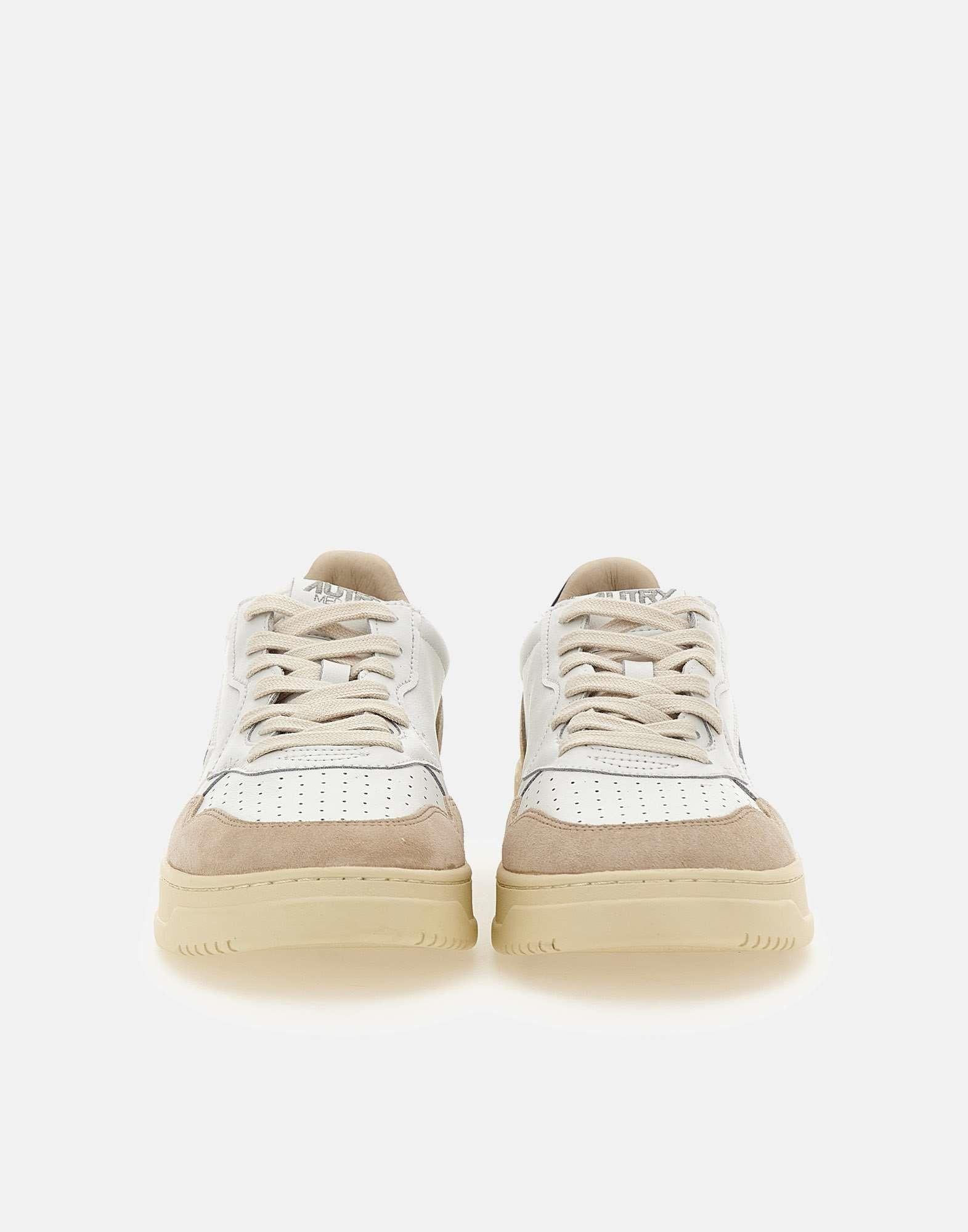 Sneakers uomo Autry "AULM LS28" in pelle, bianche con inserti in camoscio beige sabbia e talloncino in pelle blu, logo iconico laterale, punta traforata per favorire la traspirazione, lacci in cotone, linguetta con label cucita beige, fodera in pelle e spugna di cotone, suola in gomma logata alta 3,5 cm. Calzata regolare.