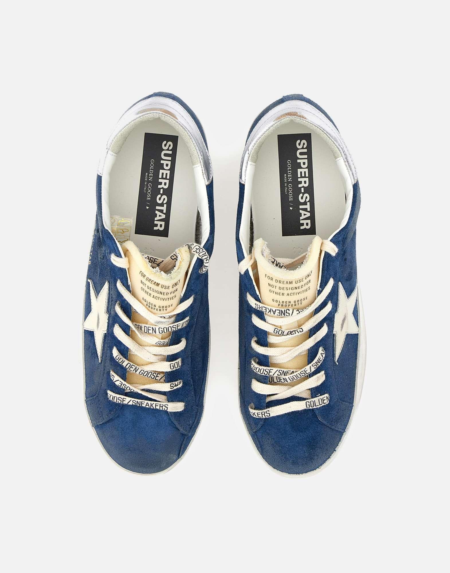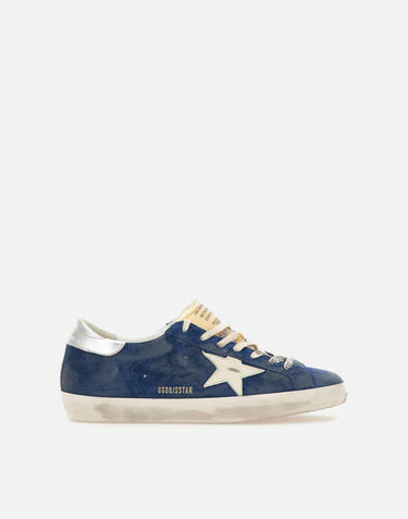 Sneakers uomo Golden Goose "Superstar Classic with list" in pelle scamosciata, blu, linguetta imbottita a contrasto con serigrafia logo, talloncino argento metallizzato, iconica stella laterale in pelle color burro, lacci logati, fori per la traspirazione, scritta logo oro, suola used in gomma altezza 2,5 cm. Made in Italy.Calzata regolare. Per chi solitamente opta per il mezzo numero è consigliabile salire di una taglia poiché il brand non utilizza mezze misure.