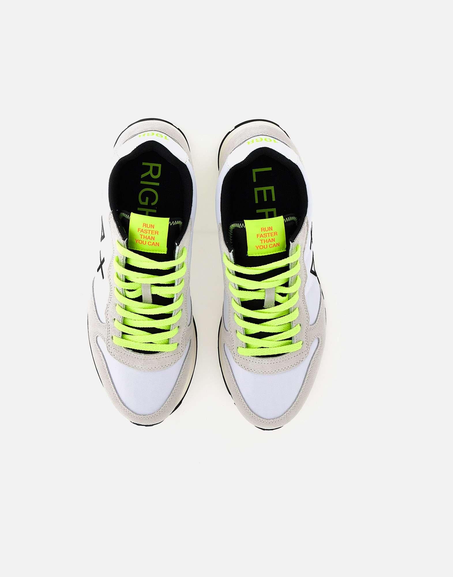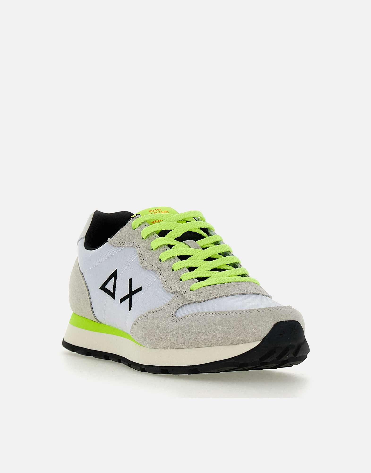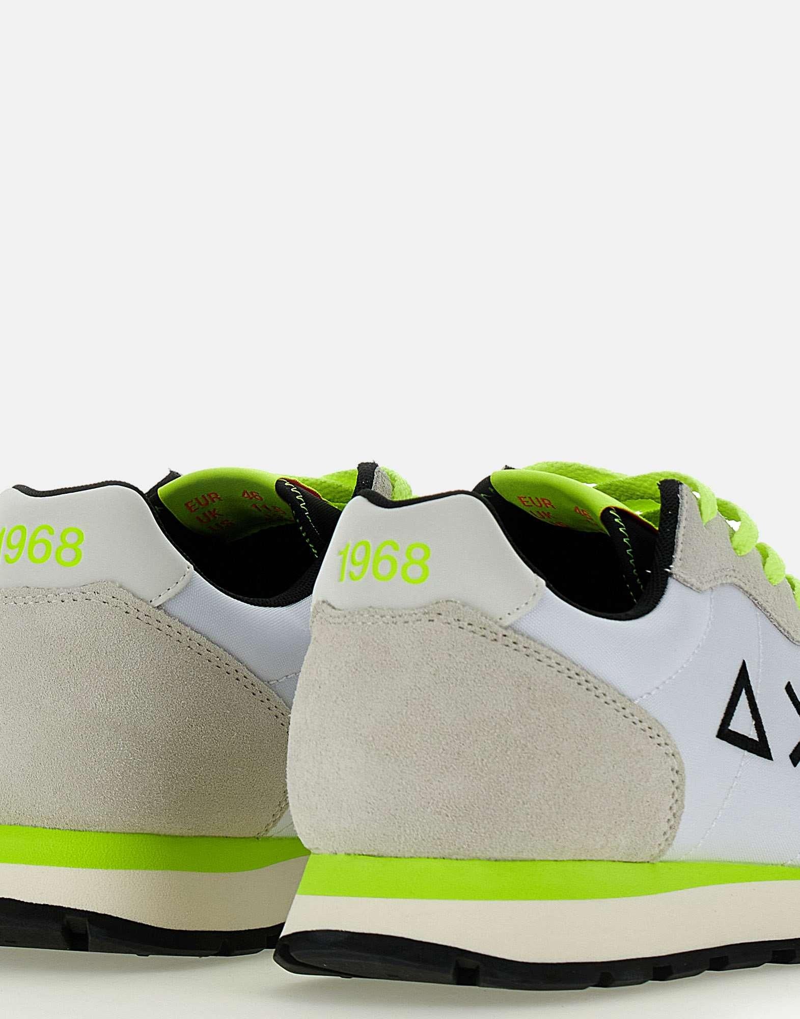Sneakers uomo Sun68 "Tom Fluo", colore bianco con dettagli colore nero e verde lime fluo, tomaia in nylon e inserti in camoscio ghiaccio, talloncino in pelle liscia panna, lacci piatti in cotone, maxi logo laterale , loghi su retro e linguetta, suola in gomma dentellata alta 3cm, calzata regolare. Lacci di ricambio inclusi