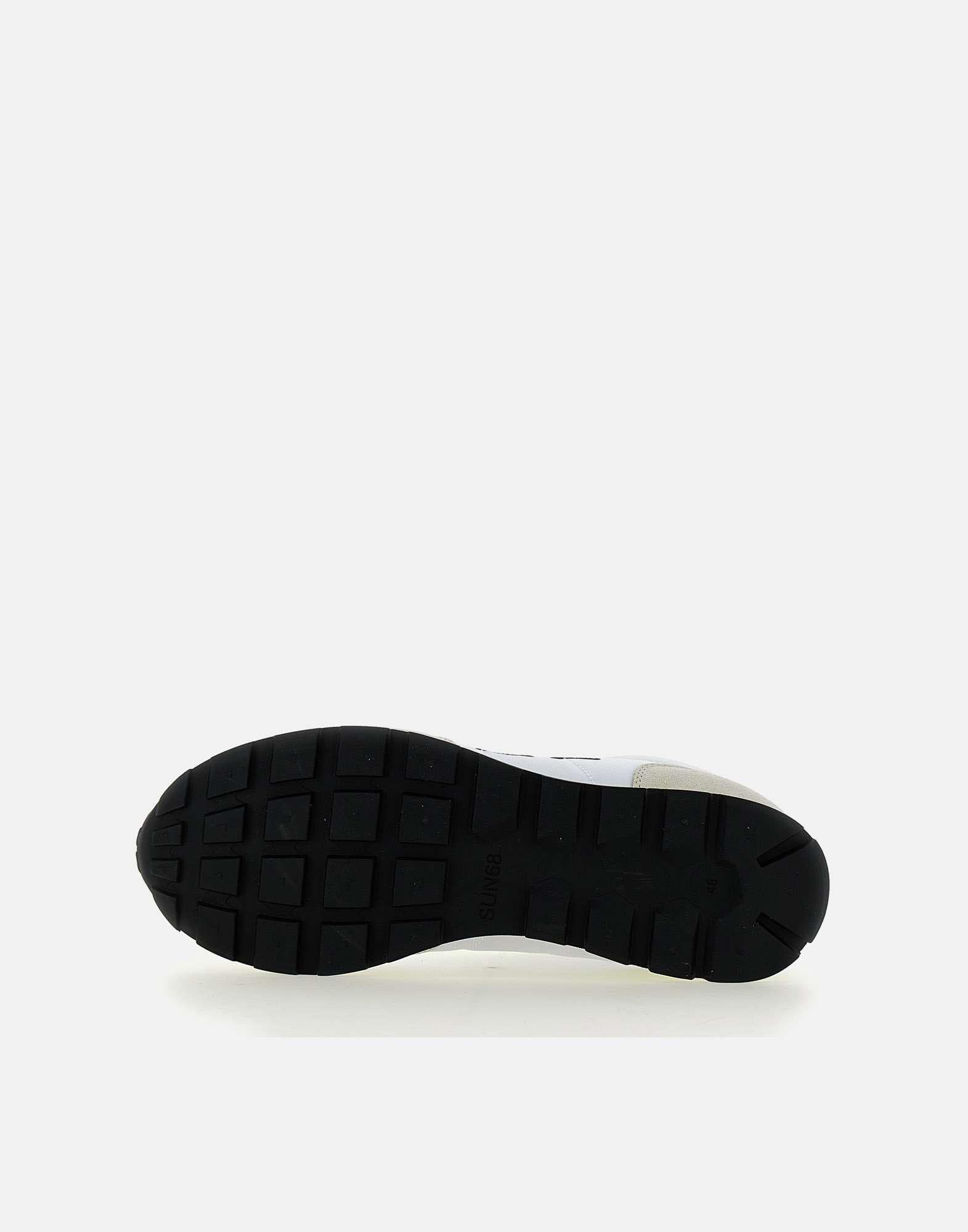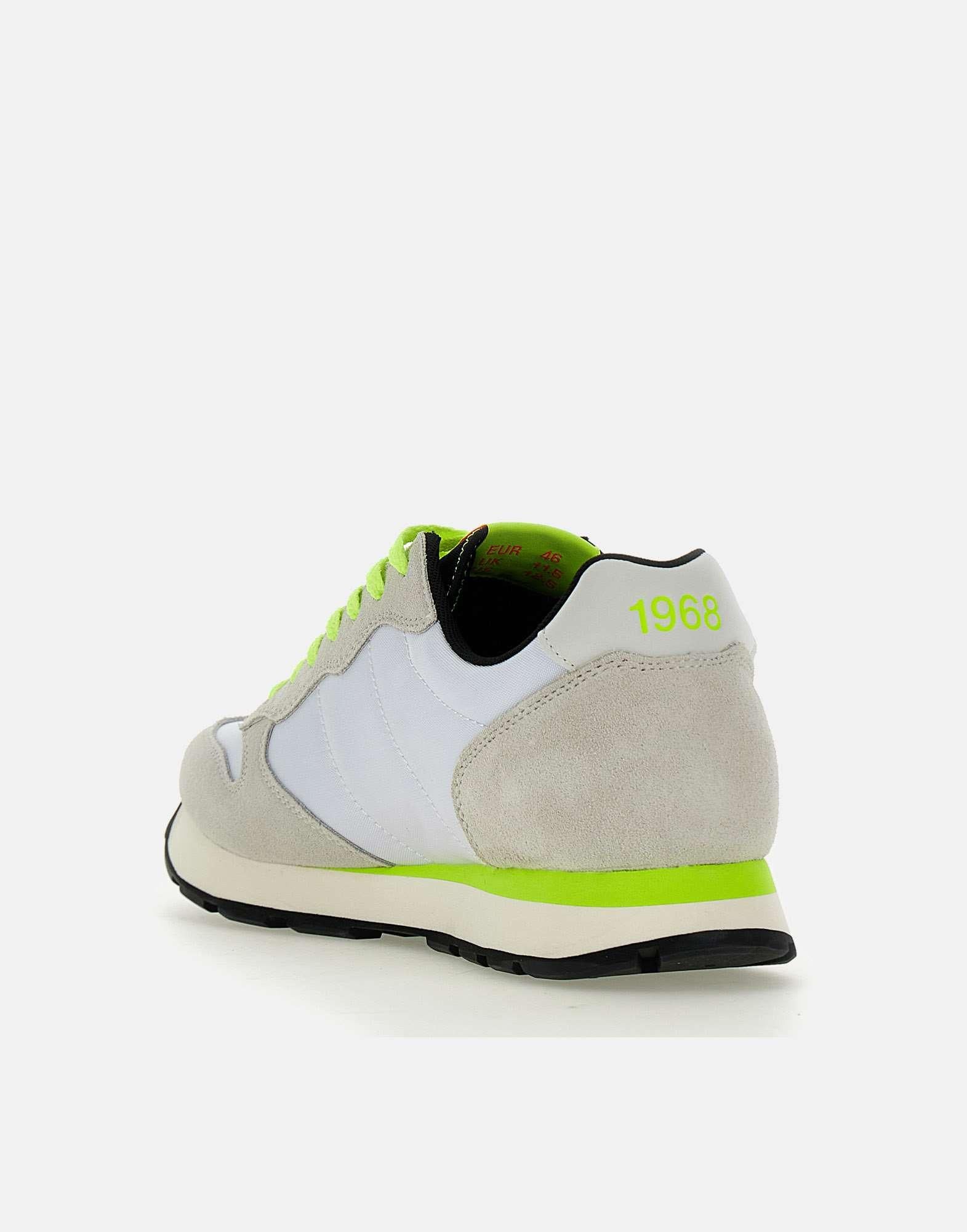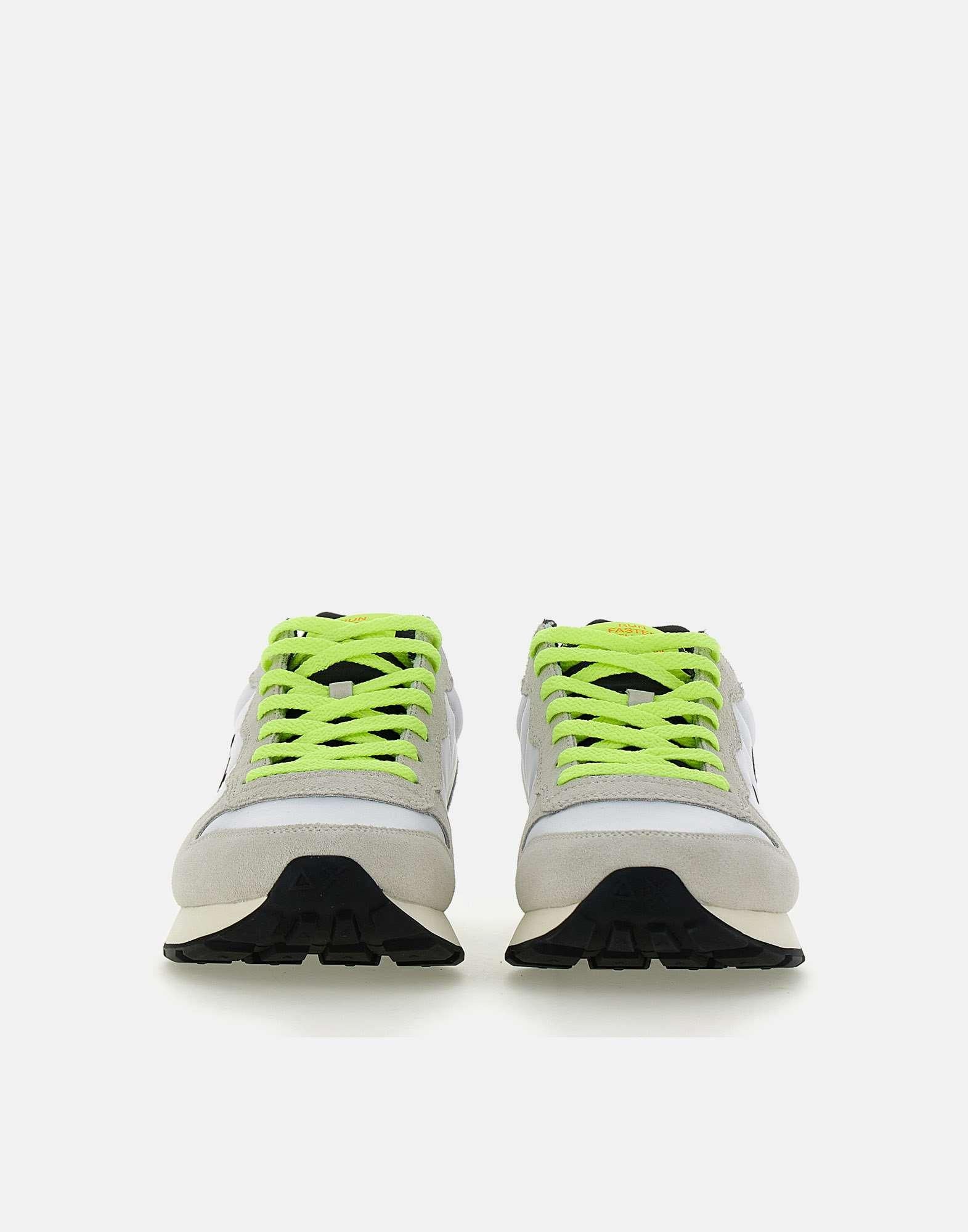 Sneakers uomo Sun68 "Tom Fluo", colore bianco con dettagli colore nero e verde lime fluo, tomaia in nylon e inserti in camoscio ghiaccio, talloncino in pelle liscia panna, lacci piatti in cotone, maxi logo laterale , loghi su retro e linguetta, suola in gomma dentellata alta 3cm, calzata regolare. Lacci di ricambio inclusi