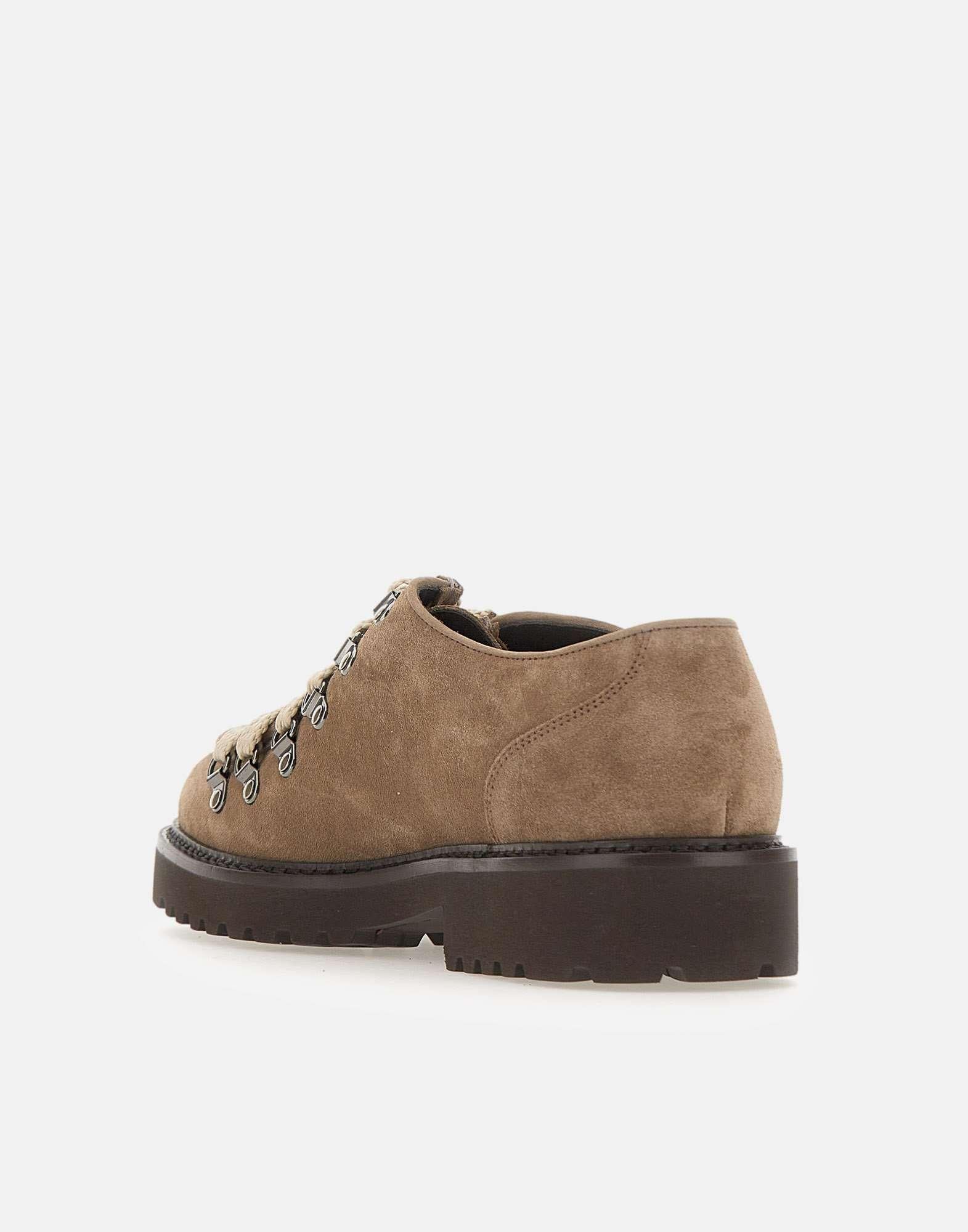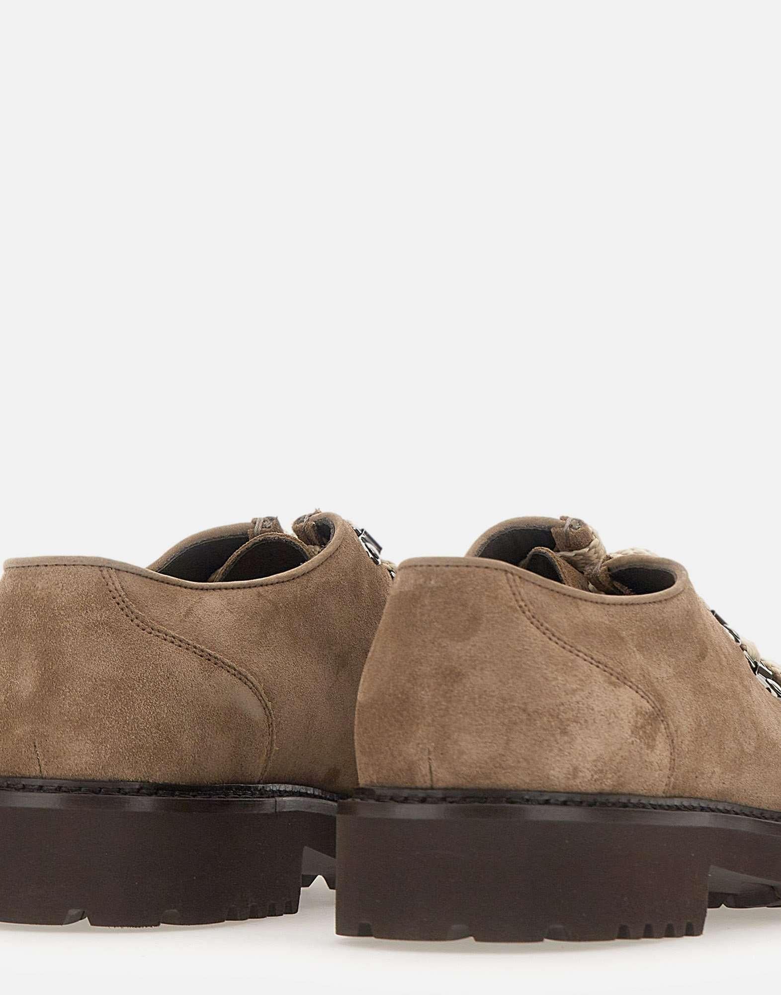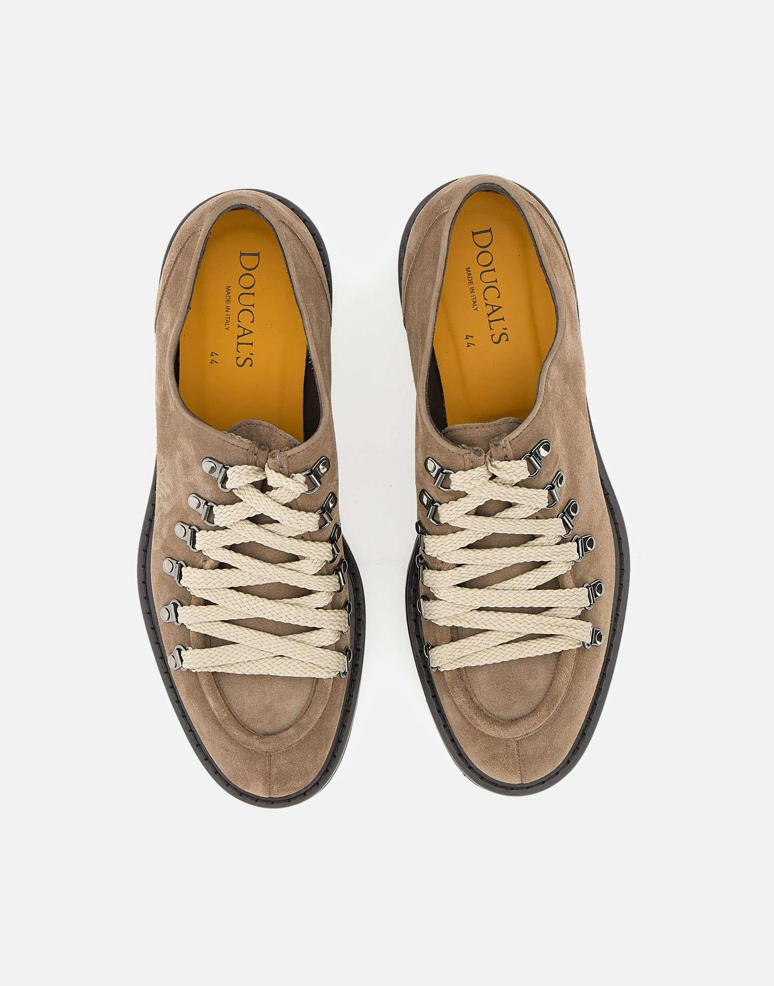 Stringate uomo Doucal's "Visone" in morbido camoscio color fango, con chiusura a lacci in tessuto a contrasto e occhielli in metallo fumé per un tocco raffinato. La punta tonda e le impunture a contrasto esaltano l’artigianalità del modello. La suola in gomma carrarmato con tacco da 4 cm assicura comfort e stabilità. Calzata regolare. Made in Italy. Custodia in tessuto inclusa. Lacci di ricambio inclusi