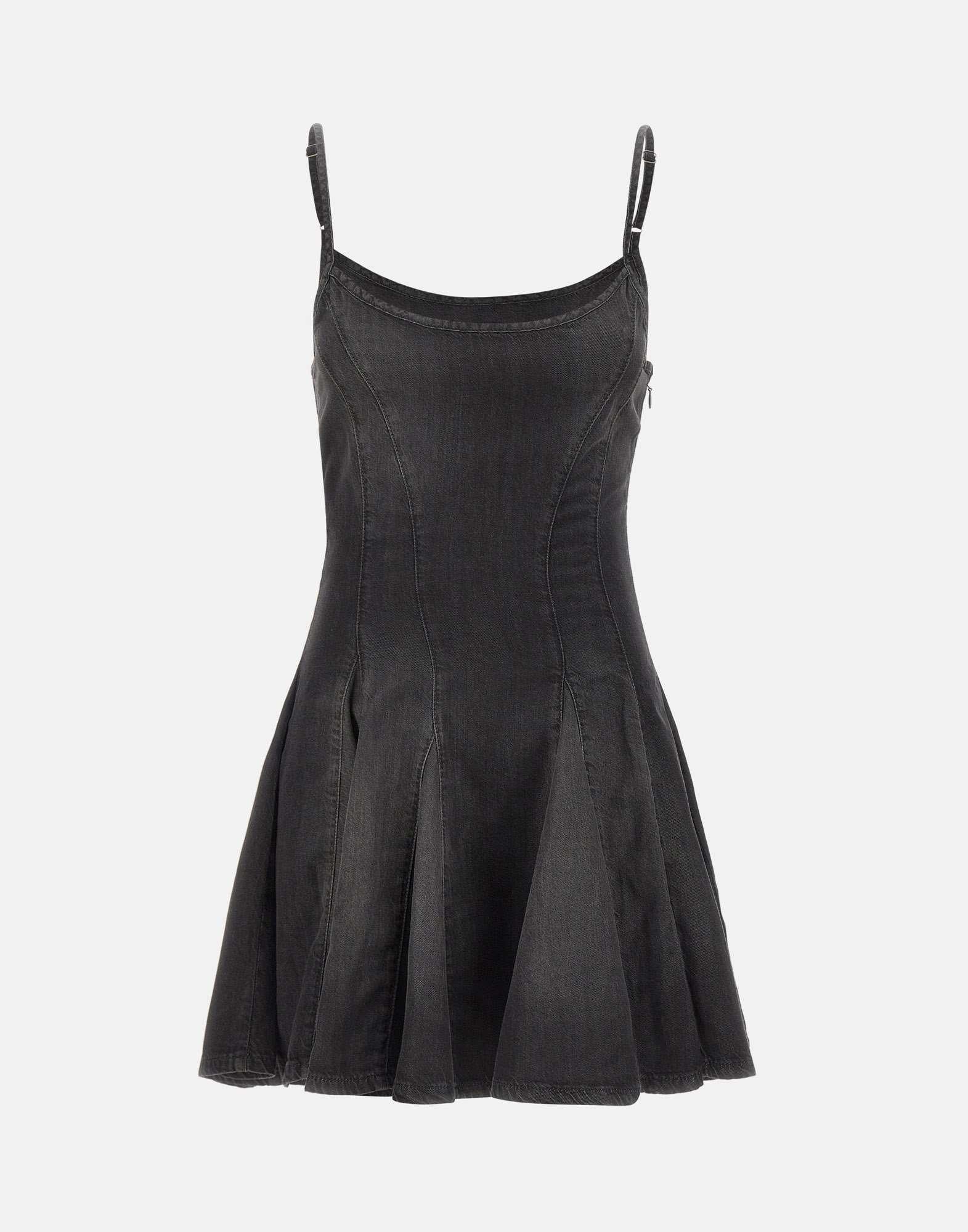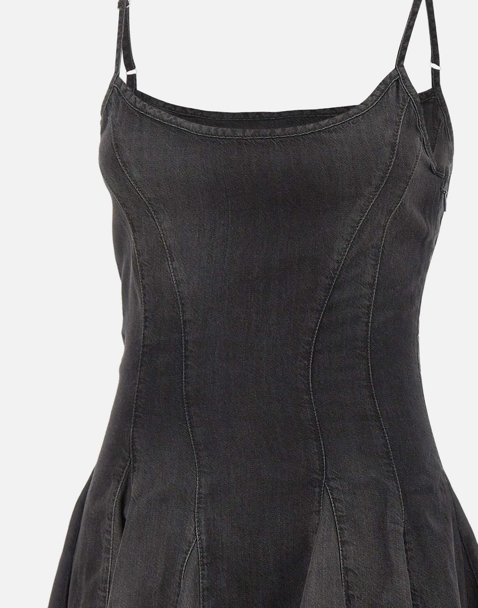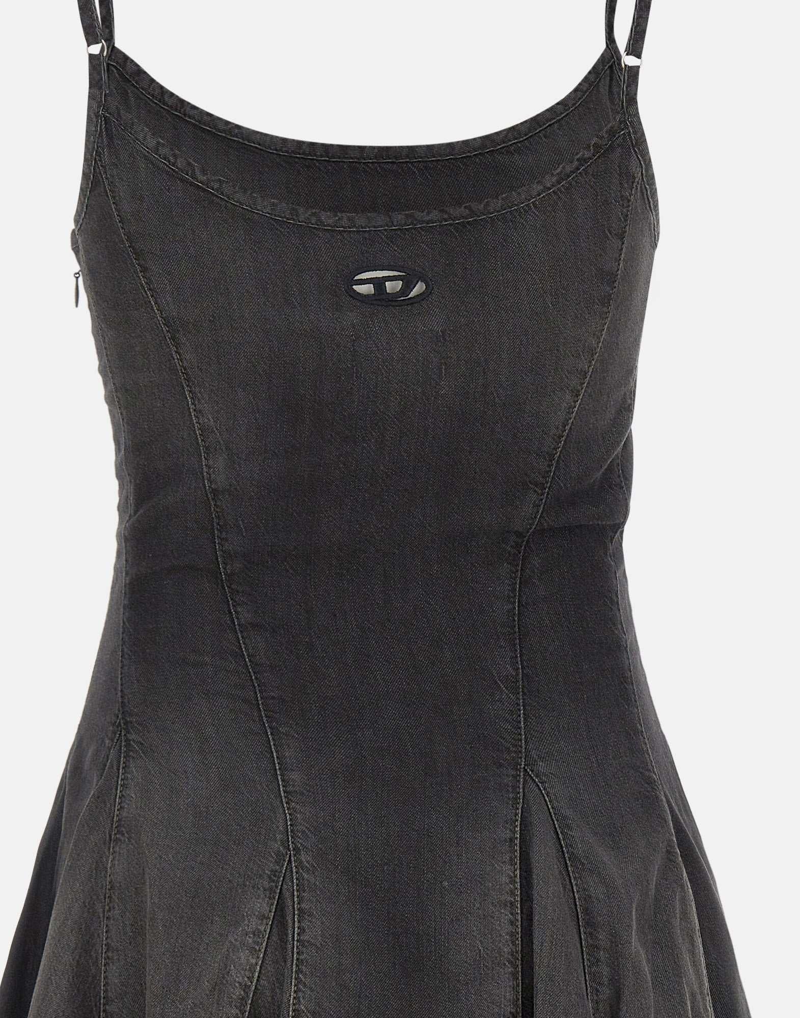 Abito corto donna Diesel "De-Spoky-S" realizzato in misto cotone nero con effetto denim, pensato per un look deciso e contemporaneo. Il design presenta bretelline sottili e scollo tondo, mentre la vestibilità slim con vita stretta valorizza la silhouette. La gonna a balze aggiunge movimento e femminilità al capo. Rifinito con chiusura laterale con zip invisibile e logo Oval D ricamato cut out sul retro, dettaglio iconico che firma il modello con carattere.