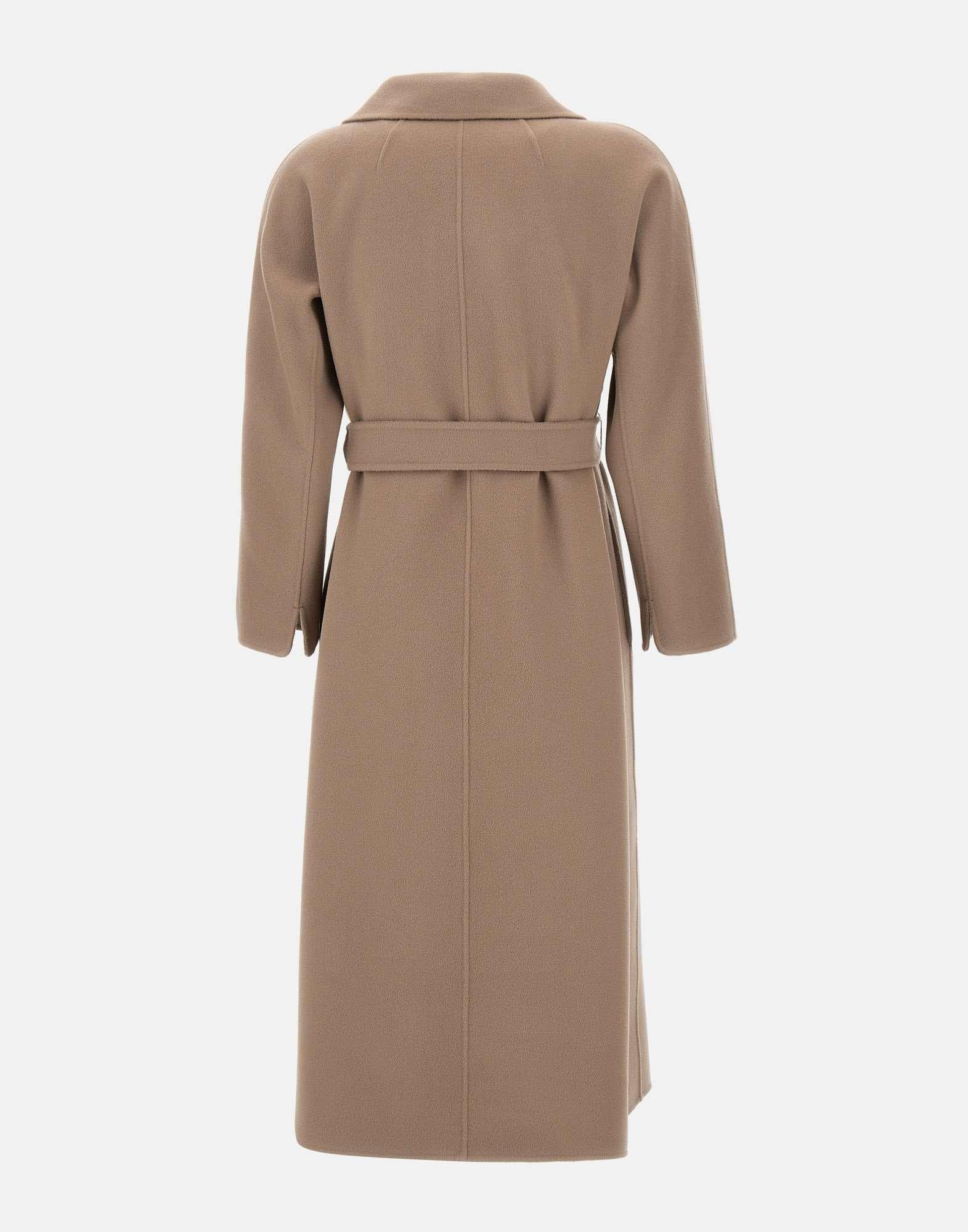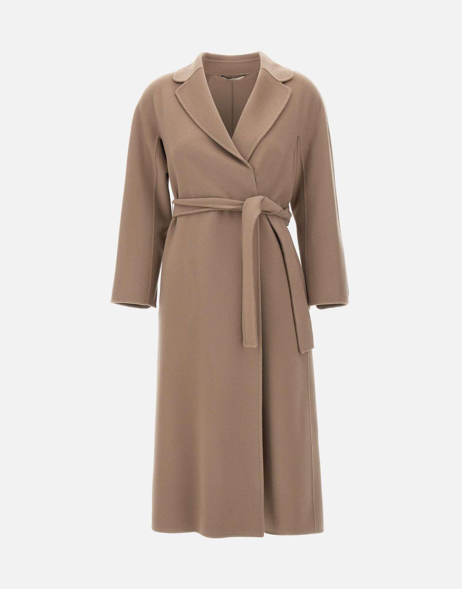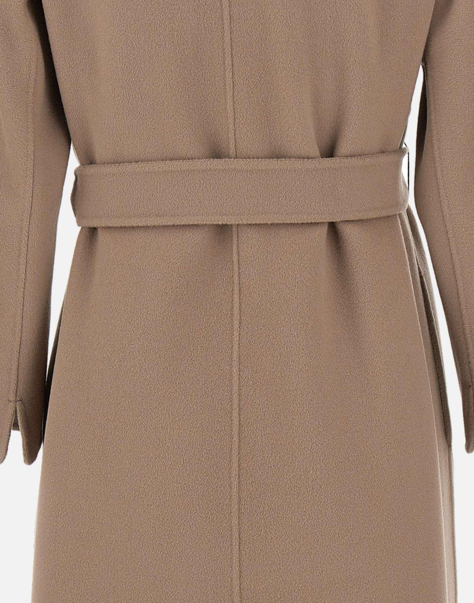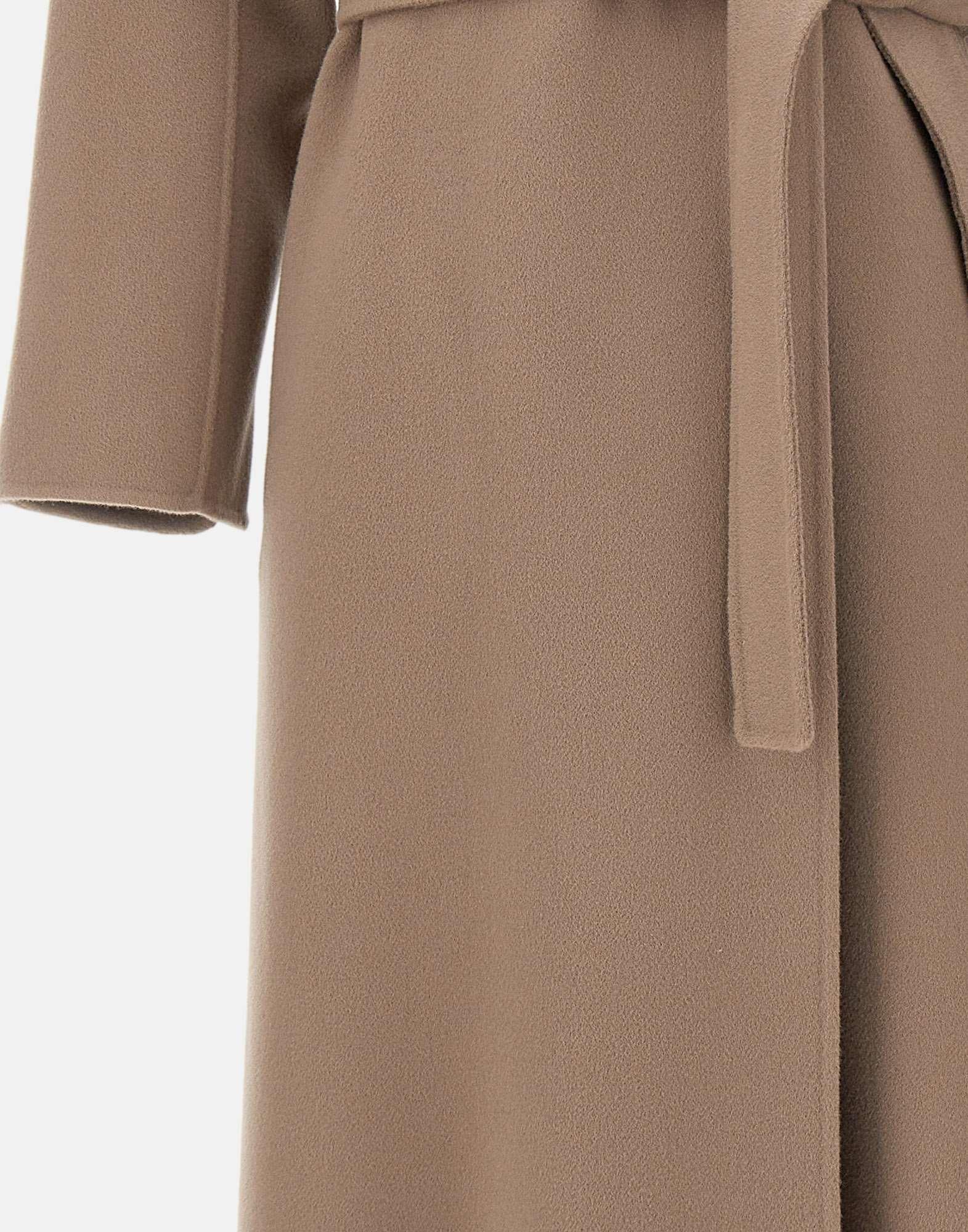 Cappotto 'S Max Mara "Esturia", grigio tortora, midi, drap di pura lana cucito a mano, linea dritta leggermente svasata al fondo, rever stretto, maniche lunghe a kimono,chiusura a vestaglia con cintura abbinata, tasche laterali a filo, sfoderato, spalle raglan, relaxed fit.