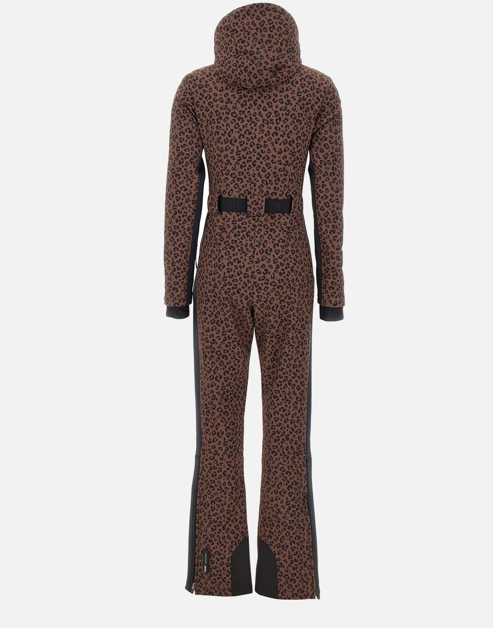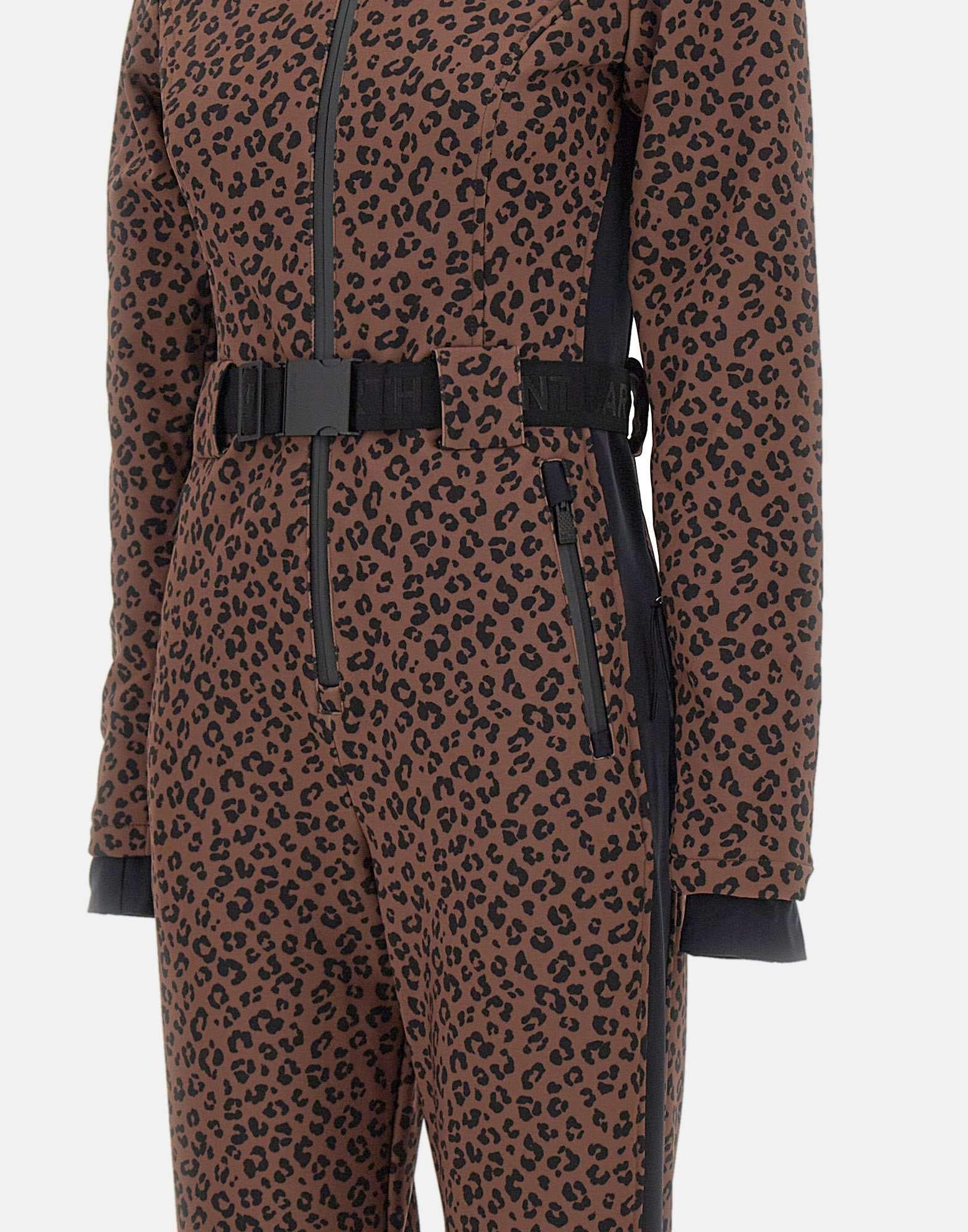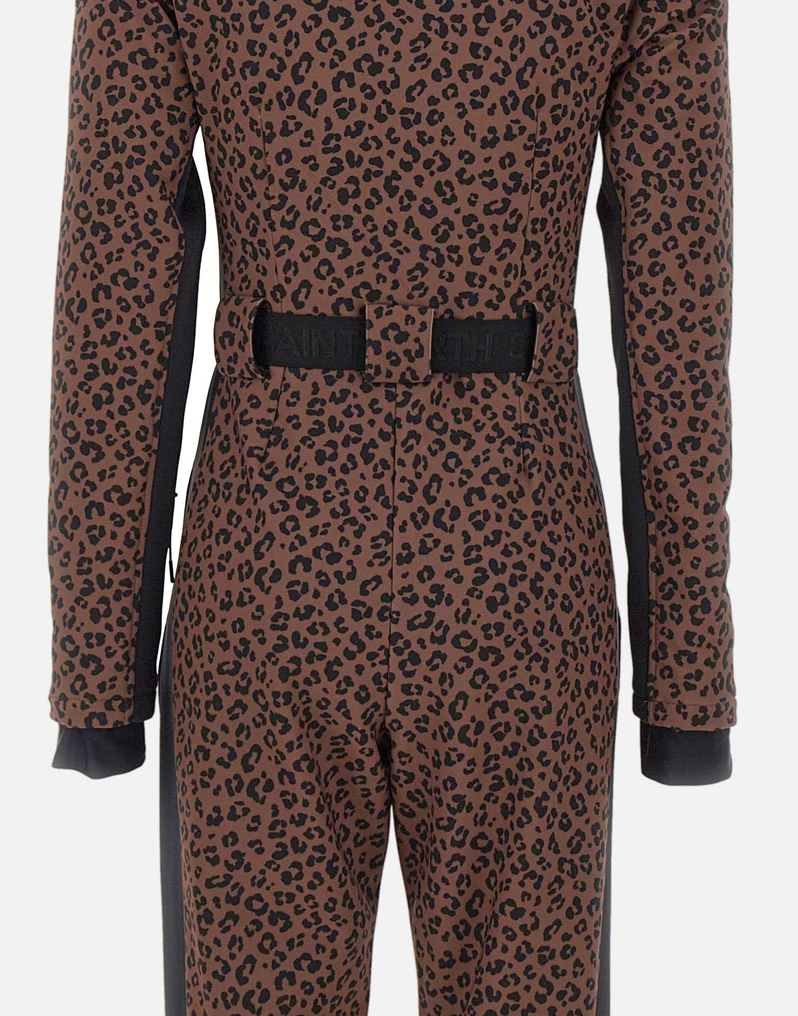 Tuta da sci "Garmisch" Mc2 Saint Barth da donna, stampa animalier nera e marrone, unisce prestazioni tecniche e stile sofisticato. Realizzata in materiali impermeabili e traspiranti di alta qualità con tecnologia Recco e Primaloft, assicura protezione da freddo, vento e umidità. Il design ergonomico e aderente garantisce libertà di movimento sulle piste.