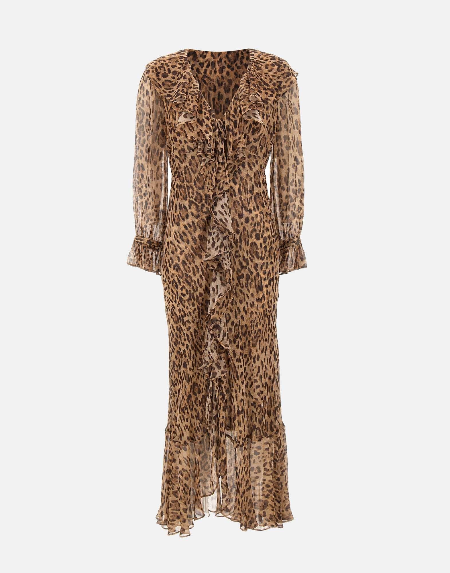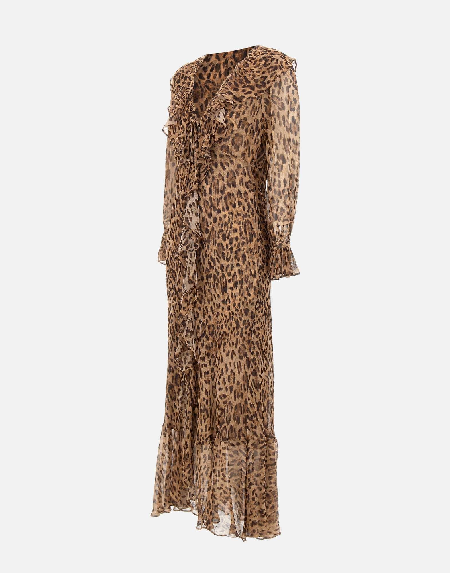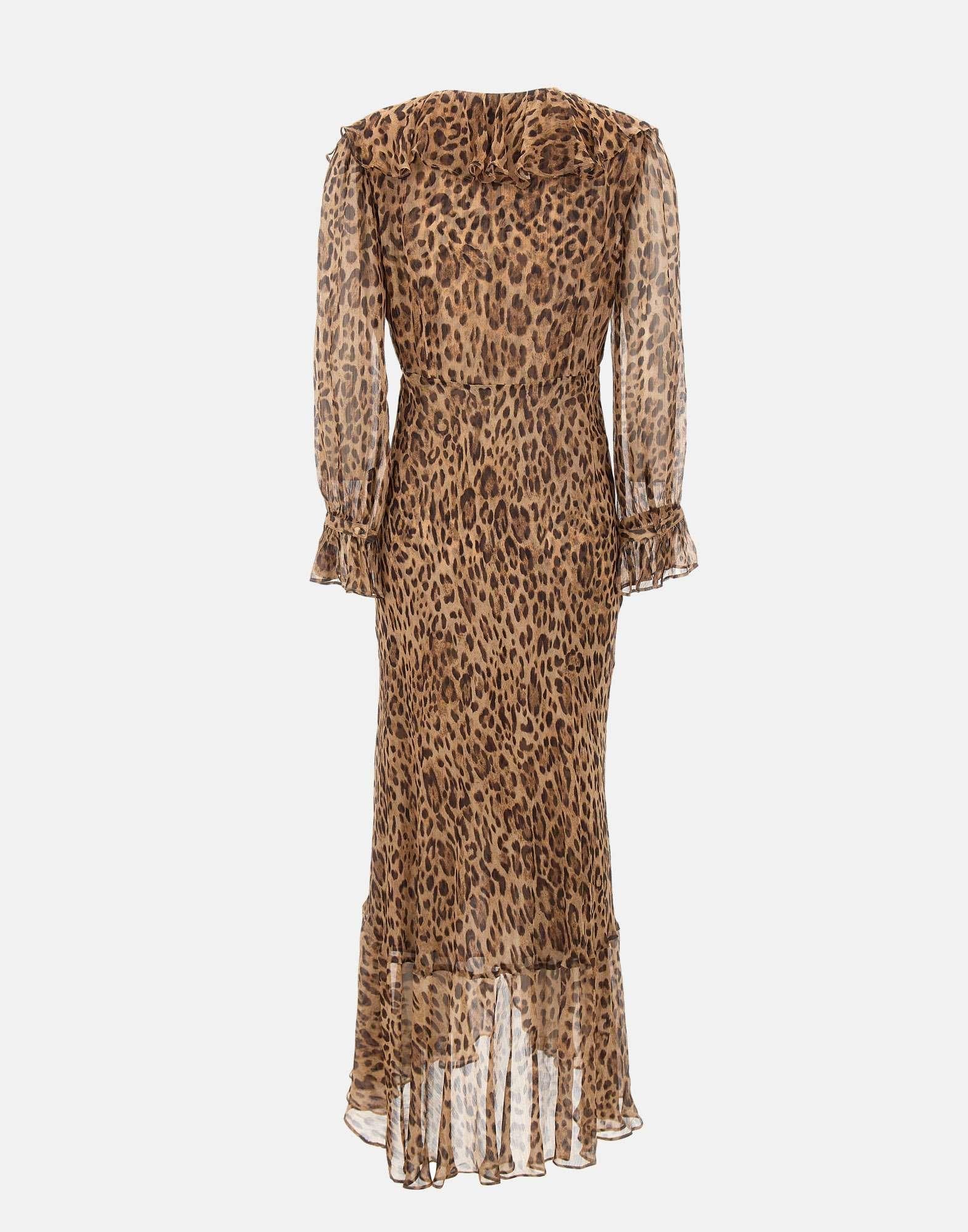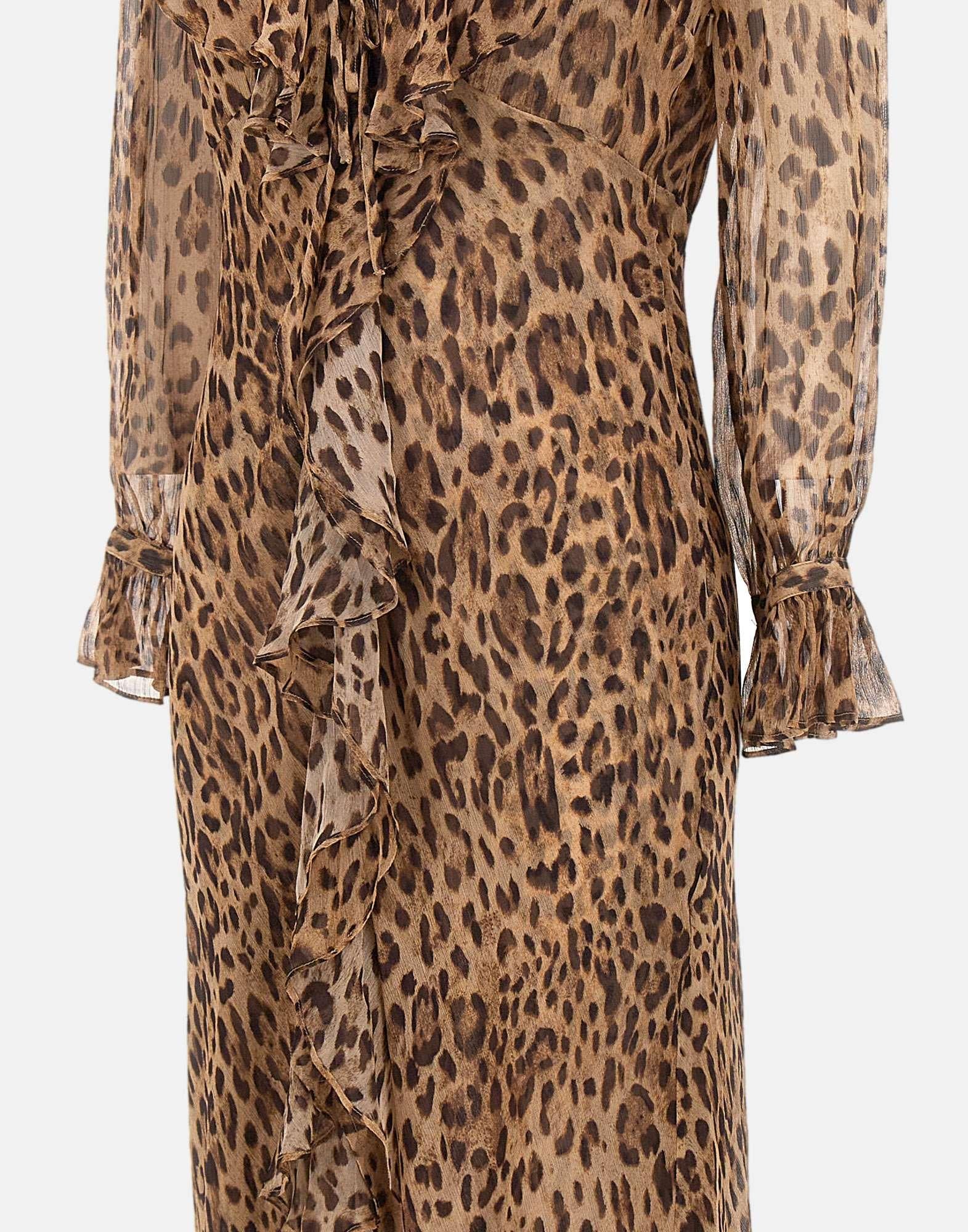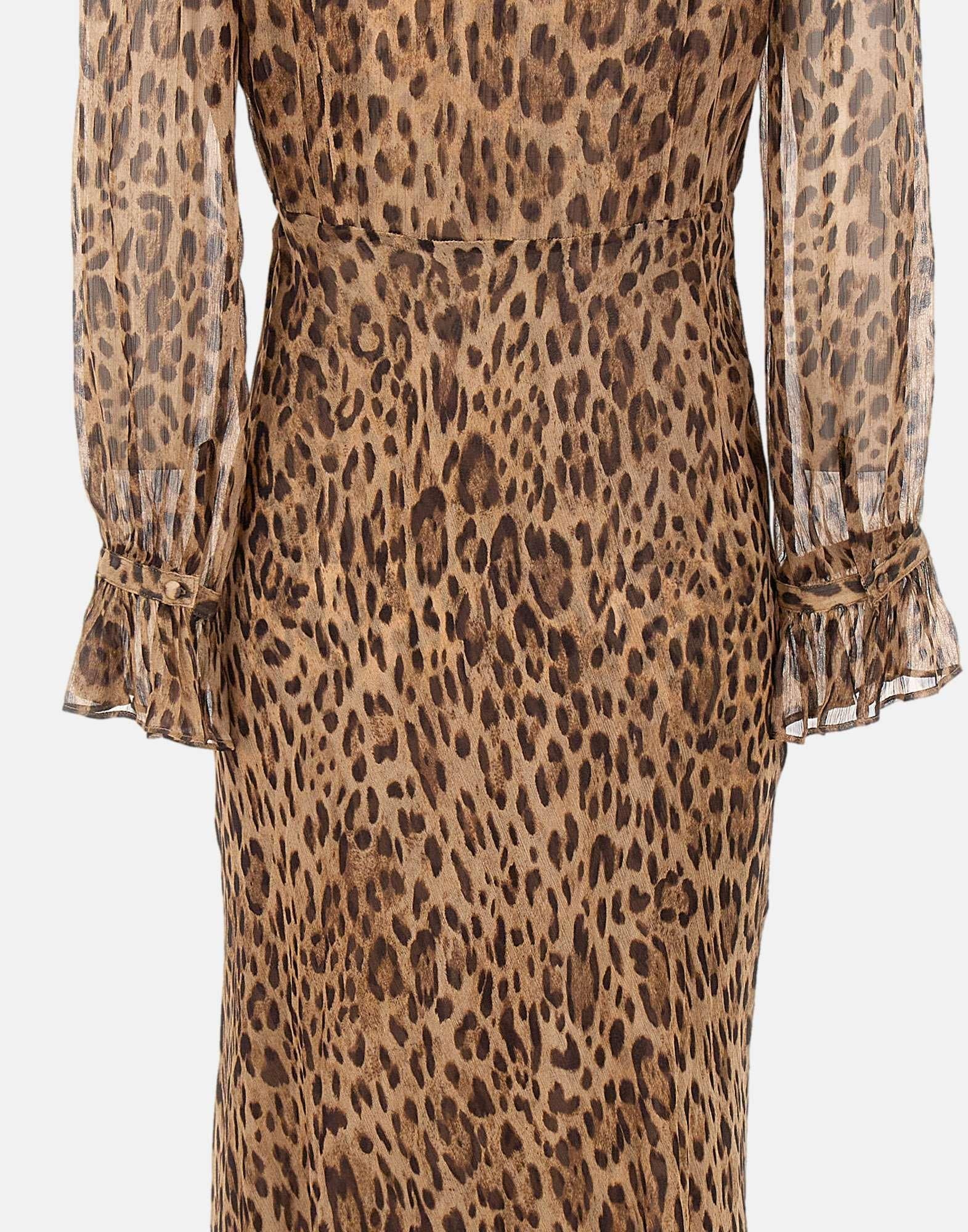 Abito lungo Rixo "Grayce" realizzato in crepe di viscosa con fantasia animalier nei toni del marrone. Il design elegante e fluido presenta collo lavallière con fiocco, scollo a V, abbottonatura frontale e zip laterale nascosta. I polsini abbottonati con volant aggiungono un tocco romantico, mentre lo spacco centrale sul davanti dona movimento e femminilità alla silhouette. Parzialmente foderato, con vestibilità regolare. Un capo raffinato e versatile, ideale per occasioni speciali.