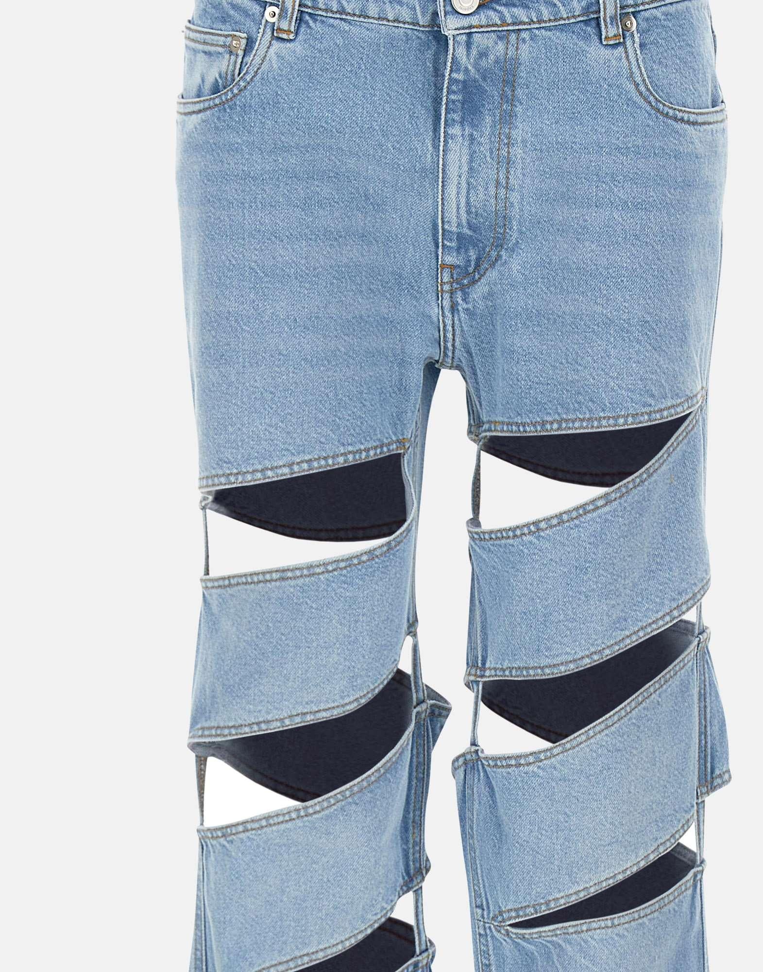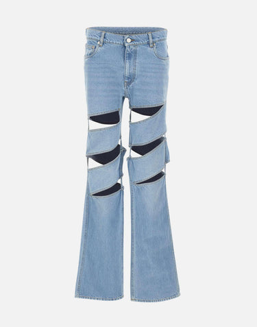 Jeans donna Coperni "Spiral" realizzati in denim di cotone azzurro con vestibilità dritta. Il design è caratterizzato da ritagli a spirale che avvolgono le gambe, creando una costruzione grafica e aperta, audace ma equilibrata da una linea complessivamente pulita. Modello cinque tasche con chiusura con zip e bottone e patch logo sul retro. Ampiezza fondo: 22 cm.