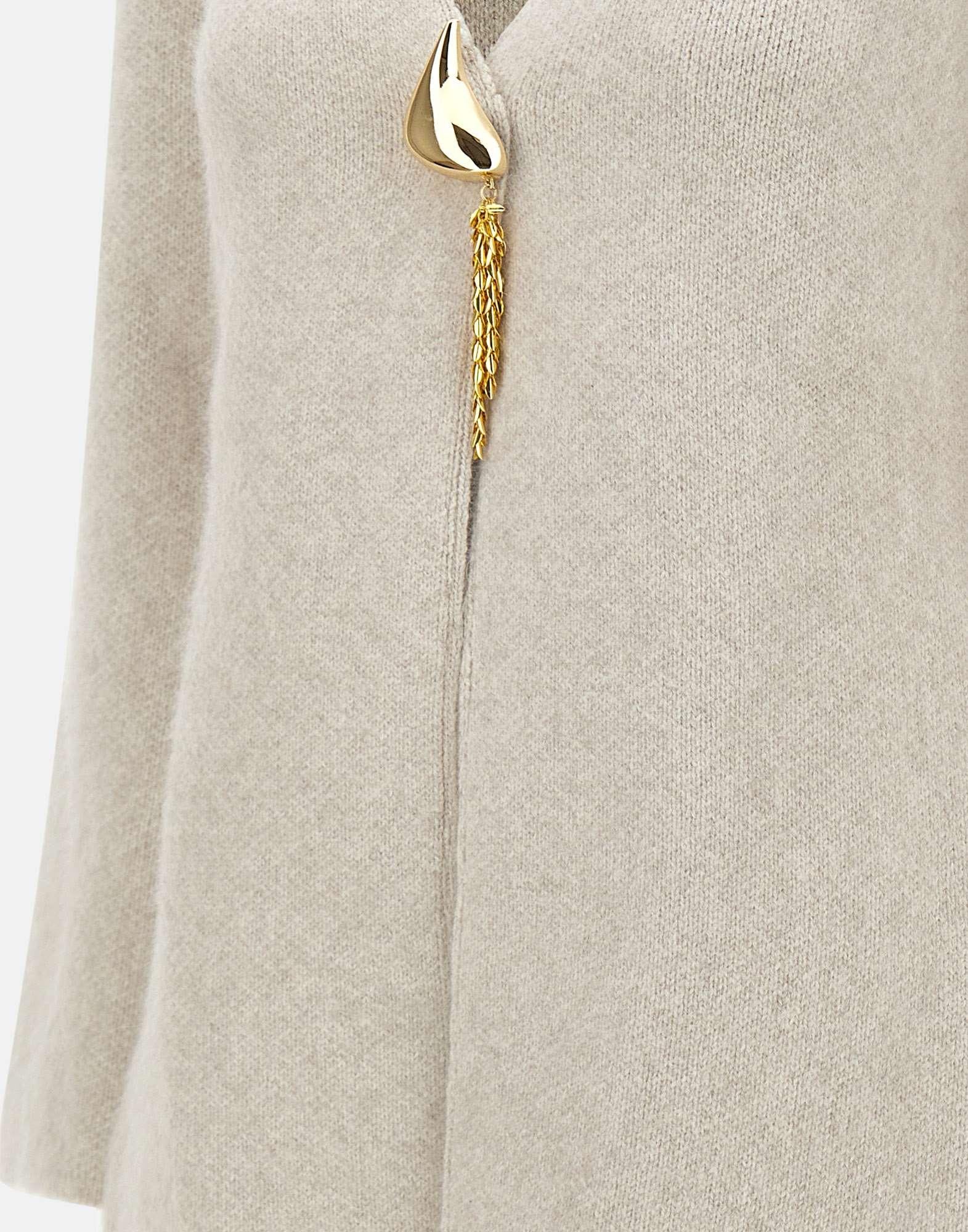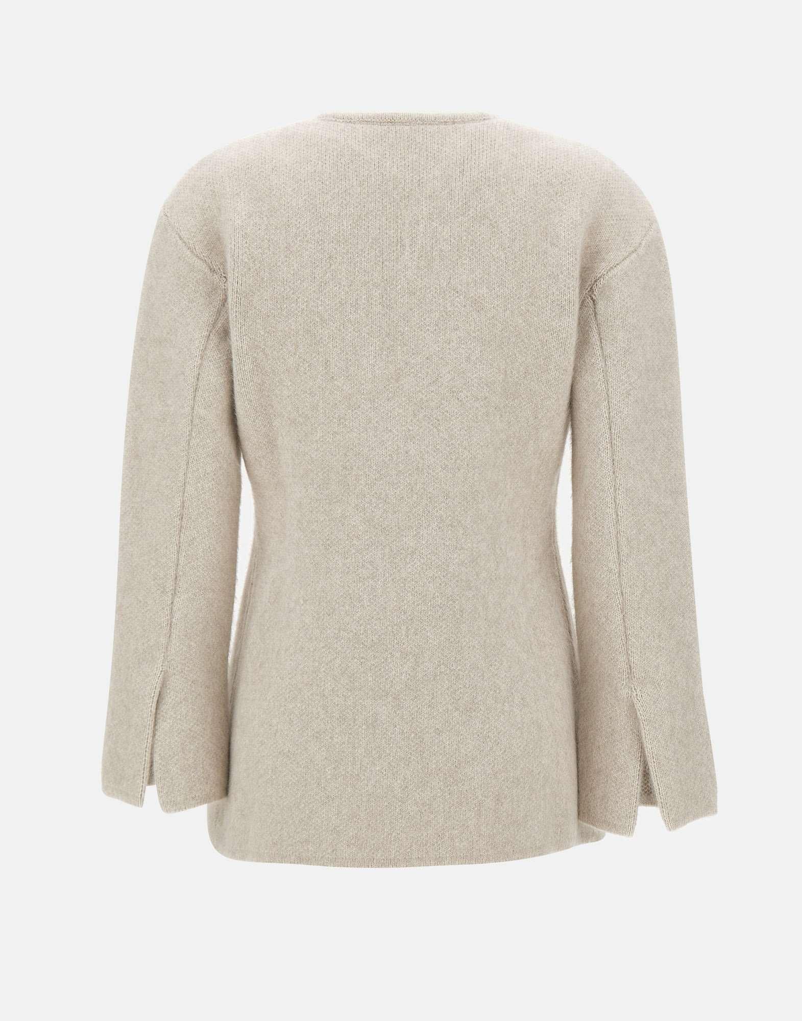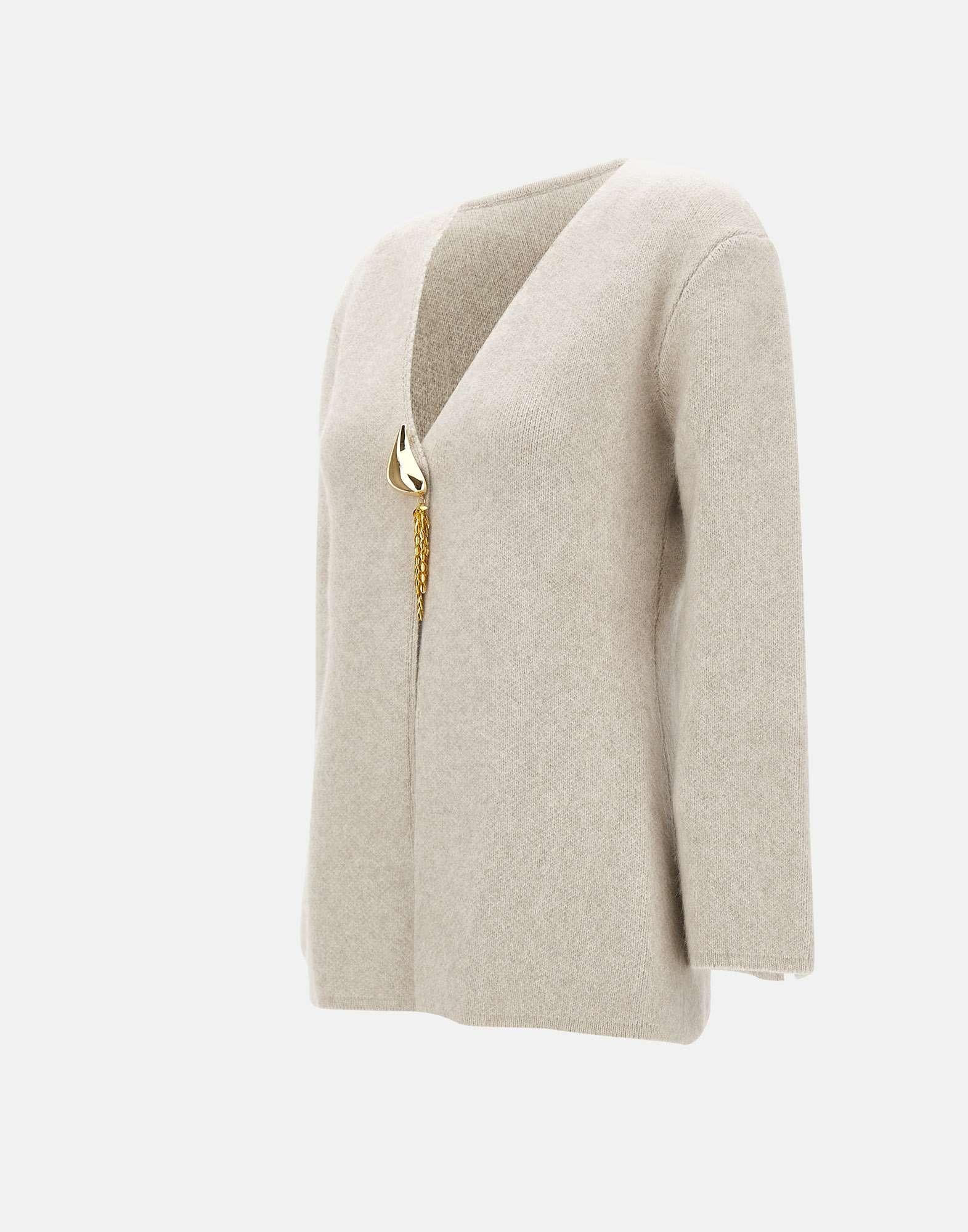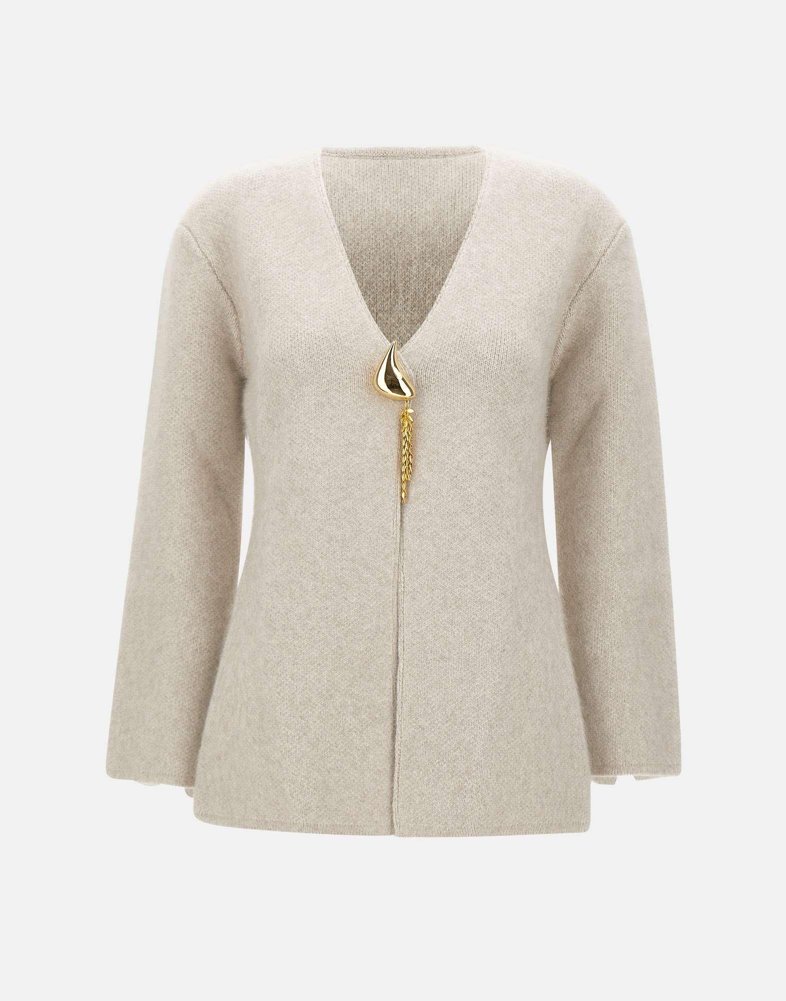 Cardigan Jacques Wei "Offwhite Golden Button" in misto lana soffice, colore ecrù. Un modello elegante e femminile con scollo a V, maniche lunghe e una linea leggermente aderente in vita che valorizza la silhouette. Il design è impreziosito dalliconico maxi bottone a goccia dorato come chiusura centrale. Le spalle scese e la vestibilità relaxed completano il look contemporaneo.