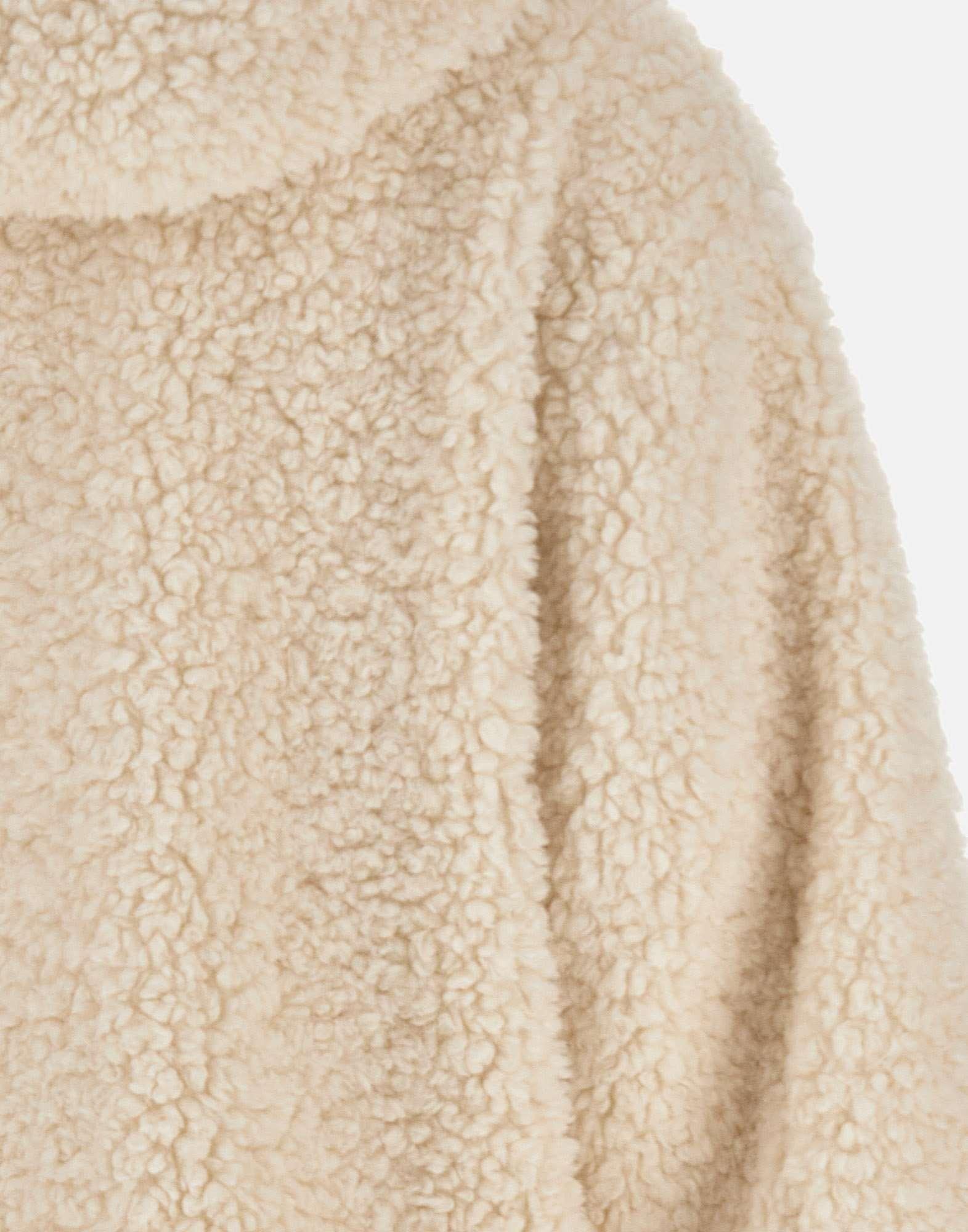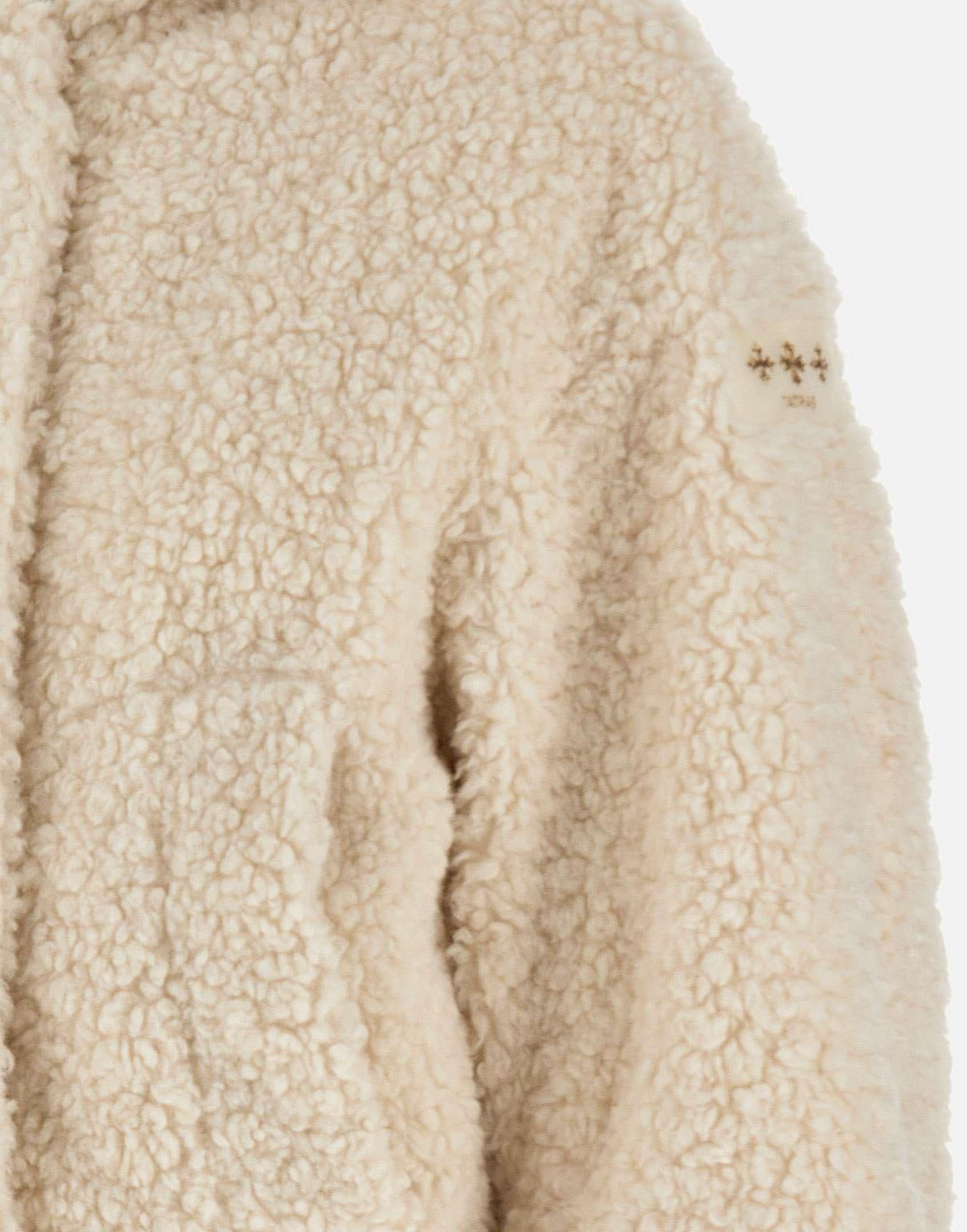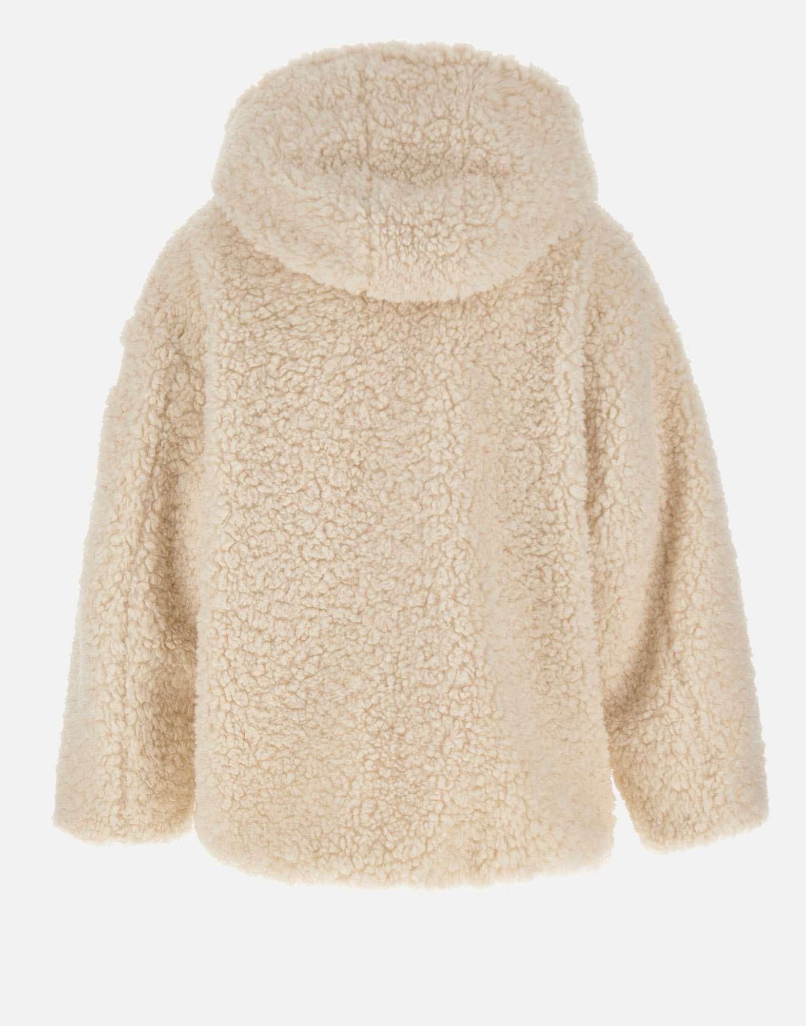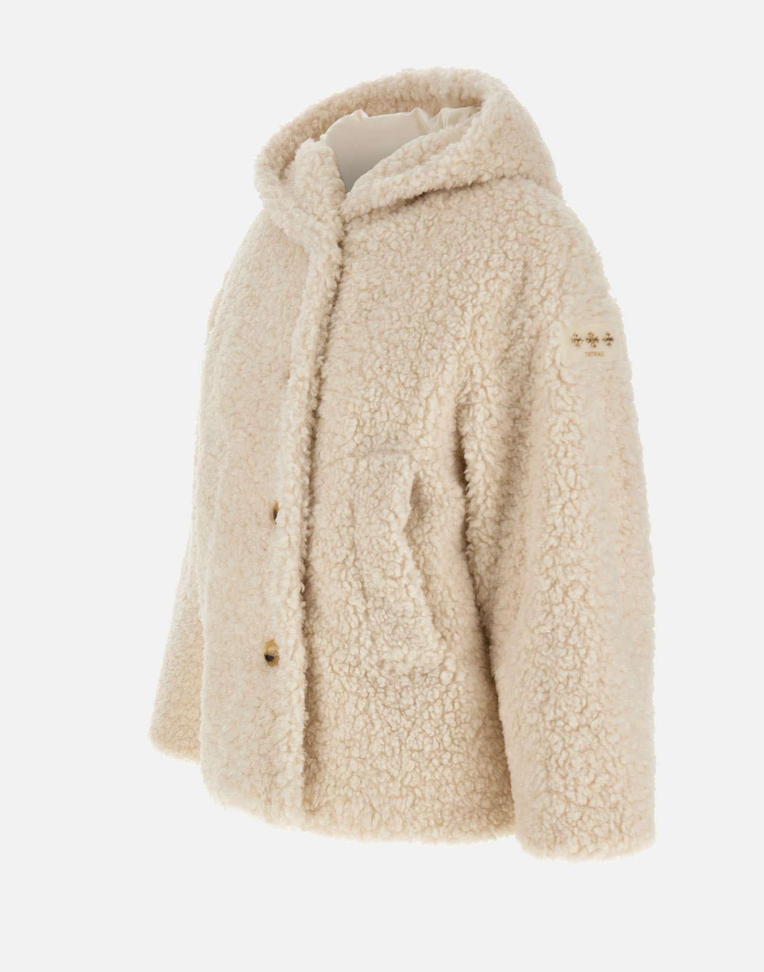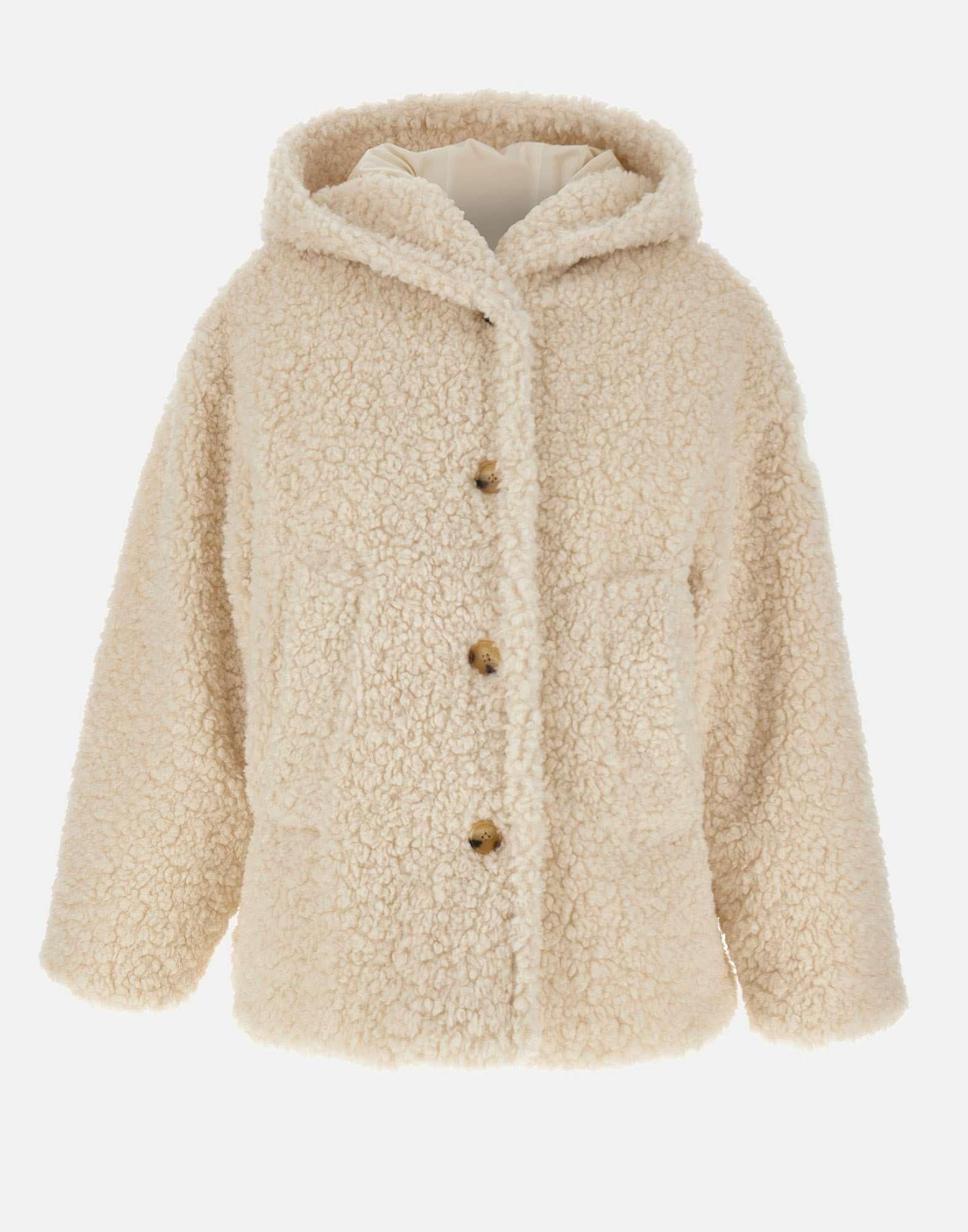 Pelliccia ecologica Tatras, colore bianco latte, dal soffice effetto teddy. Modello con cappuccio e chiusura frontale con maxi bottoni, tasche laterali a fessura e interno foderato. Le spalle scese e il fit relaxed completano un design caldo e contemporaneo, ideale per look casual-chic della stagione invernale.