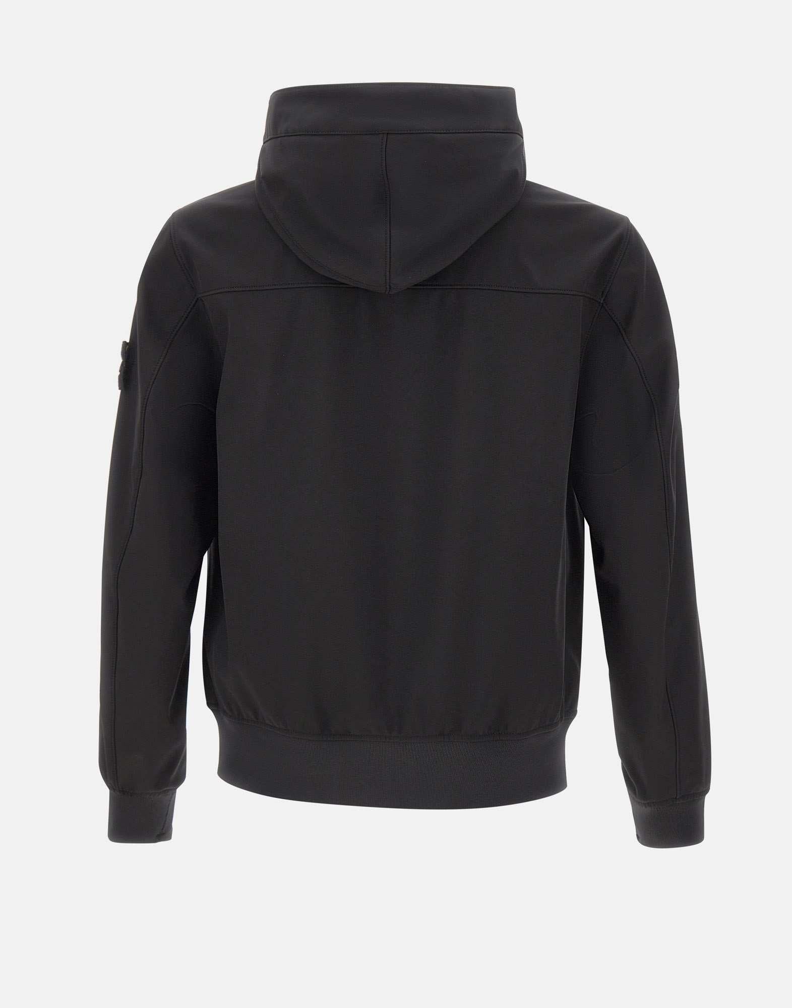 Giacca uomo Stone Island "Light Soft Shell-R E. Dye Technology" in materiale tecnico a tre strati color nero, con colonna d'acqua di 8000 mm, pensata per un guardaroba urbano e funzionale. La superficie esterna in tela di poliestere stretch è tessuta con filati a tecnologia e.dye Waterless Color System, sistema di saturazione del colore dei filati. La struttura esterna del materiale offre comfort e flessibilità impareggiabili. Presenta cappuccio con coulisse interna, tasche oblique con zip nascosta e polsini e fascia inferiore a costine che definiscono la linea. Chiusura con zip a doppio cursore sotto patta con bottoni automatici. Patch Stone Island sulla manica sinistra. Vestibilità regolare, ideale come giacca tecnica per la mezza stagione.