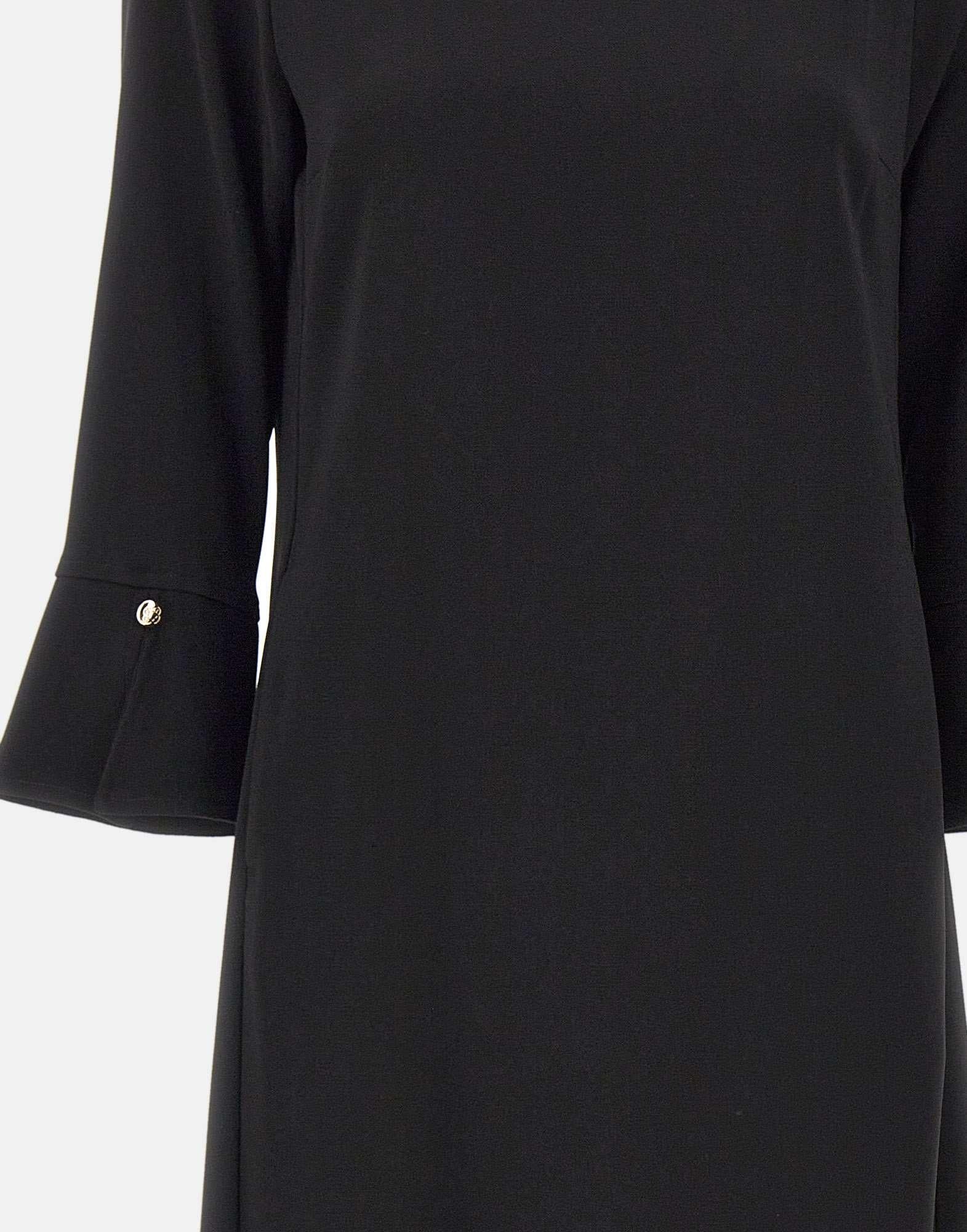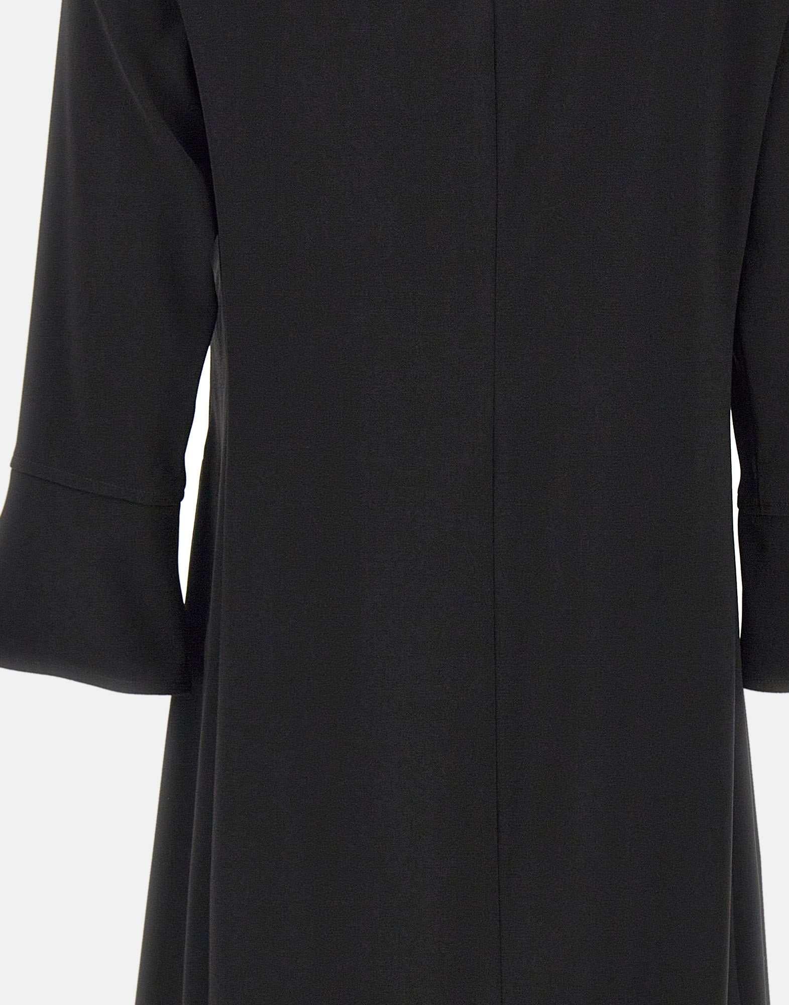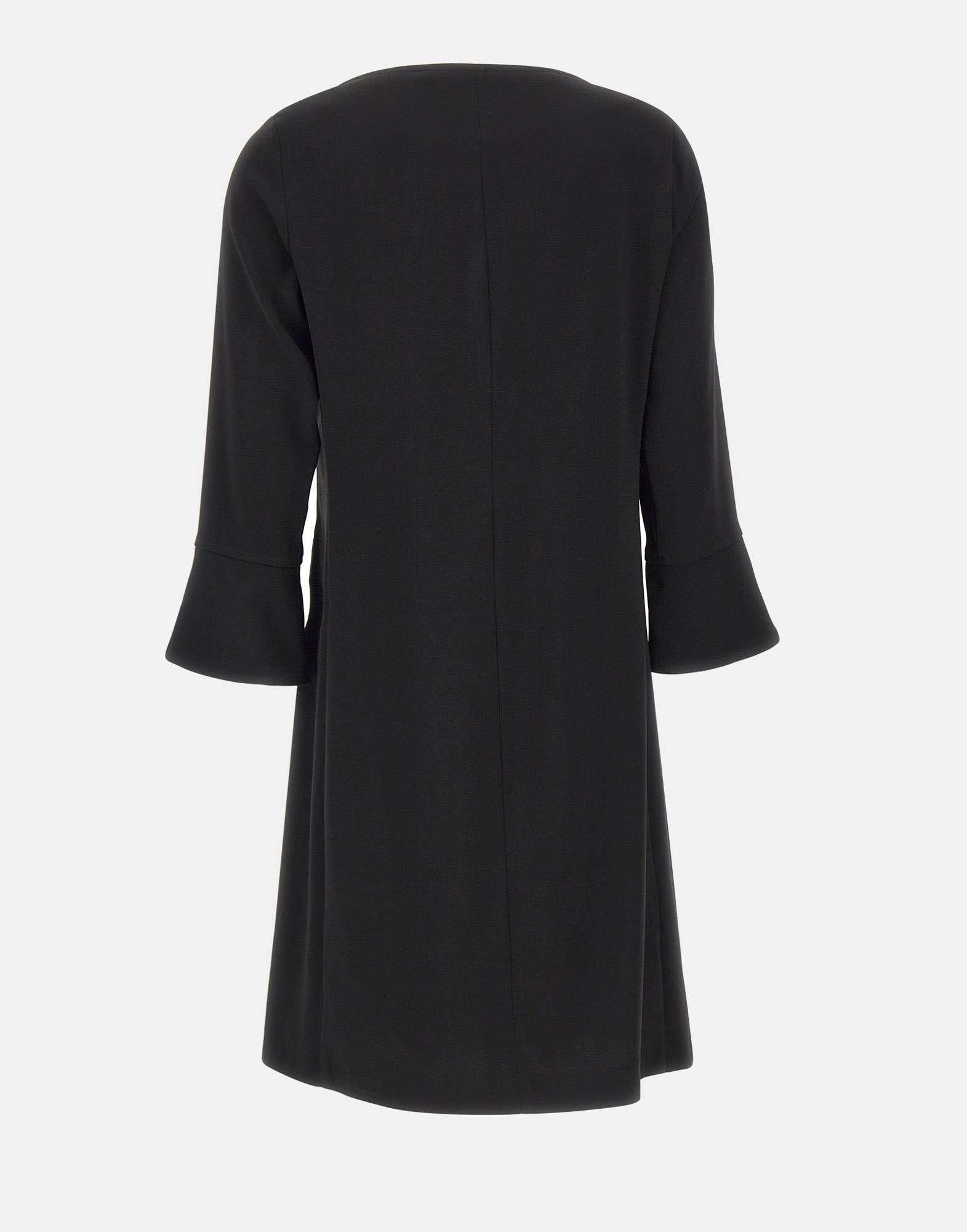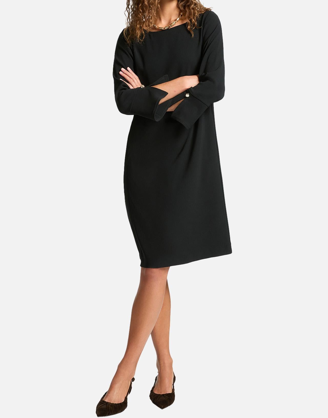 Abito Elena Mirò in crepe stretch colore nero, elegante e confortevole. Caratterizzato da scollo a barchetta, maniche a sette ottavi con spacchetto e bottone gioiello, tasche laterali a filo. Regular fit, ideale per look da giorno e da sera, con una vestibilità che valorizza la silhouette.