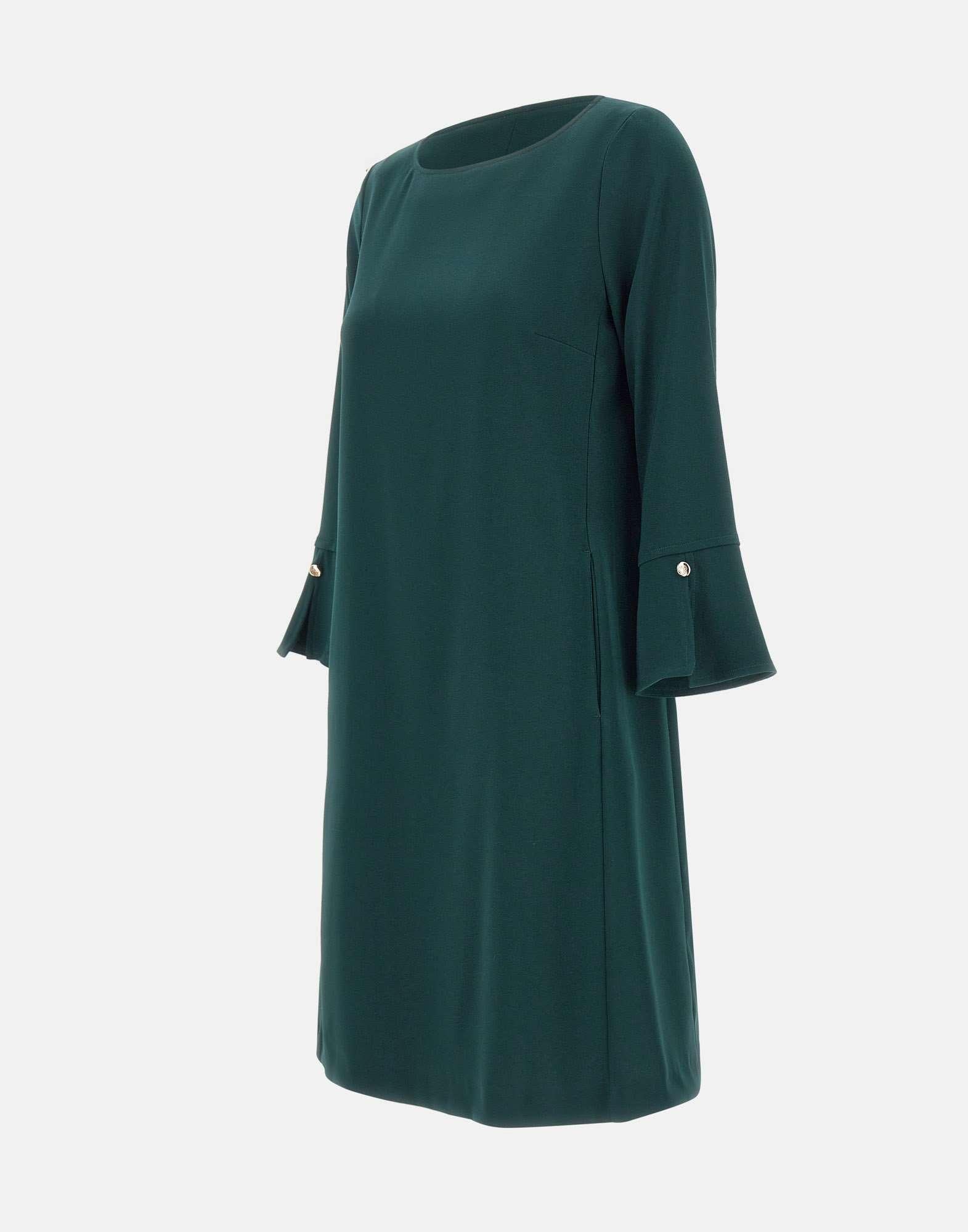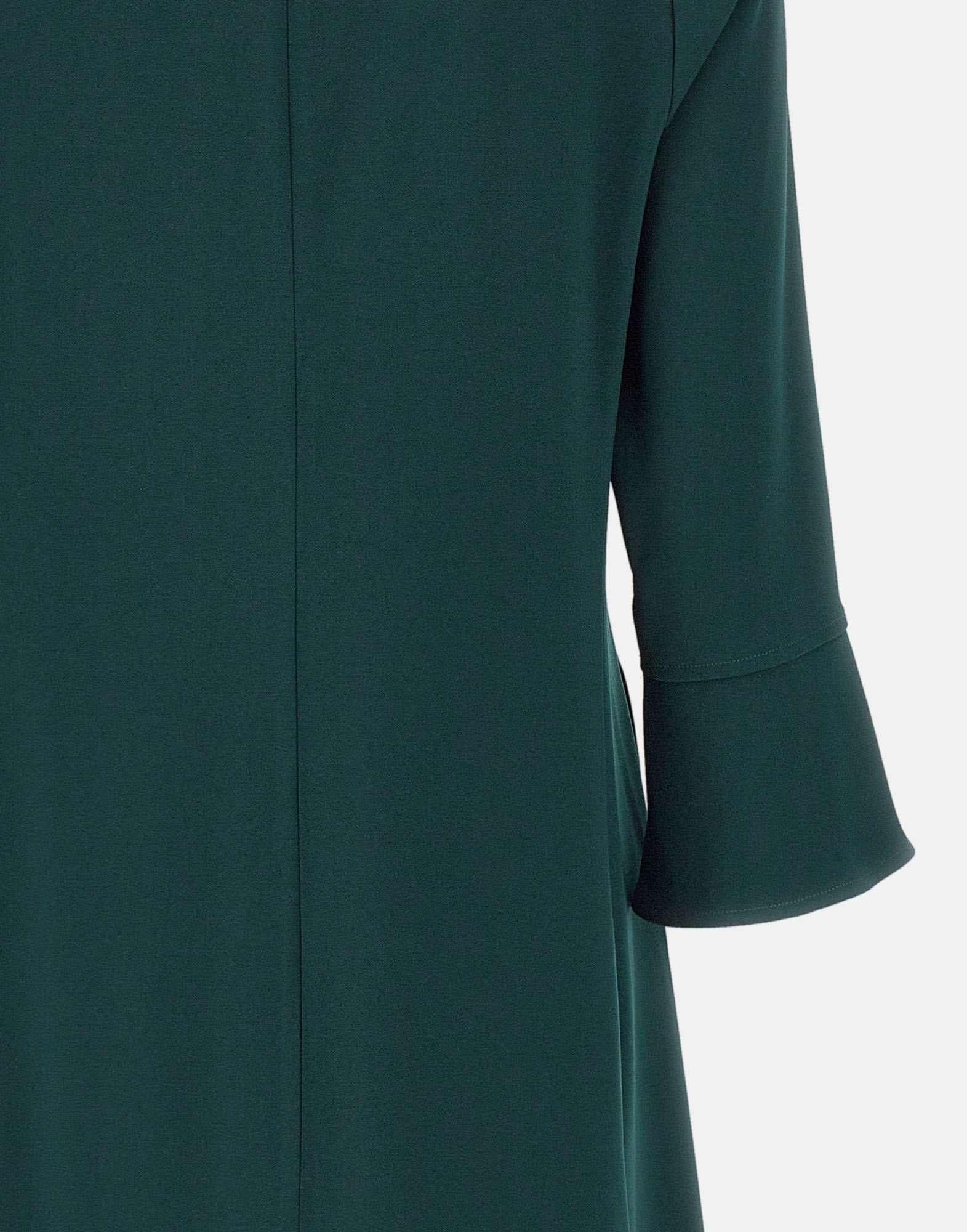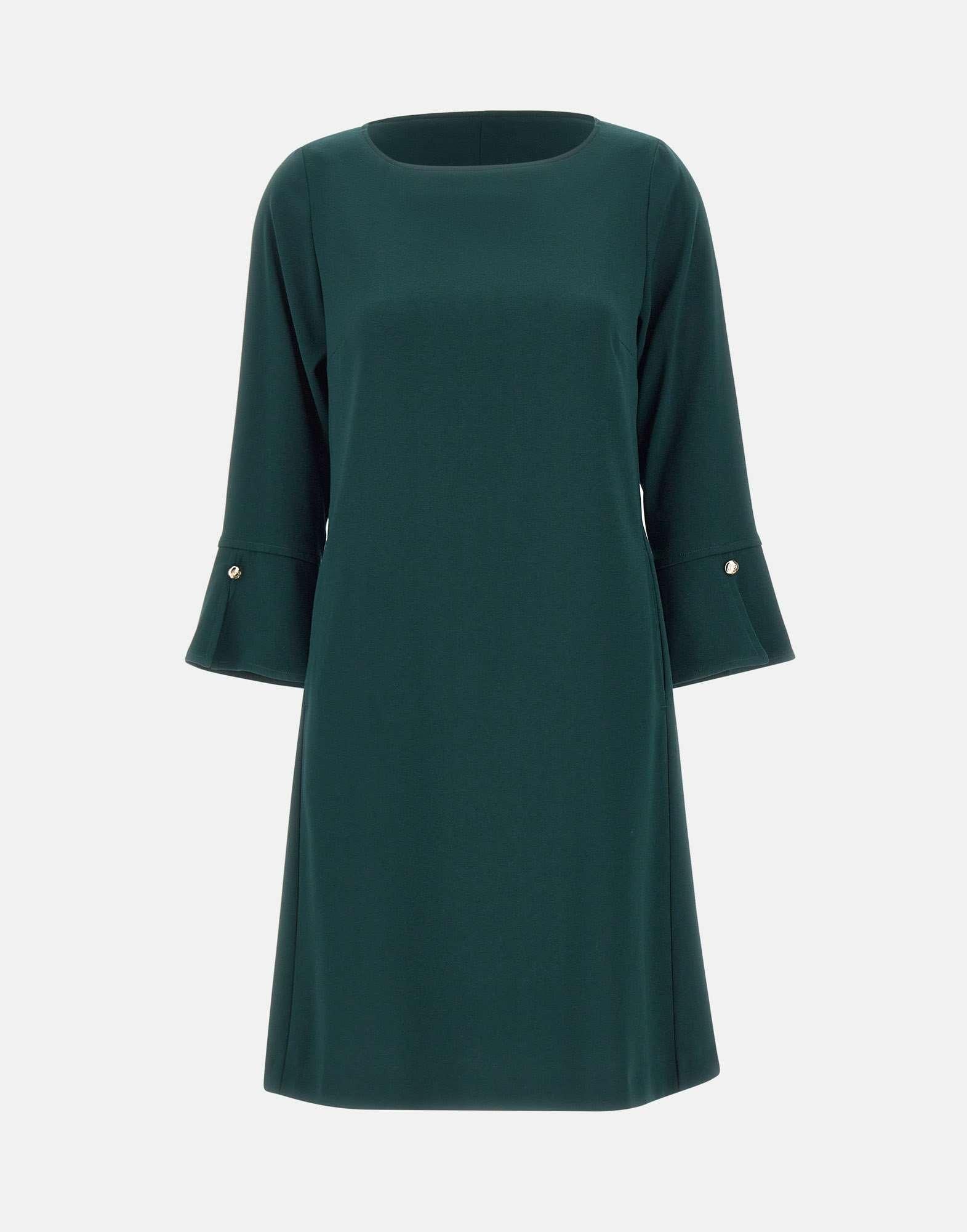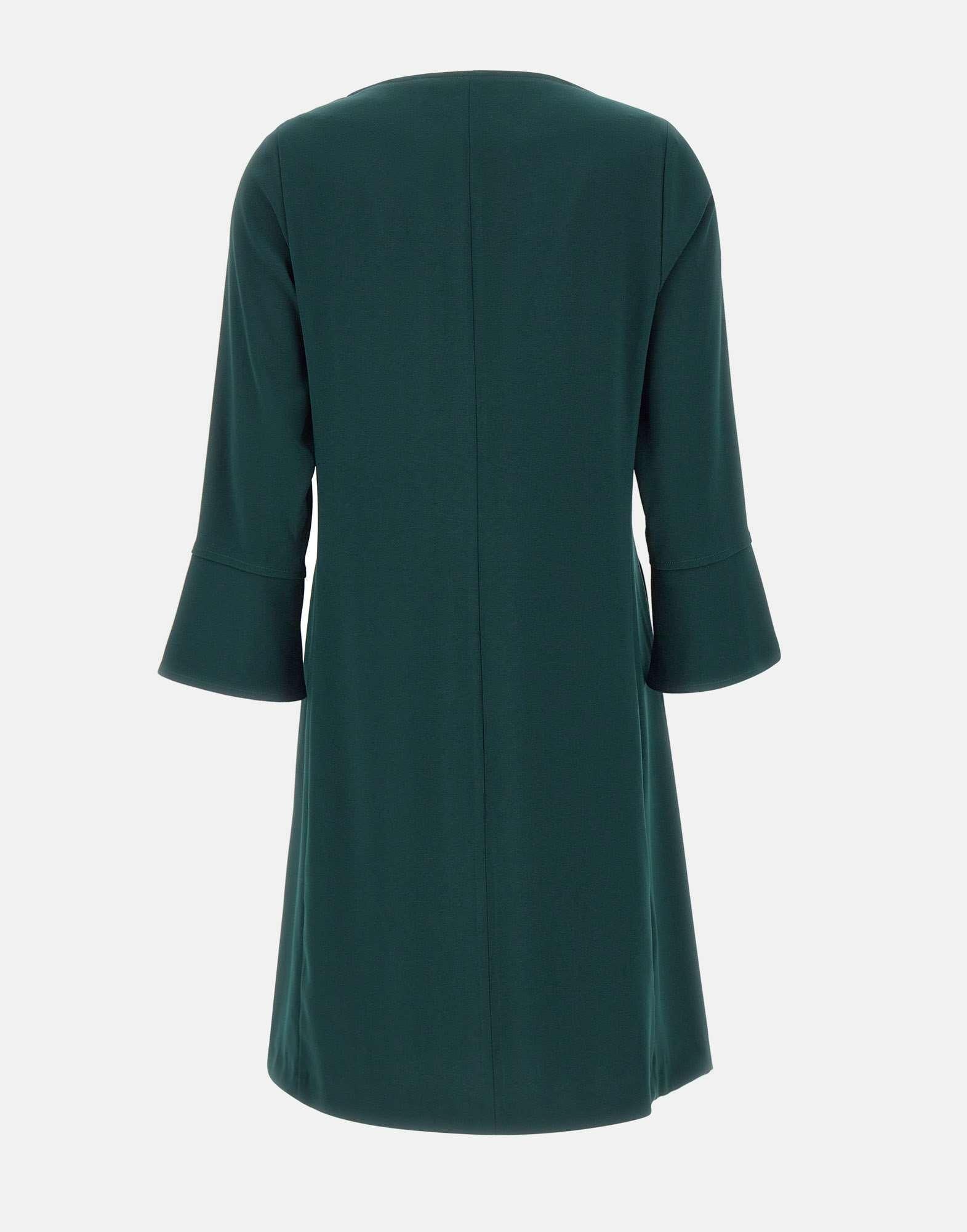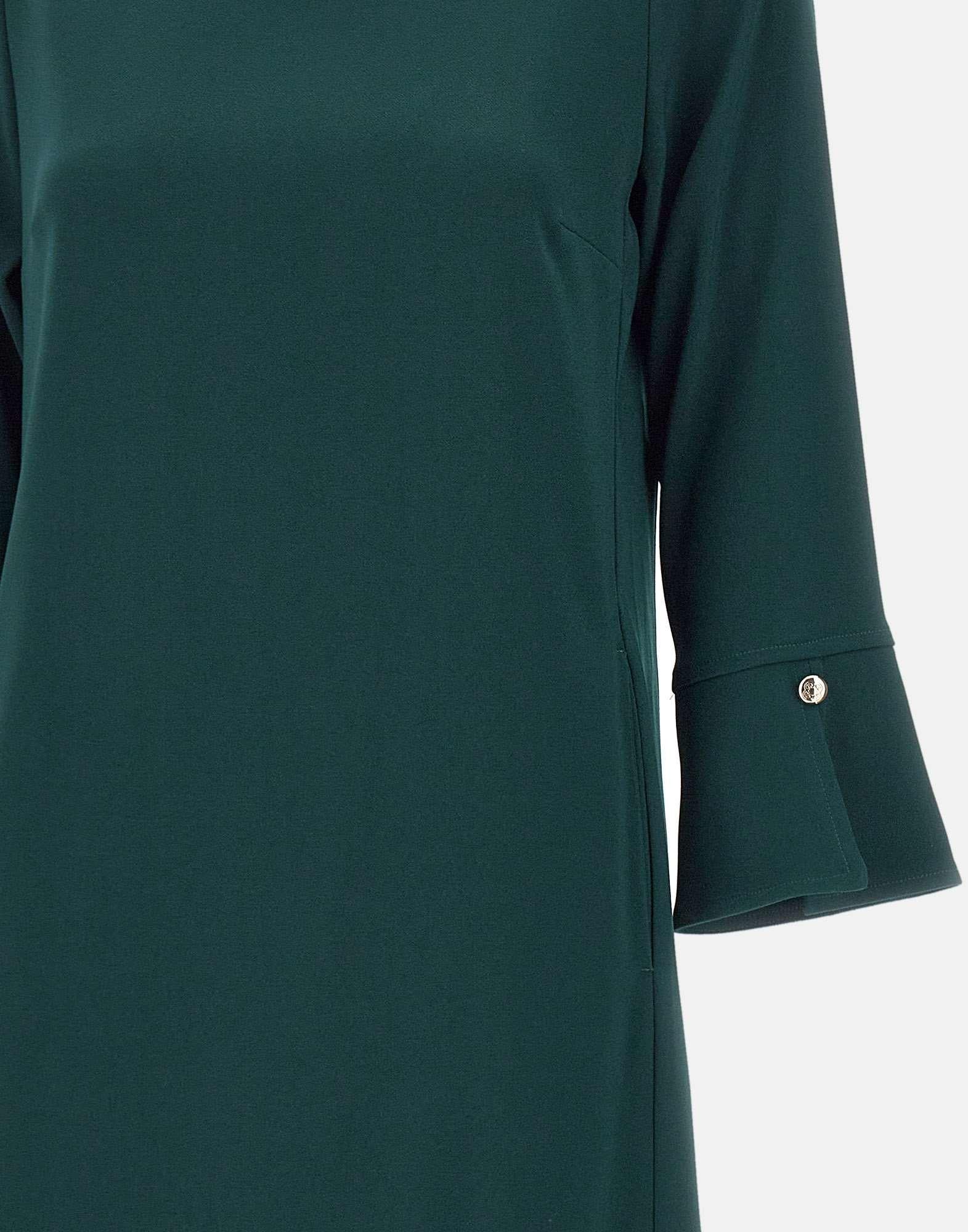 Abito Elena Mirò in crepe stretch verde bottiglia, elegante e confortevole. Caratterizzato da scollo a barchetta, maniche a sette ottavi con spacchetto e bottone gioiello, tasche laterali a filo. Regular fit, ideale per look da giorno e da sera, con una vestibilità che valorizza la silhouette.