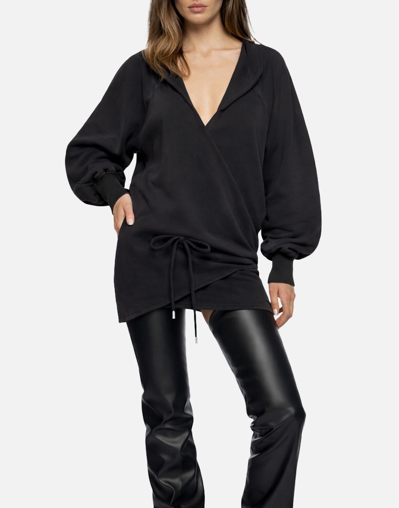 Mini abito The Attico "Faded black" realizzato in pile americano di cotone nero sbiadito, dal carattere casual e sofisticato. Il modello presenta maniche lunghe, cappuccio, scollo a V incrociato e arricciatura sul fianco sinistro con coulisse regolabile in vita che valorizza la silhouette. I polsini a costine elasticizzati completano il design, assicurando comfort e aderenza. Vestibilità regolare per un look urbano e femminile dallo spirito contemporaneo.