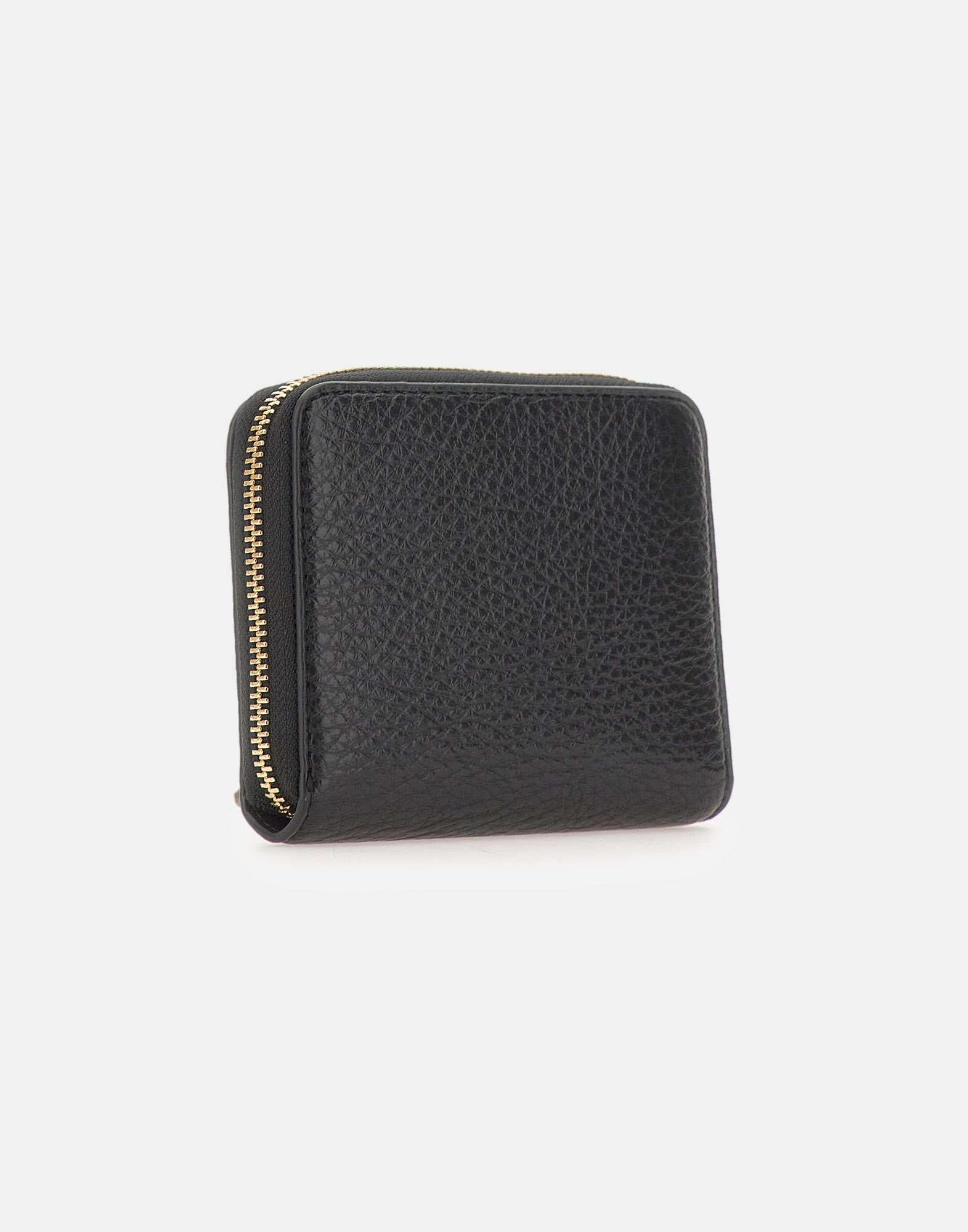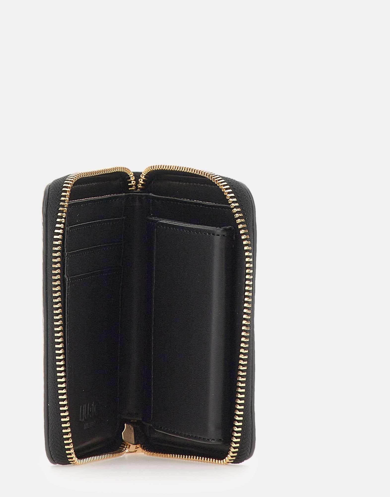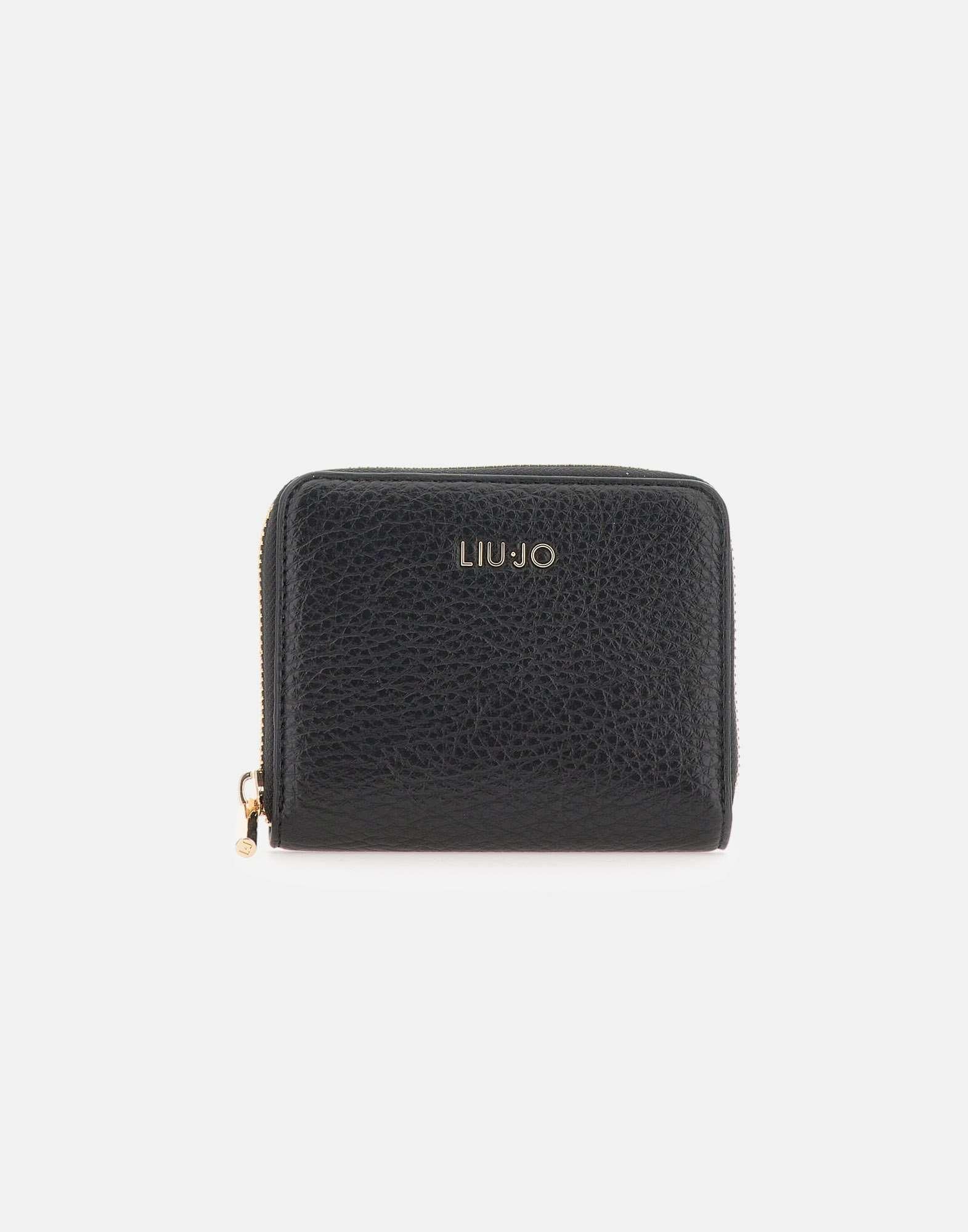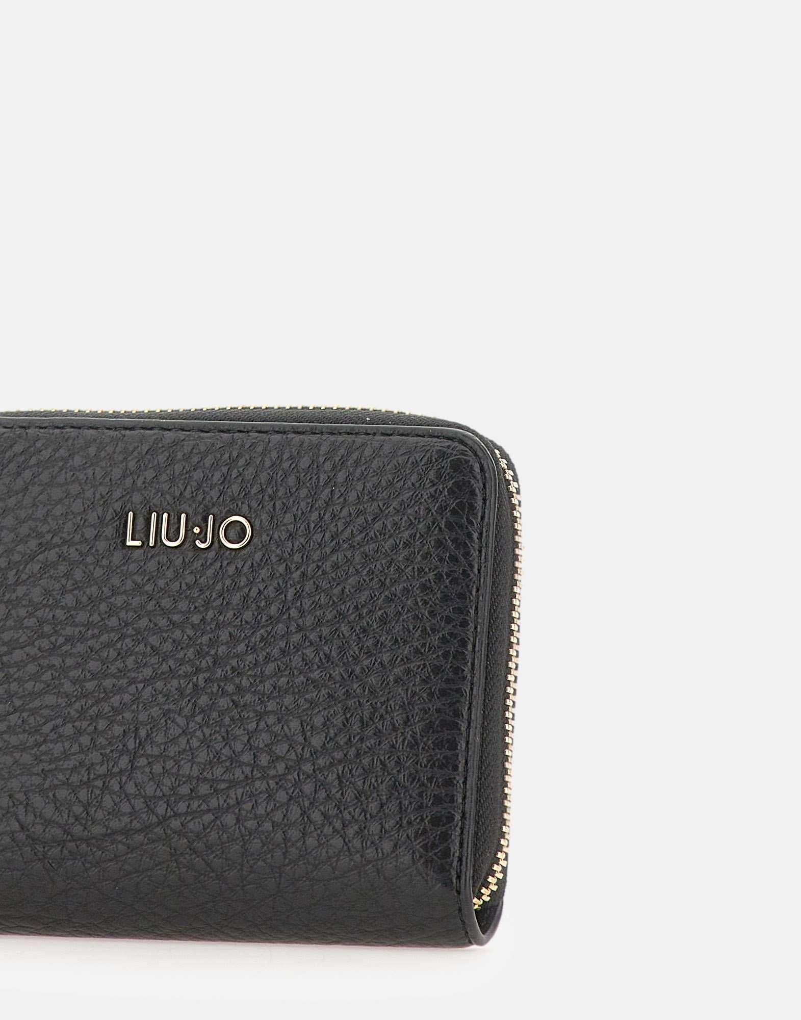 Portafoglio Liu Jo "Caliwen" in ecopelle colore nero con stampa effetto bottalato, raffinato e compatto. Presenta logo in metallo sul davanti, scomparti per carte e tessere, portamonete con patta, scomparto per banconote e logo interno impresso. Chiusura con zip perimetrale. Appartenente alla linea "Liu Jo Better", è realizzato con materiali sostenibili e finiture di qualità. Dimensioni: 12 x 2 x 10 cm.
