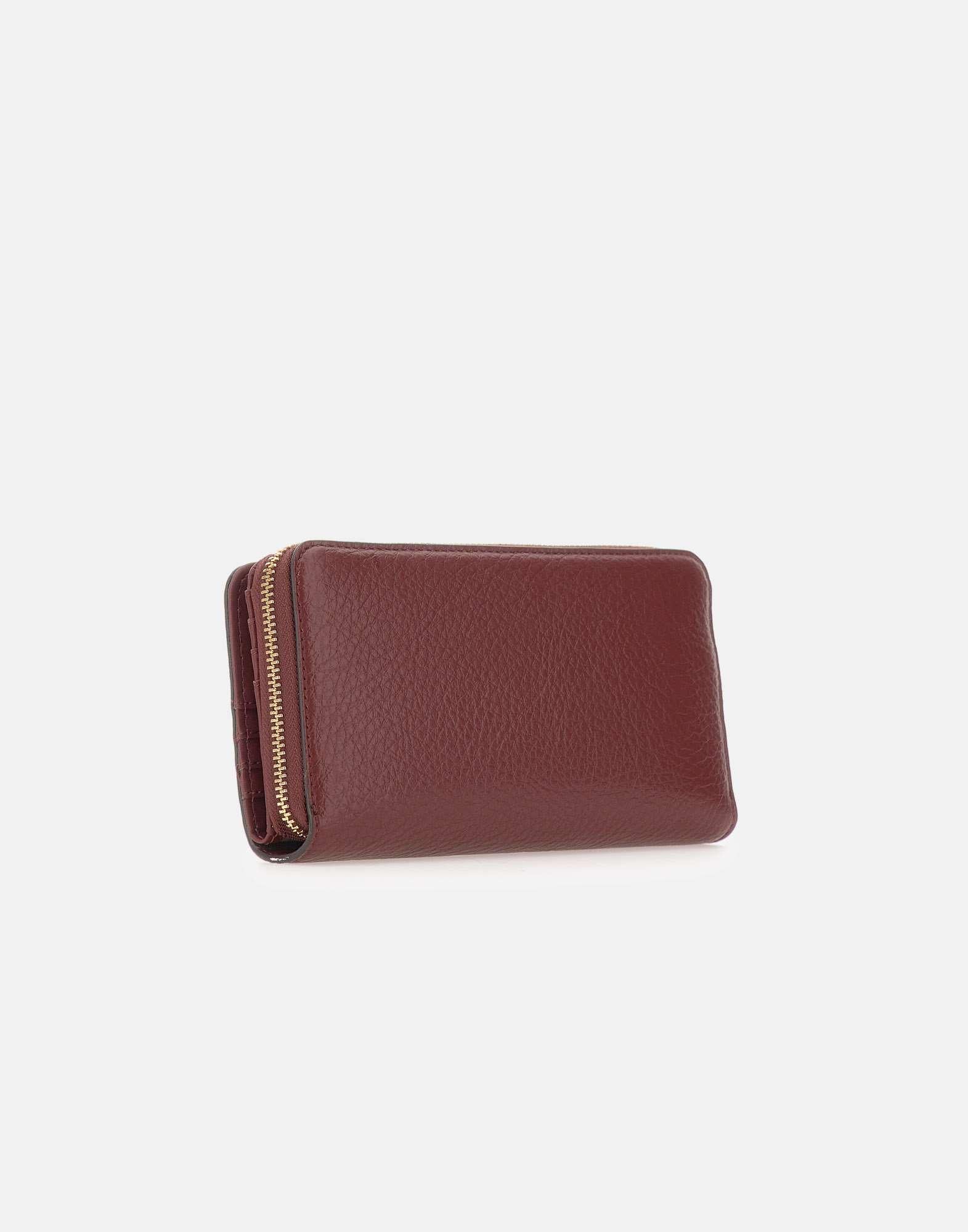 Portafoglio Liu-Jo "Caliwen" in ecopelle borgogna con stampa effetto bottalato, elegante e funzionale. Presenta logo in metallo sul davanti, scomparto interno per carte e tessere chiuso da bottone, scomparto chiuso da zip con altri scomparti per carte e tasca portamonete. Appartenente alla linea "Liu Jo Better", è realizzato con materiali e processi sostenibili. Dimensioni: 19 x 2 x 10 cm.