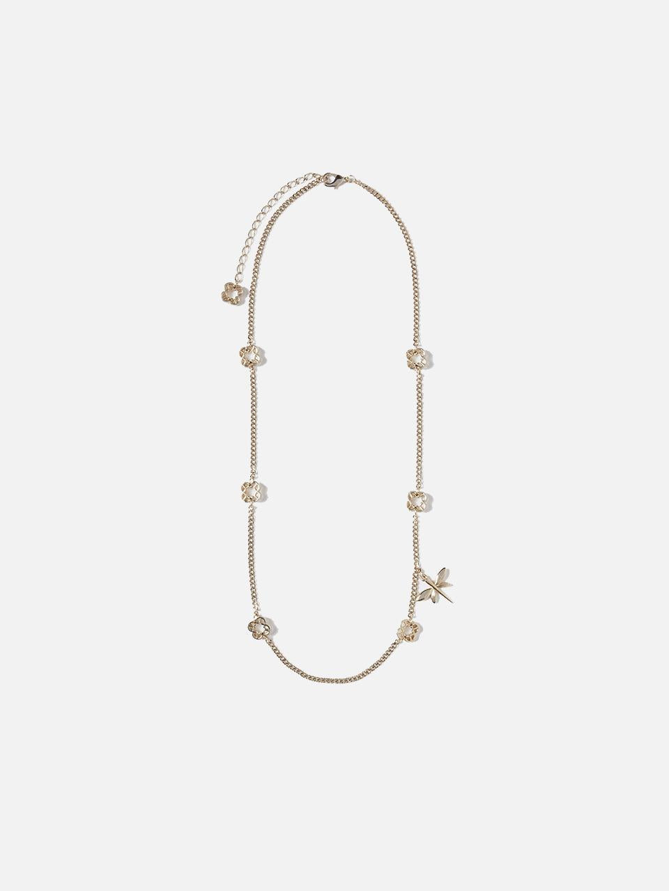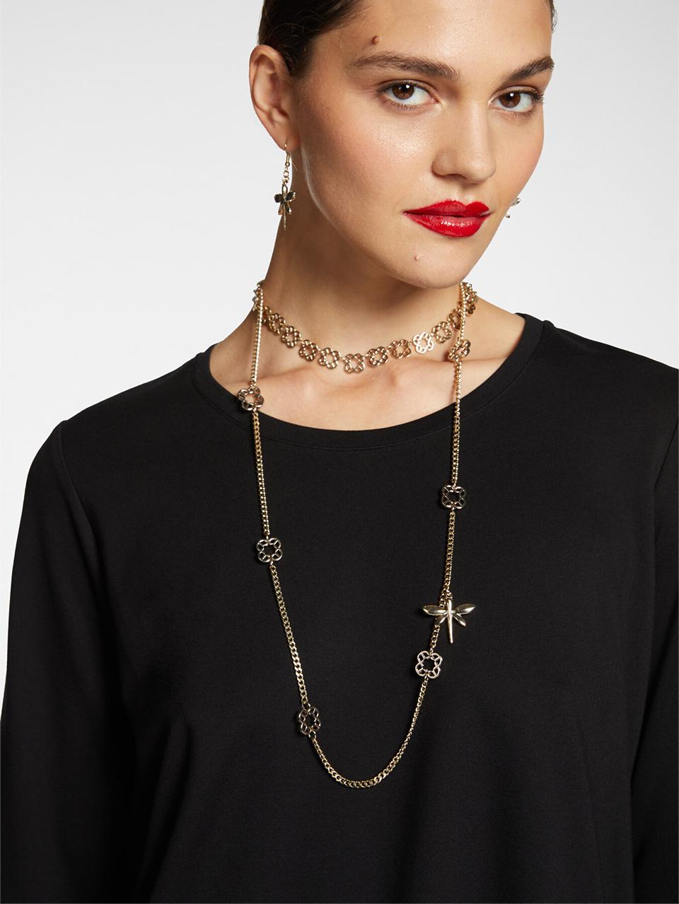 Collana Elena Mirò, lunga con libellula e ciondoli Monogram, impreziosita da simboli raffinati: simbolo distintivo del brand è una delicata libellula, per aggiungere un tocco di eleganza e versatilità ad ogni look, gancio per chiusura e catena per regolazione.